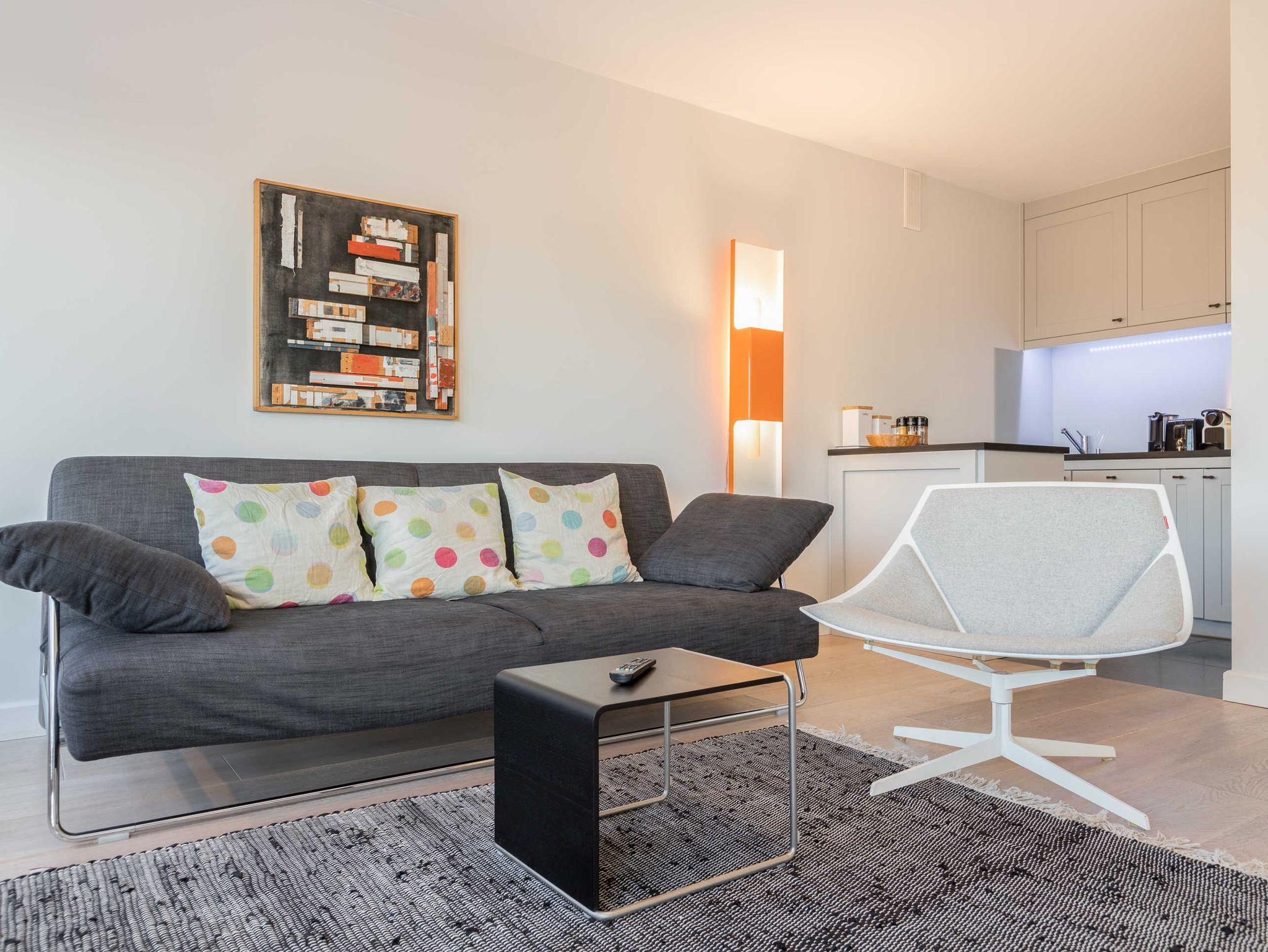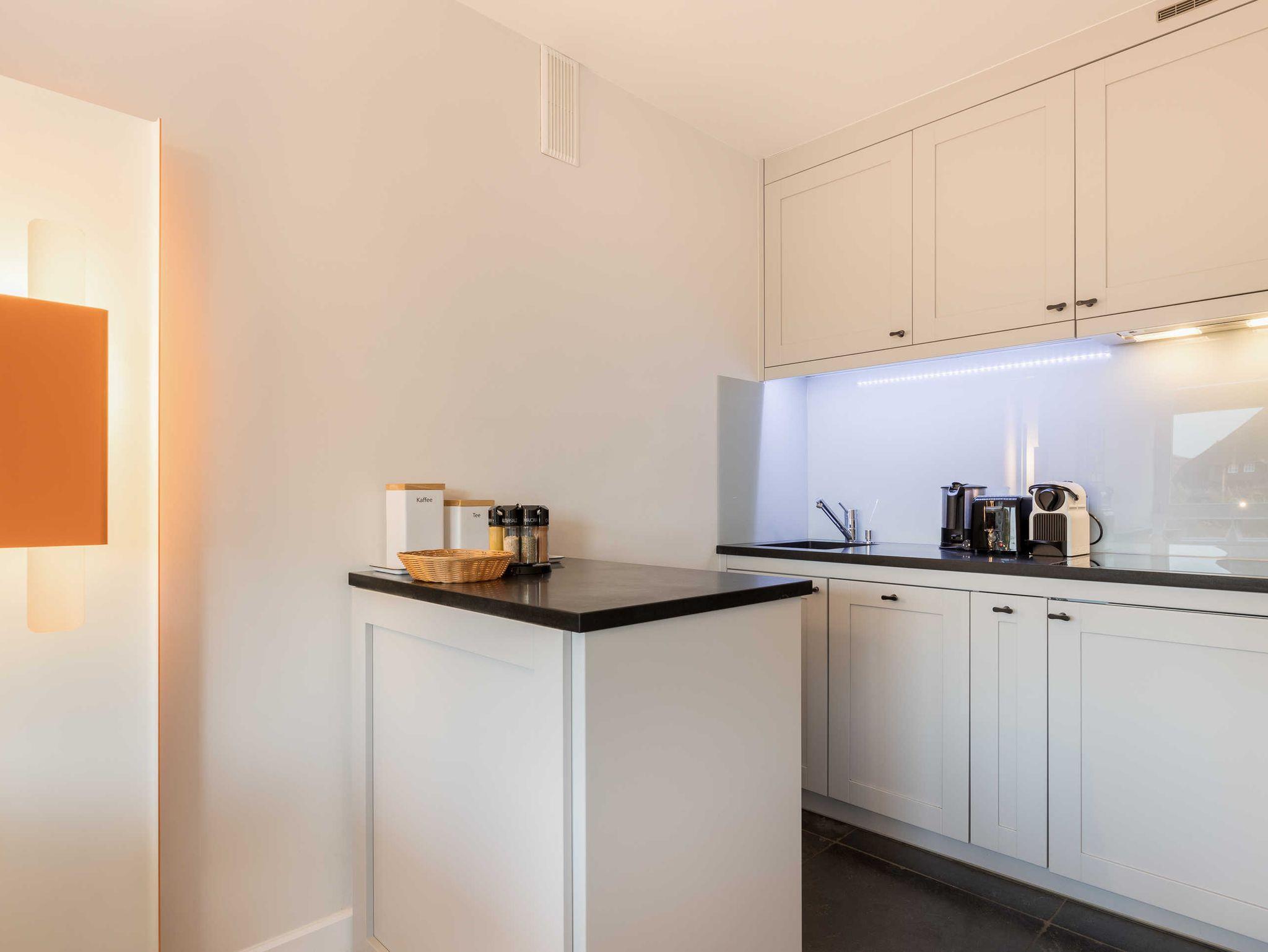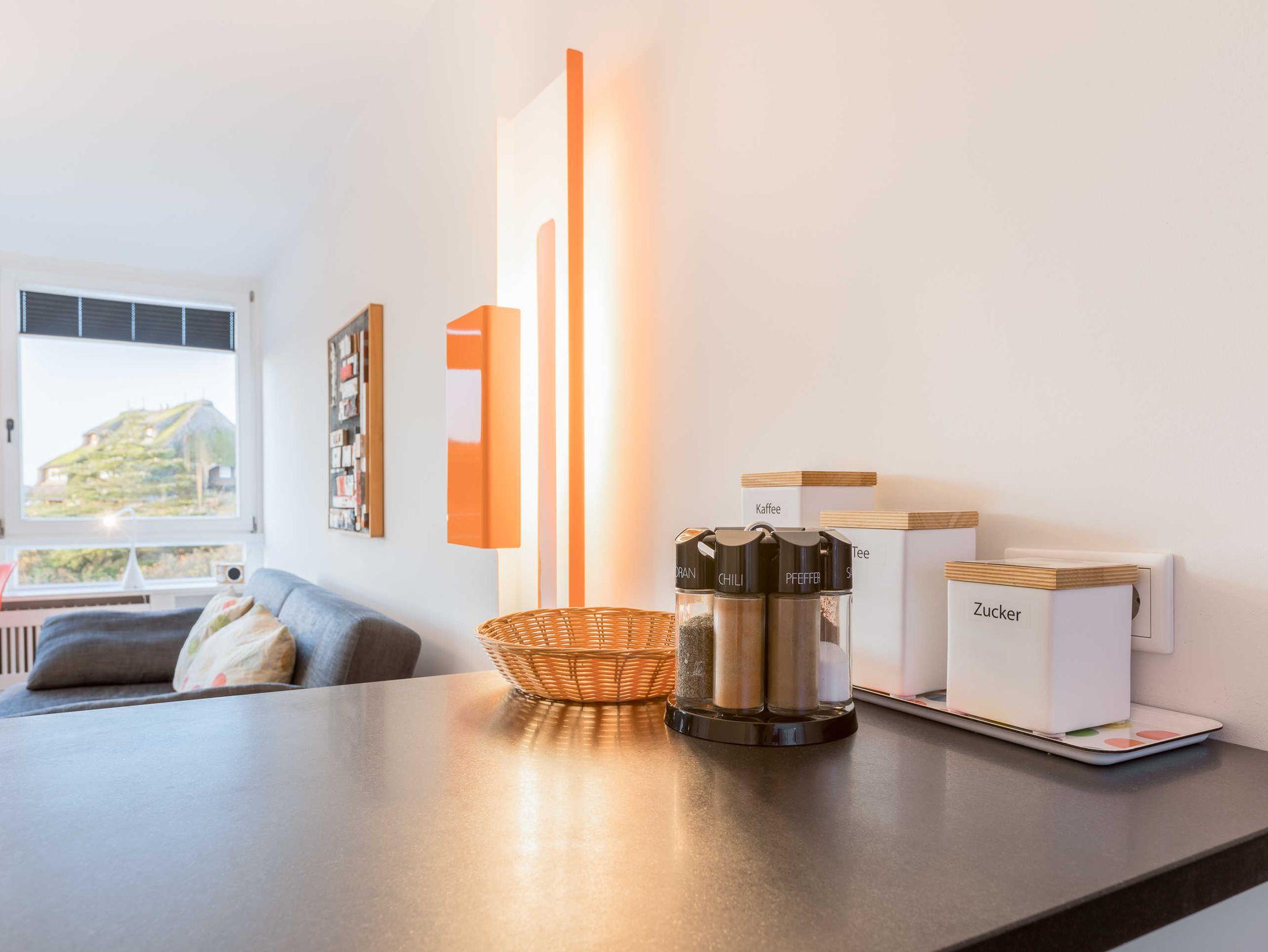 Das Urlaubsdomizil ist modern möbliert und mit ausgesuchten Kunstgegenständen aus Sylter Handwerks-Manufakturen bestückt. Neben dem Wohnraum mit angeschlossener Küche verfügt das Apartment über ein Schlafzimmer mit Doppelbett sowie ein Duschbad mit WC.