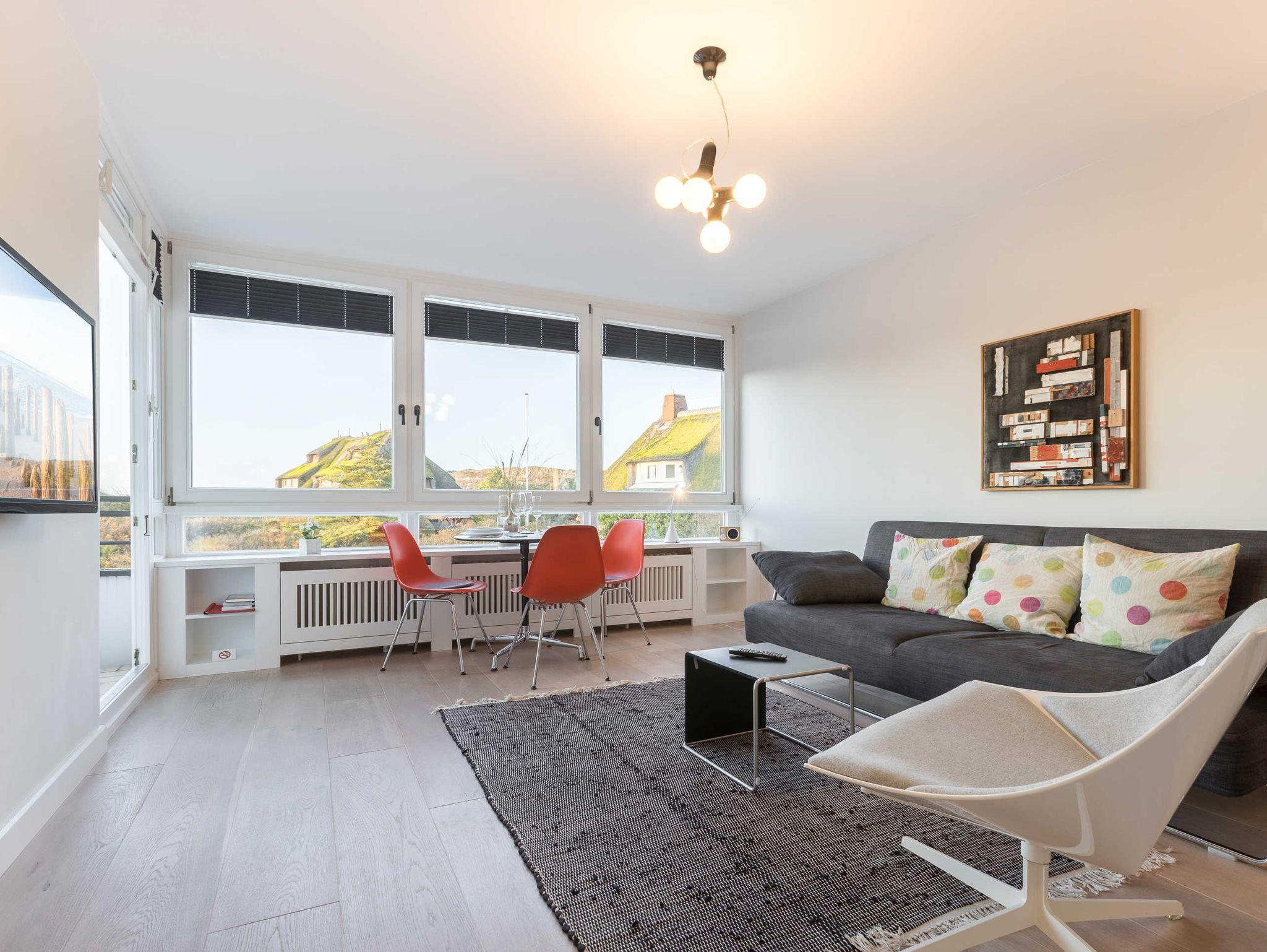 Geniessen Sie den herrlichen Panoramablick in die Lister Dünen mit den für Sylt typischen Reetdachhäusern oder entspannen Sie am Strand oder auf Ihrem Balkon.