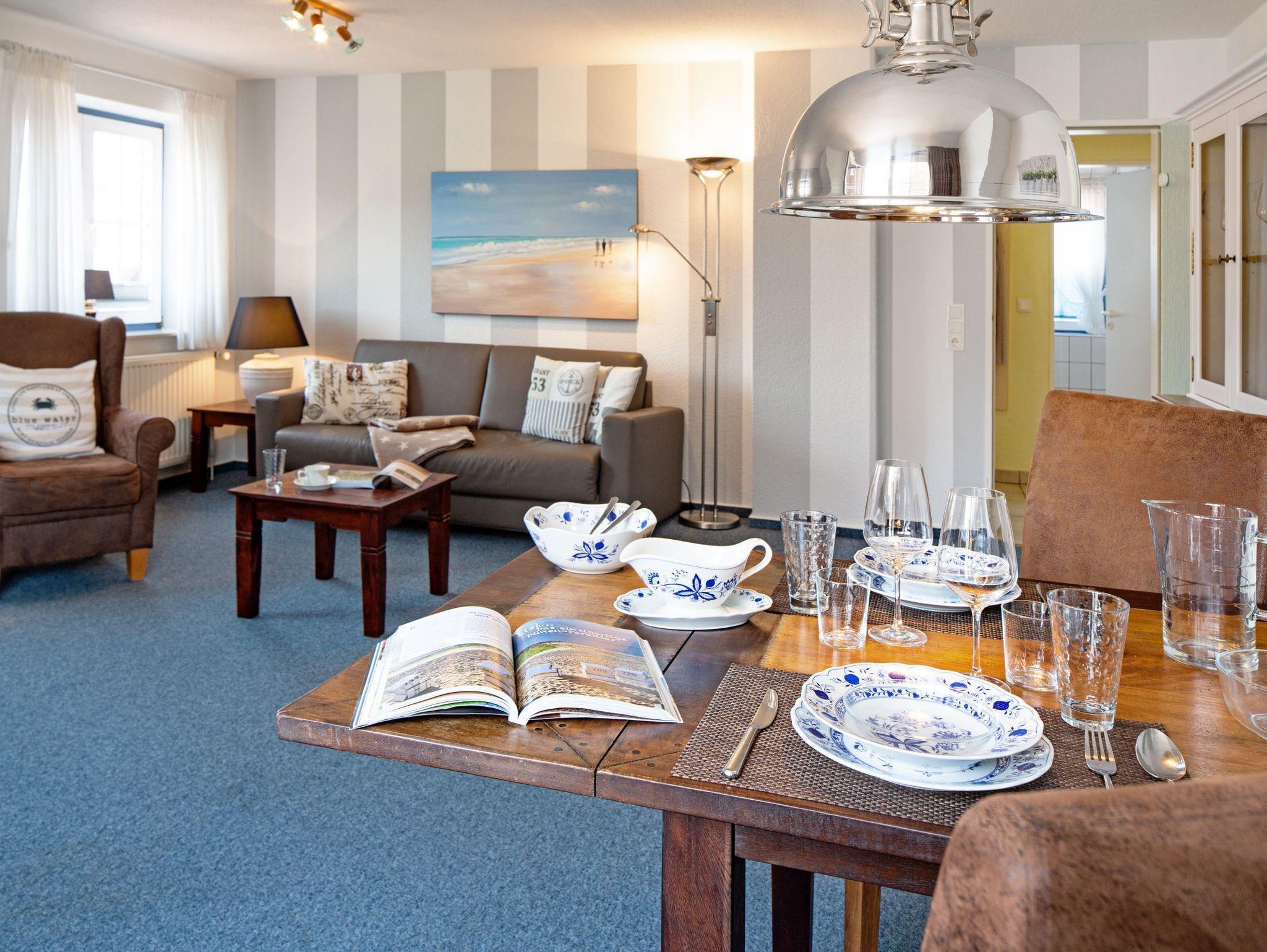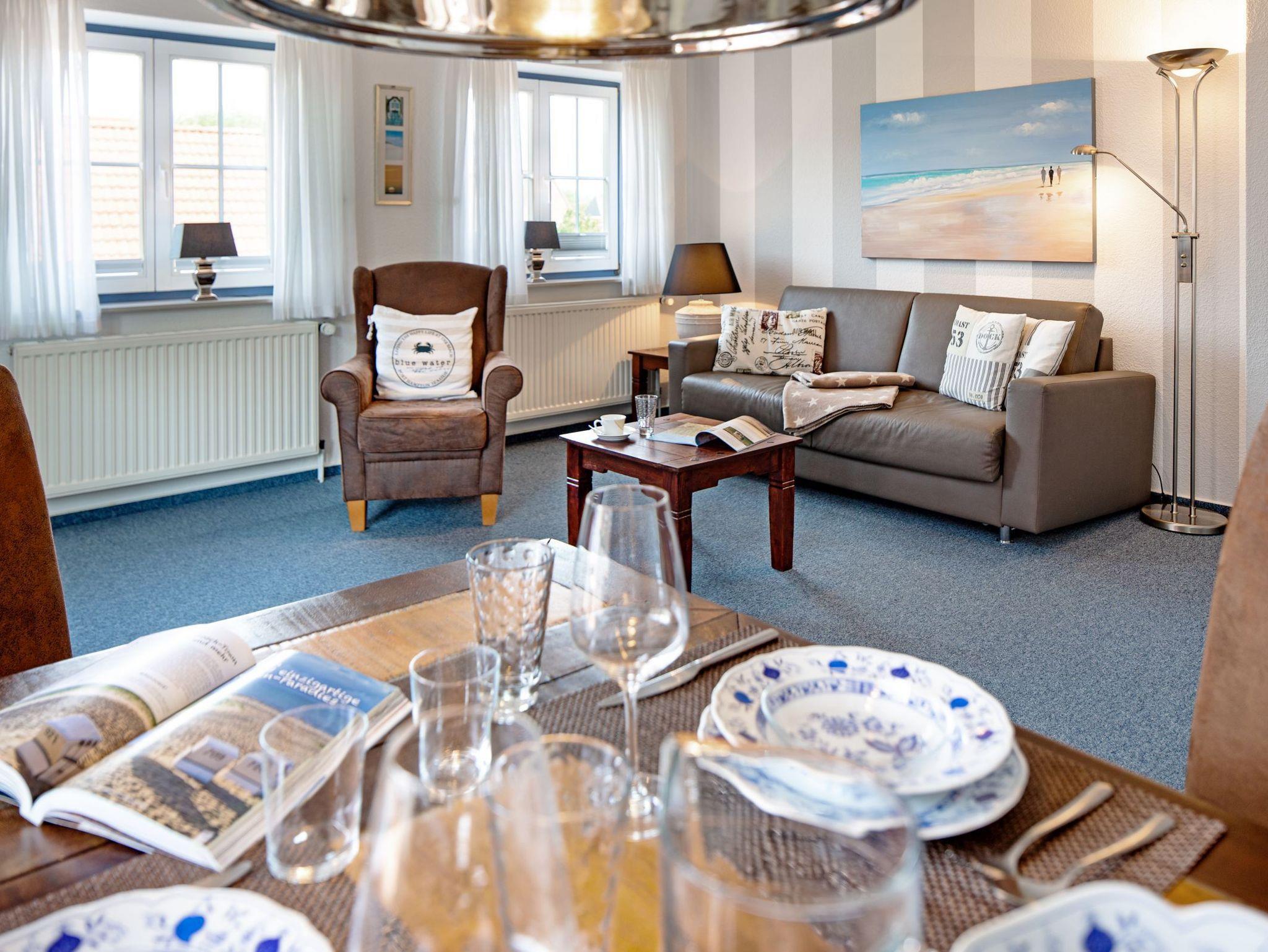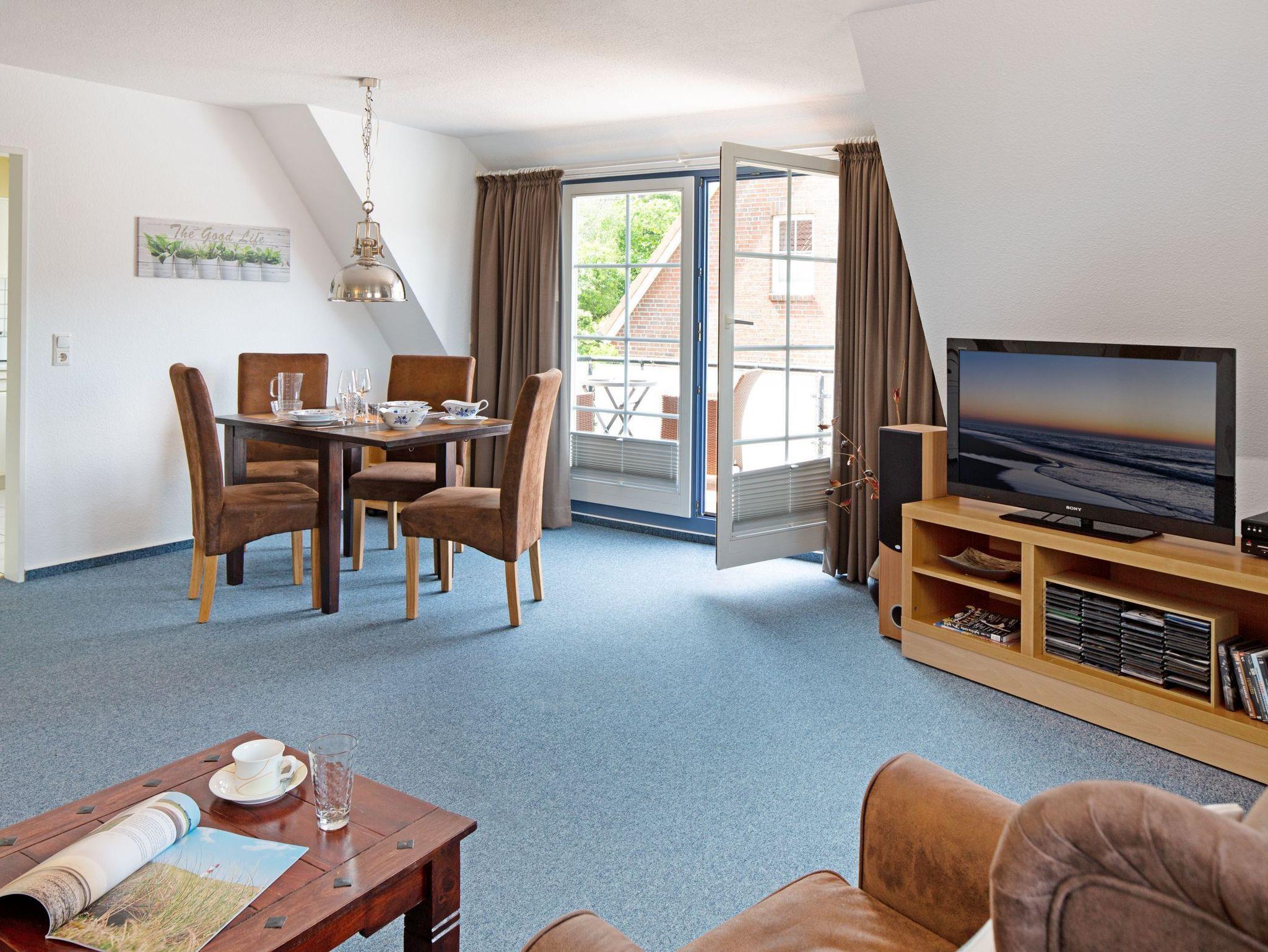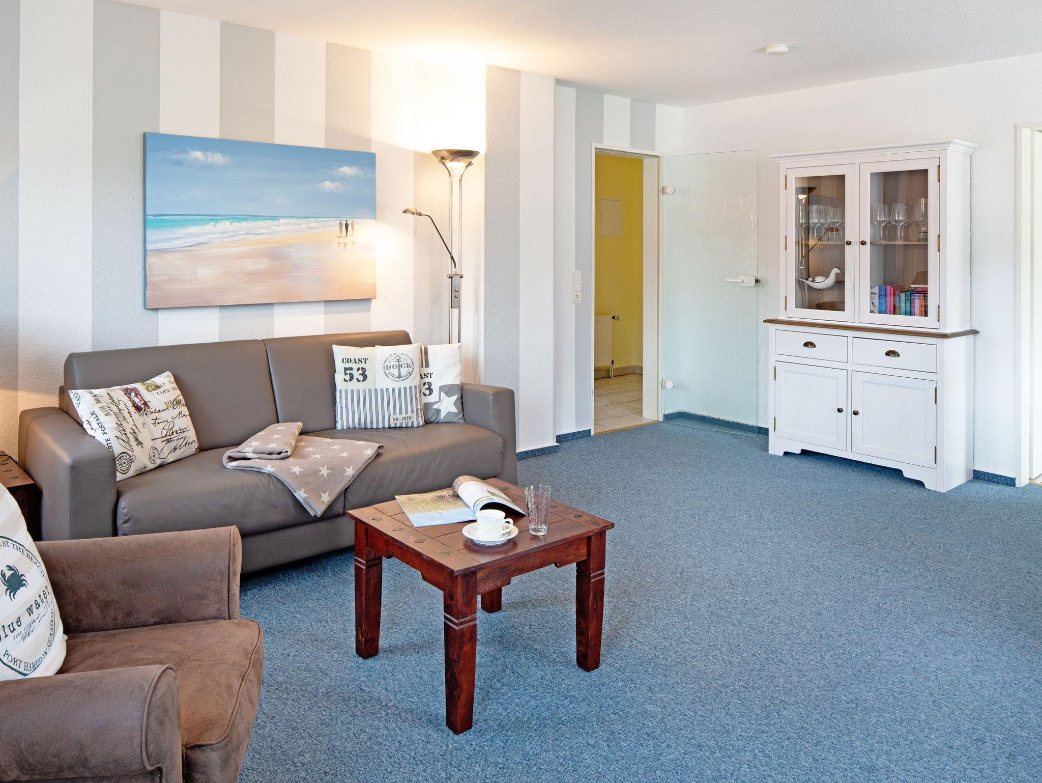 Der gemütliche Wohnbereich lädt mit einer komfortablen Sitzecke und dem Zugang zum großen Balkon zum Entspannen ein. Hier stehen in der Saison bequeme Balkonmöbel und ein Strandkorb bereit der ideale Ort, um den Tag bei einer frischen Nordseebrise ausklingen zu lassen. Das separate Schlafzimmer ist mit einem bequemen Doppelbett ausgestattet und bietet erholsame Nächte. Bei Bedarf ist auch getrenntes Schlafen möglich, da im Wohnzimmer eine hochwertige Schlafcouch zur Verfügung steht.
