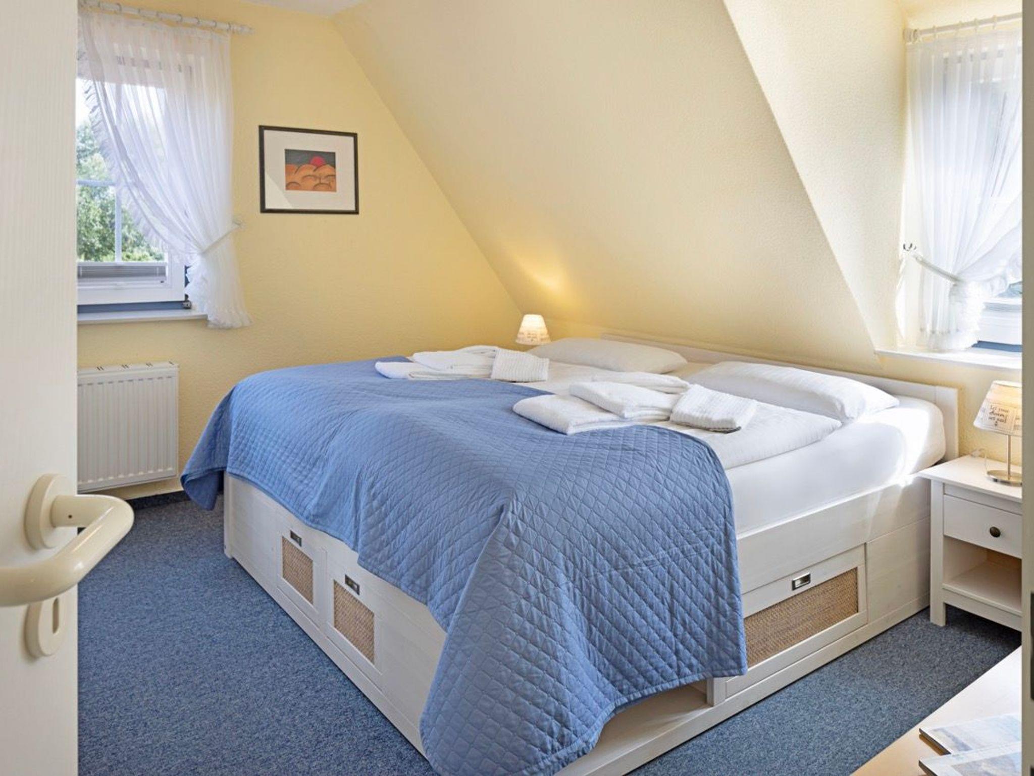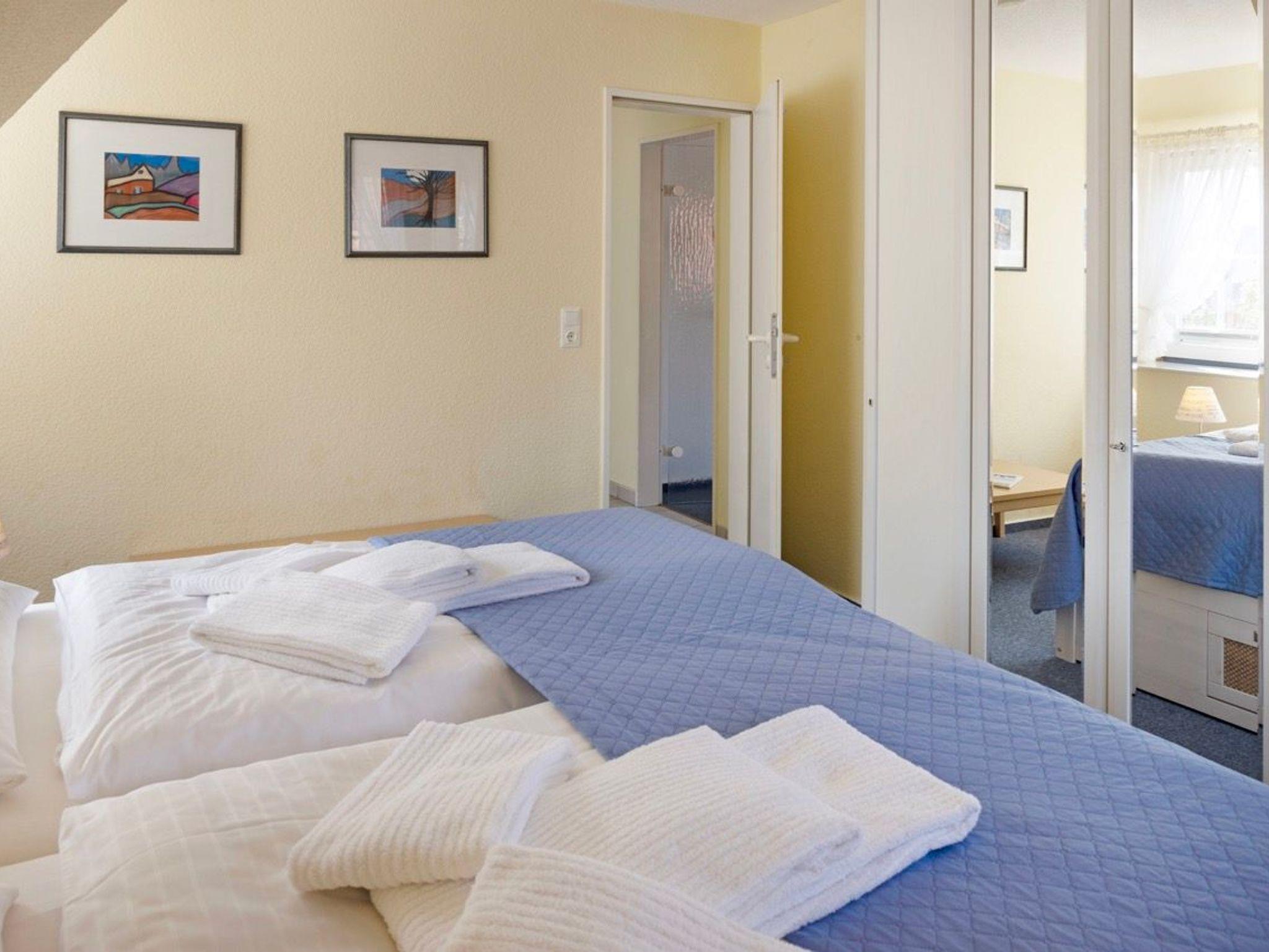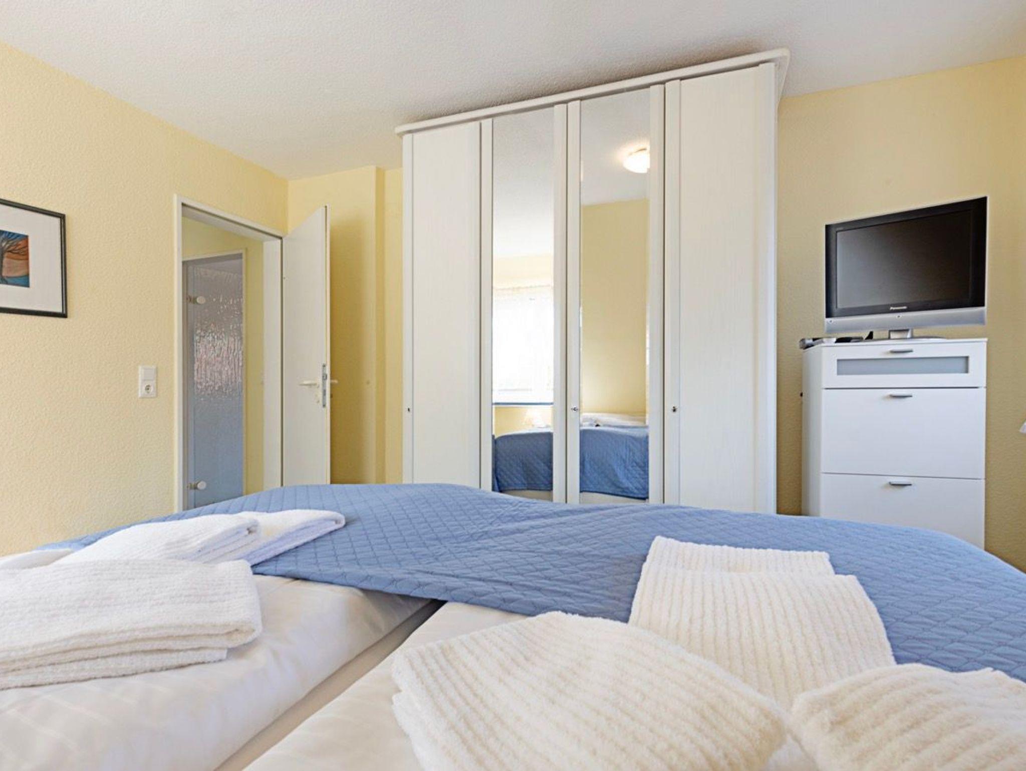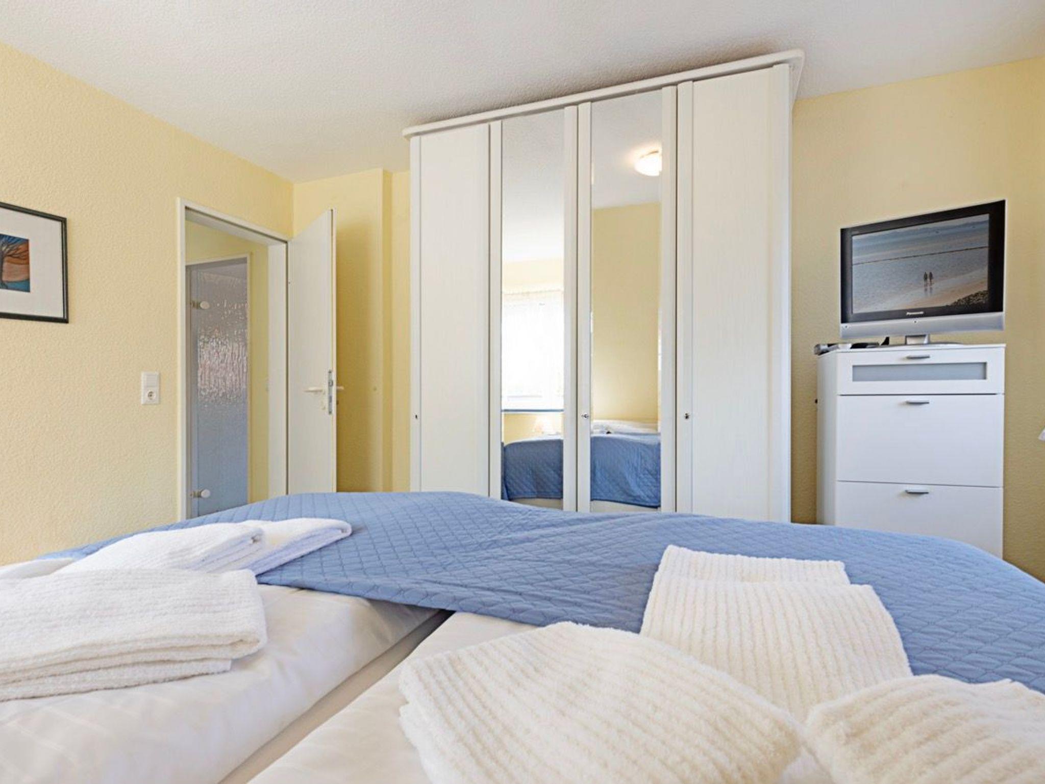 Der gemütliche Wohnbereich lädt mit einer komfortablen Sitzecke und dem Zugang zum großen Balkon zum Entspannen ein. Hier stehen in der Saison bequeme Balkonmöbel und ein Strandkorb bereit der ideale Ort, um den Tag bei einer frischen Nordseebrise ausklingen zu lassen. Das separate Schlafzimmer ist mit einem bequemen Doppelbett ausgestattet und bietet erholsame Nächte. Bei Bedarf ist auch getrenntes Schlafen möglich, da im Wohnzimmer eine hochwertige Schlafcouch zur Verfügung steht.