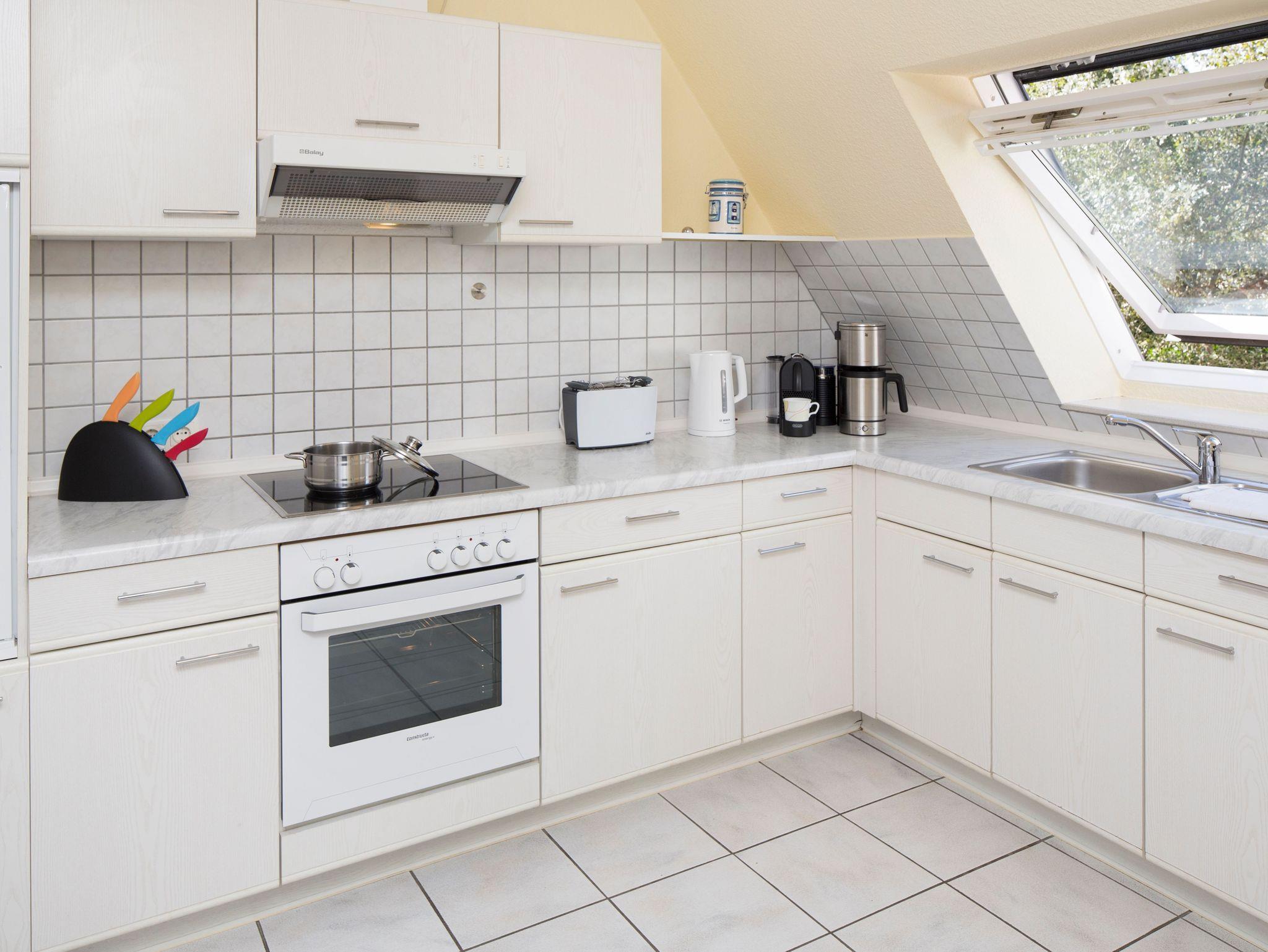 Die separate Küche ist vollständig eingerichtet und bietet alles, was man für die Zubereitung von kleinen oder großen Mahlzeiten benötigt. Ein modernes Duschbad rundet das wohnliche Ambiente ab.