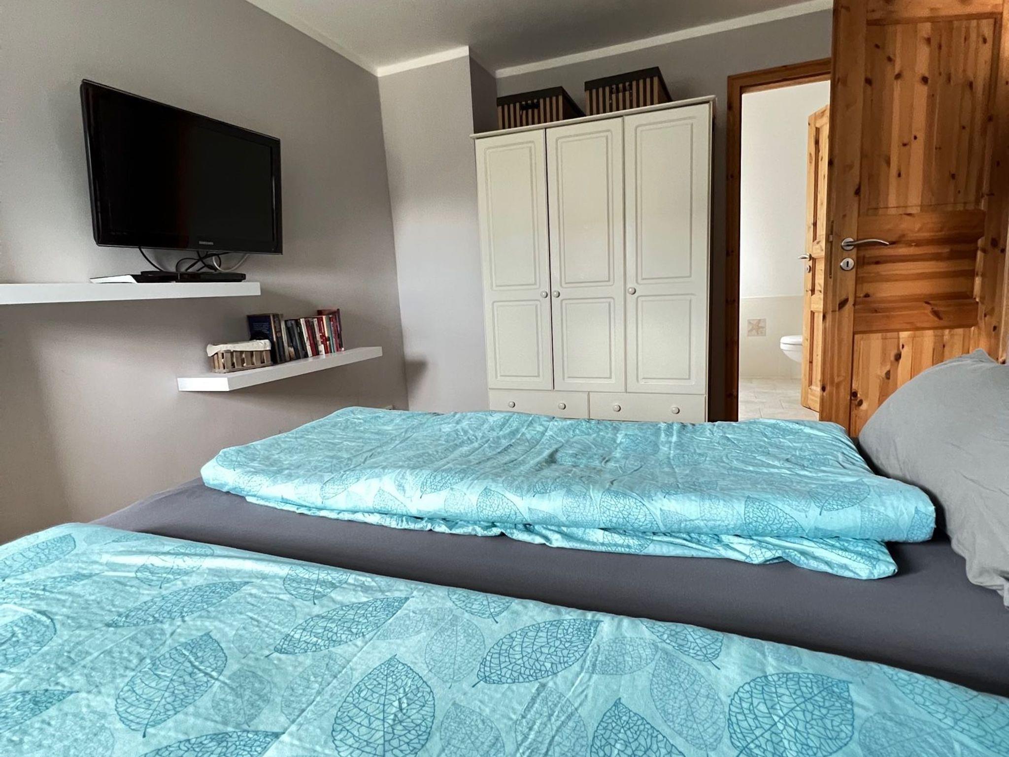 Doppelbett sowie ein Duschbad mit WC. Die Dachschrägen und der Holzdielenboden verleihen der Unterkunft