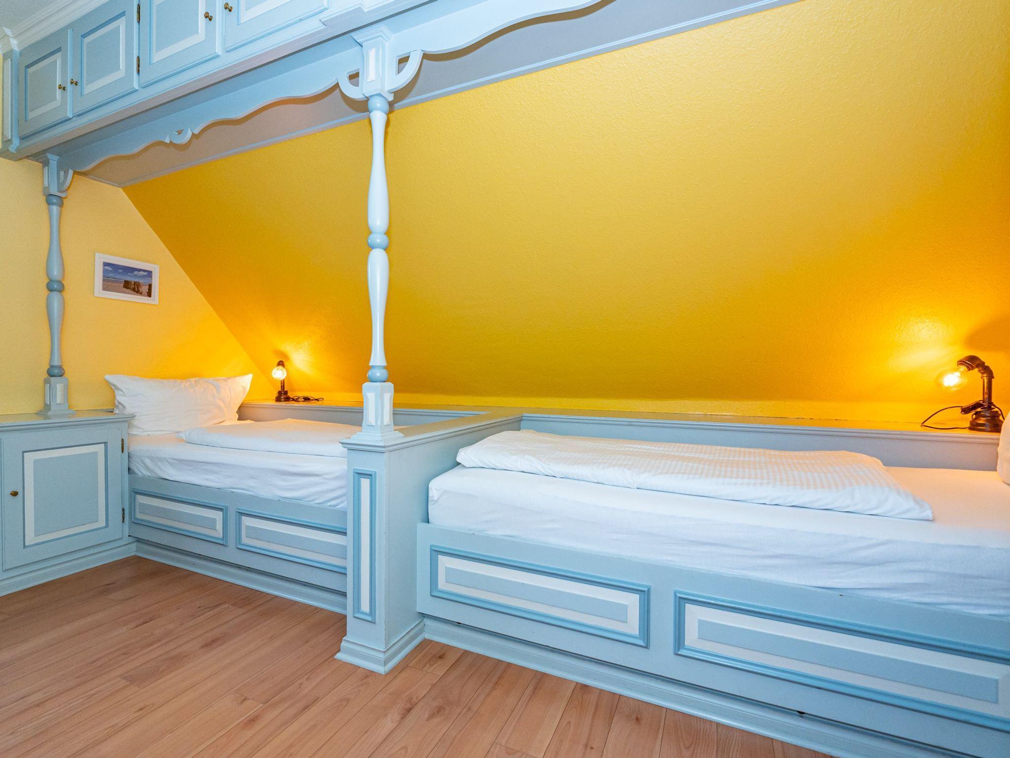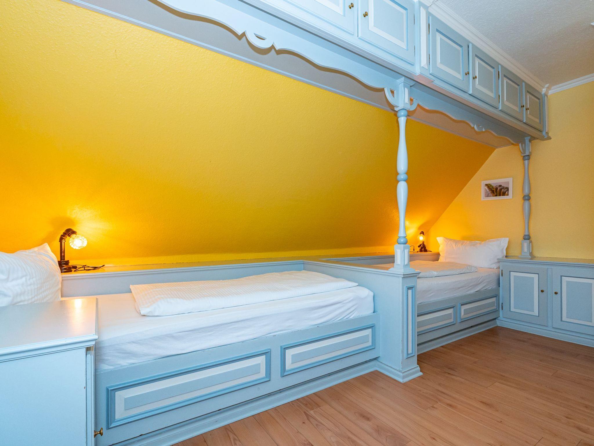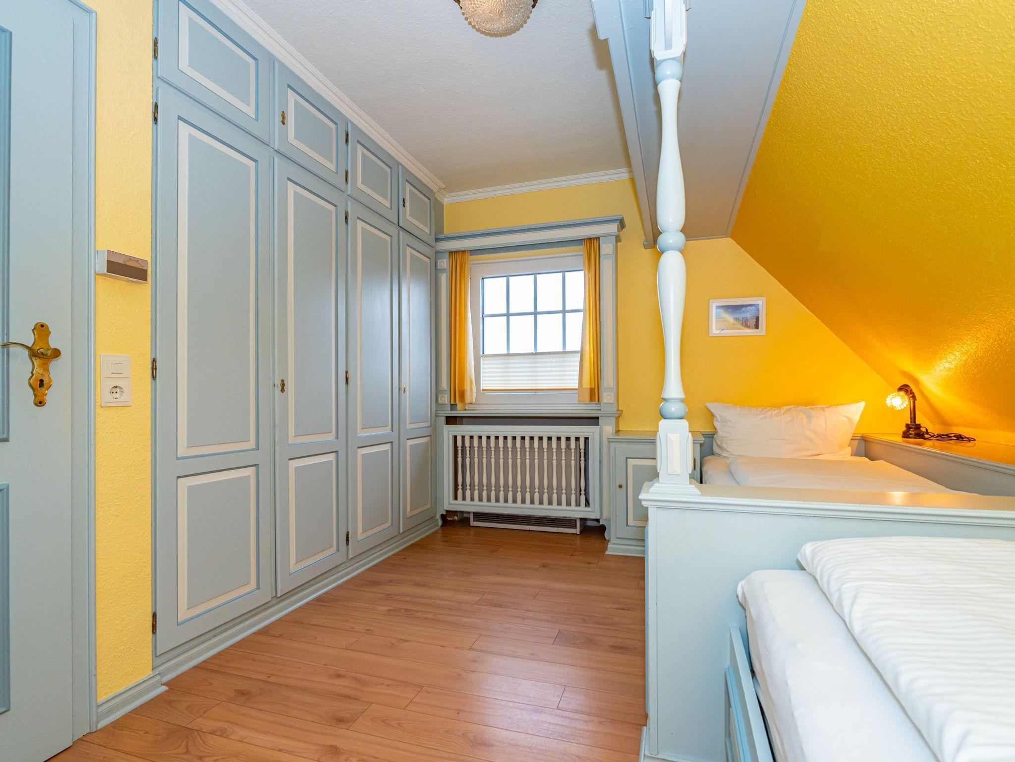Im 1. Obergeschoss befindet sich das vierte Apartment. Der Wohn- und Essbereich mit 2 Schlafkojen sowie das separate Schlafzimmer mit 2 Schlafkojen bieten auf insgesamt 50 Quadratmeter Platz für 4 Personen. Das Badezimmer ist ausgestattet mit Dusche, WC und Waschbecken.