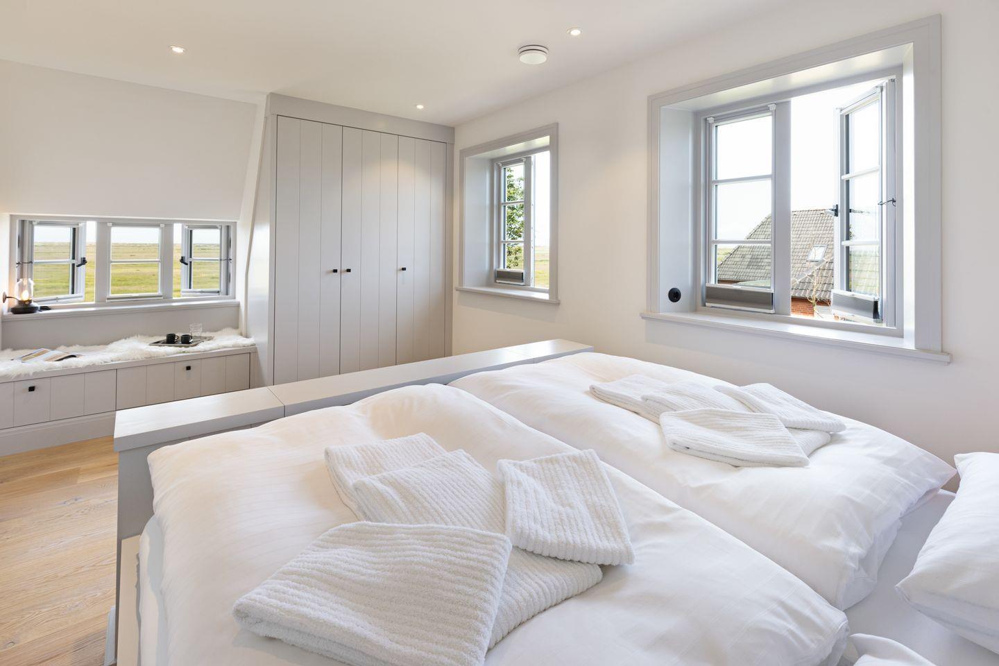 Im ersten Stock des Hauses finden sie zwei Schlafzimmer mit Doppelbett und Fernseher (unverbauter Blick auf die Fenne).