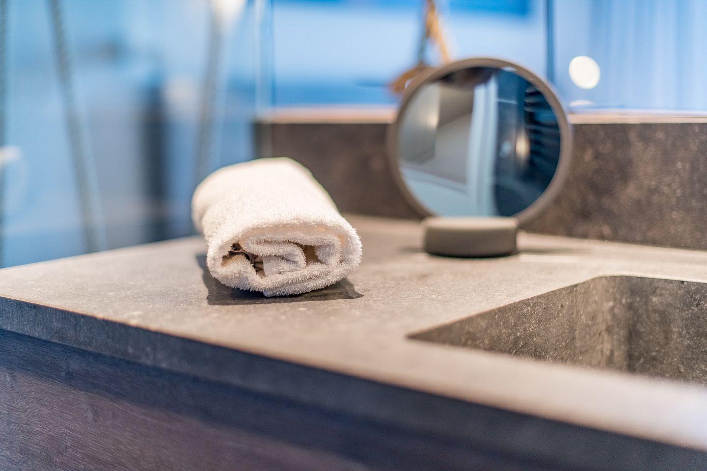 DG: ein Raum mit Doppelbett (1,80 x 2,00 m) und TV, eigener Balkon, offenes Duschbad mit separatem WC, Saunabereich mit Balkon.