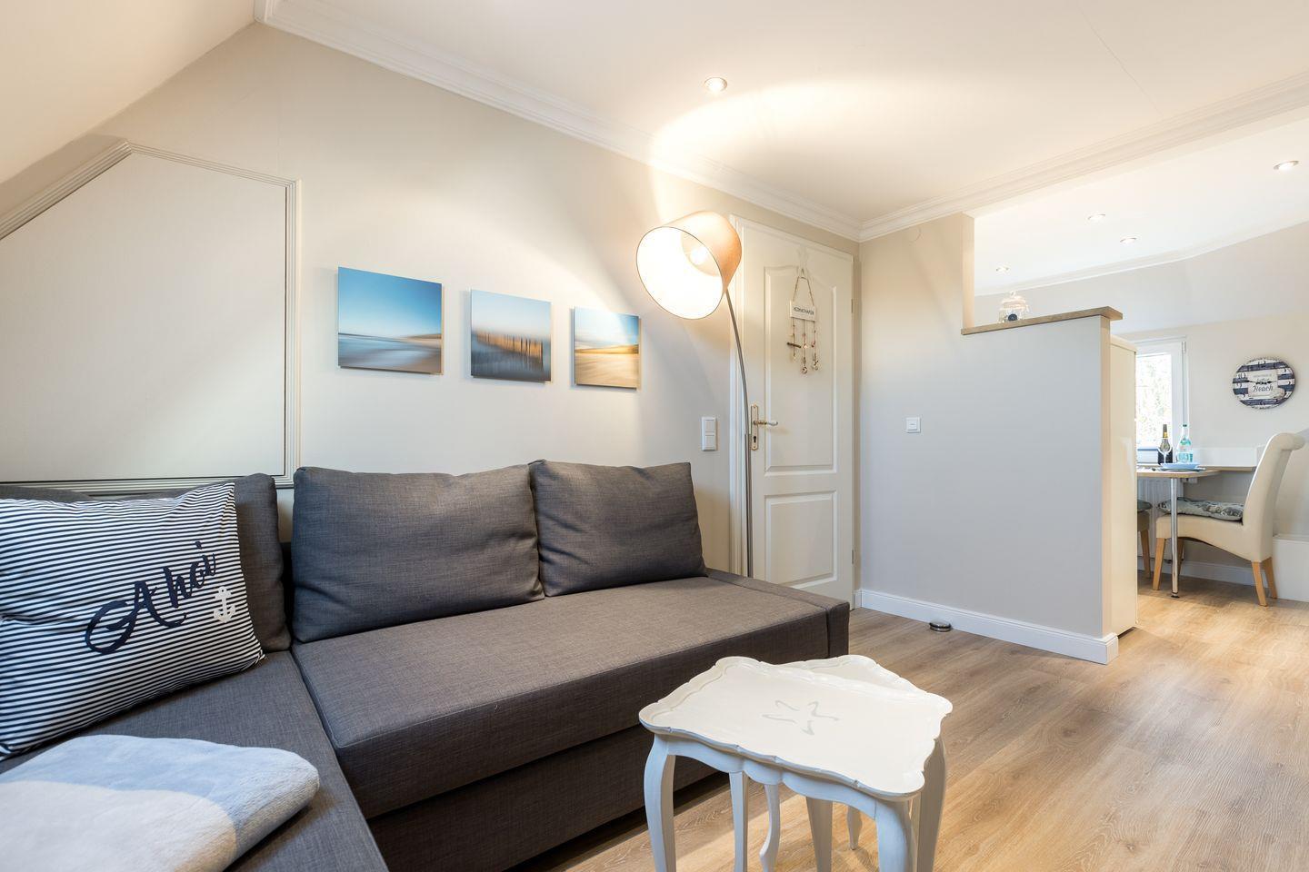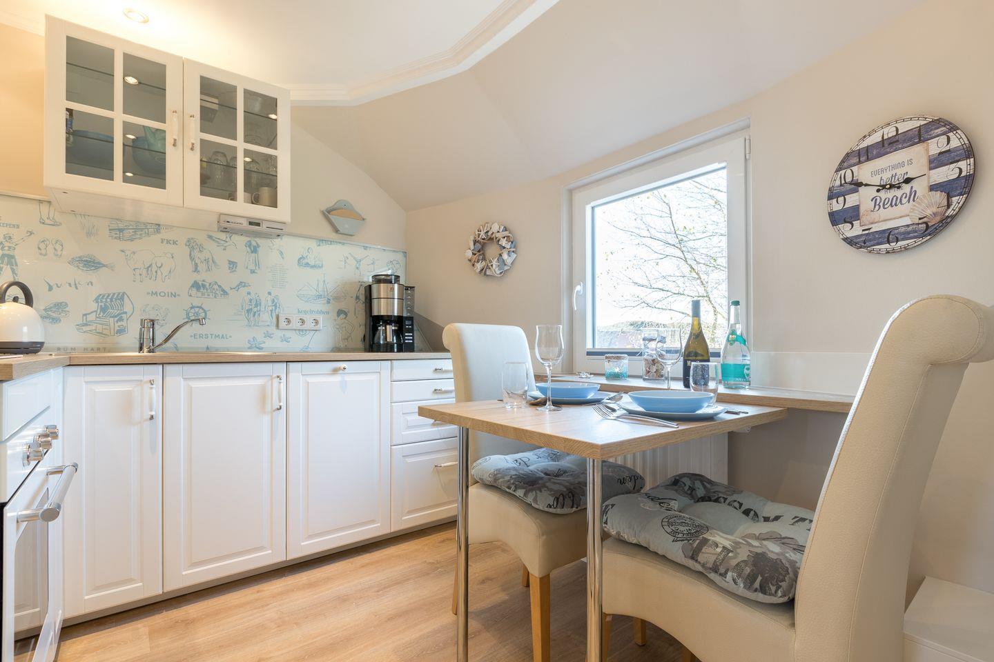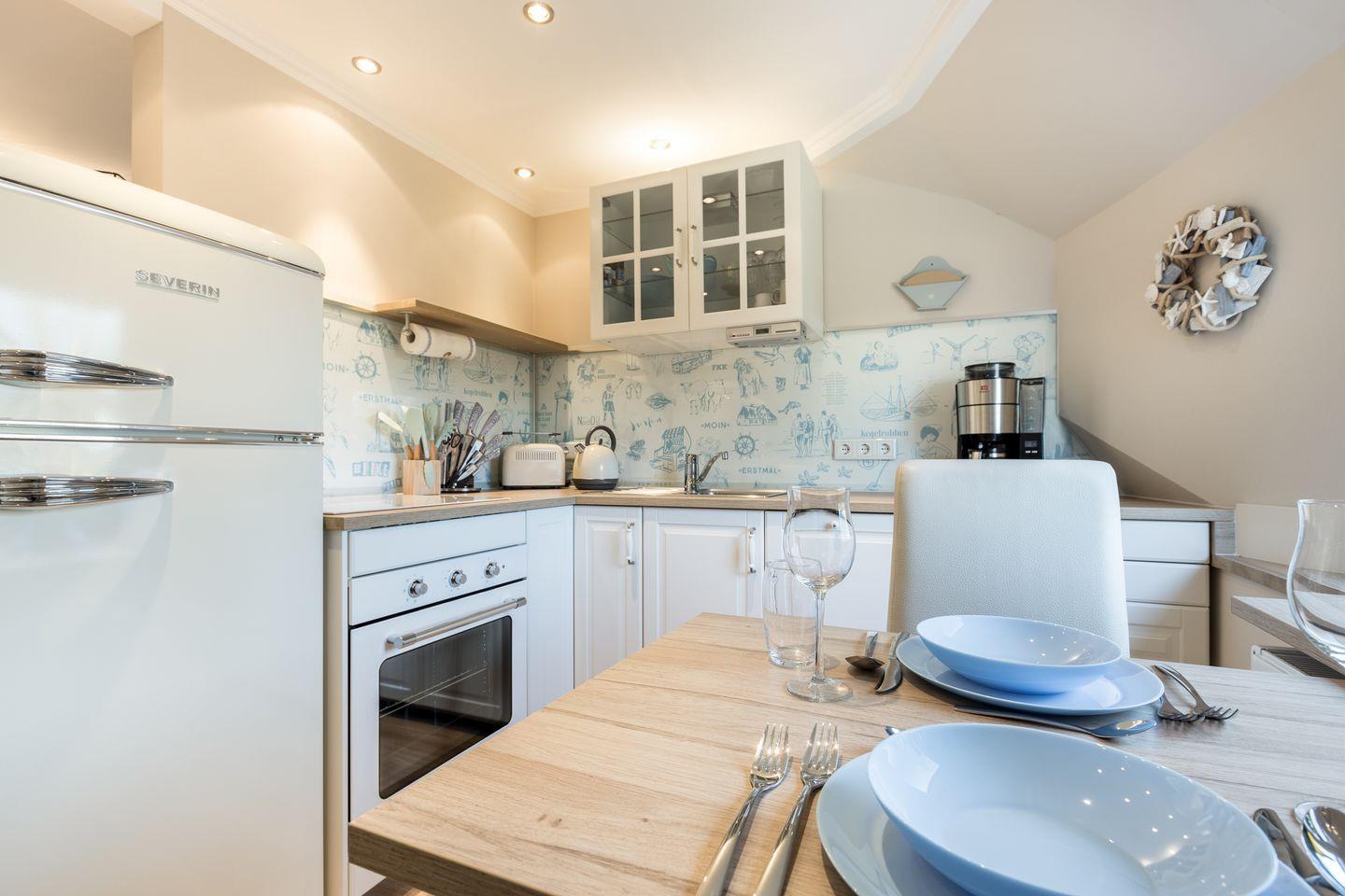 Das Appartement Lister Huk wurde 2019 komplett für Sie renoviert. Wenn Sie die Ferienwohnung betreten, erwartet Sie ein gemütlicher Wohnbereich mit Sofa und Flatscreen-TV. Eine moderne, offene Küche lädt zum gemeinsamen Kochen und Genießen ein. Ihr Morgenkaffee wird Ihnen von Ihrer Filterkaffeemaschine frisch gemahlen zubereitet und das sogar für einzelne Tassen - ganz ohne Plastik- und Aluminiumkapseln.