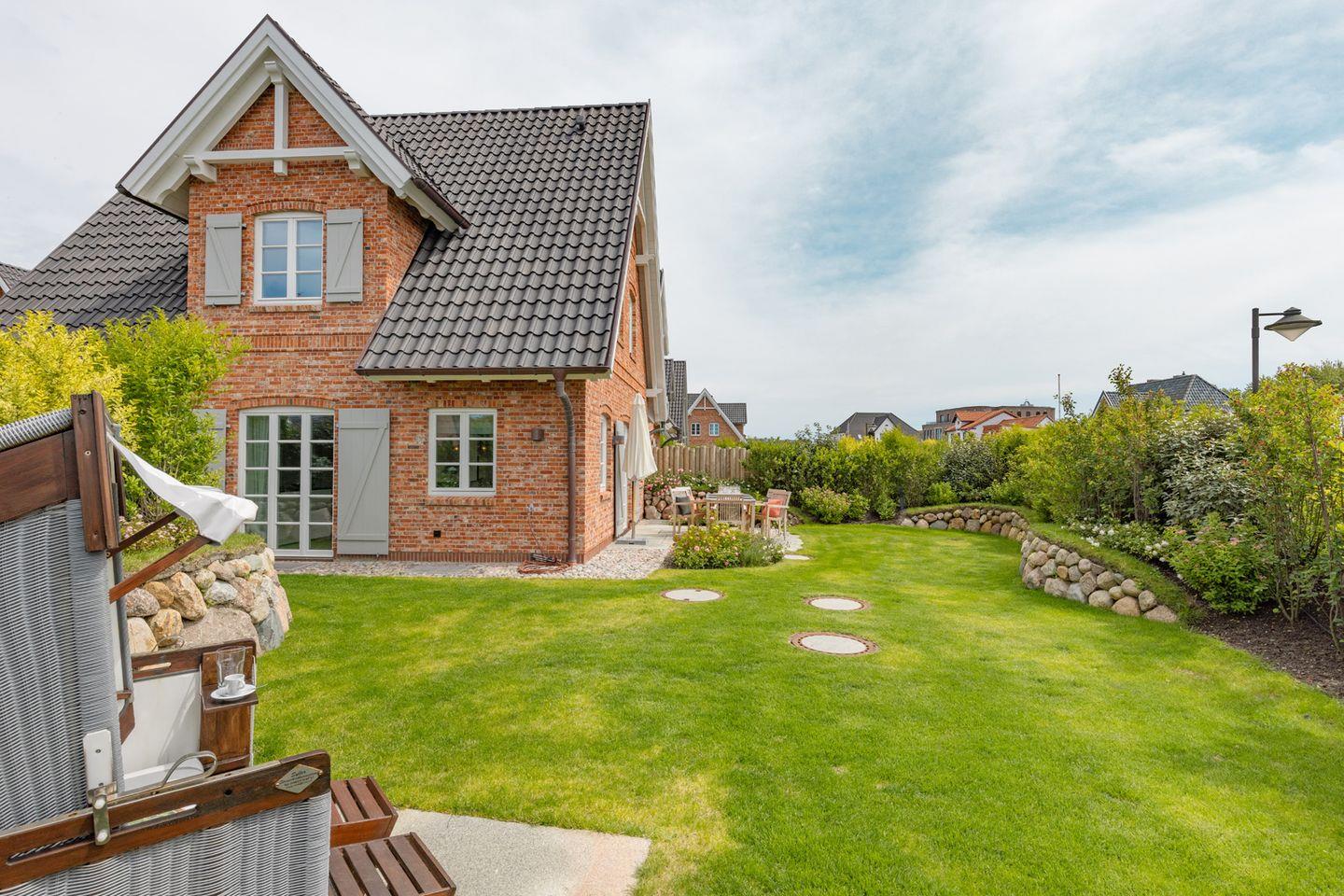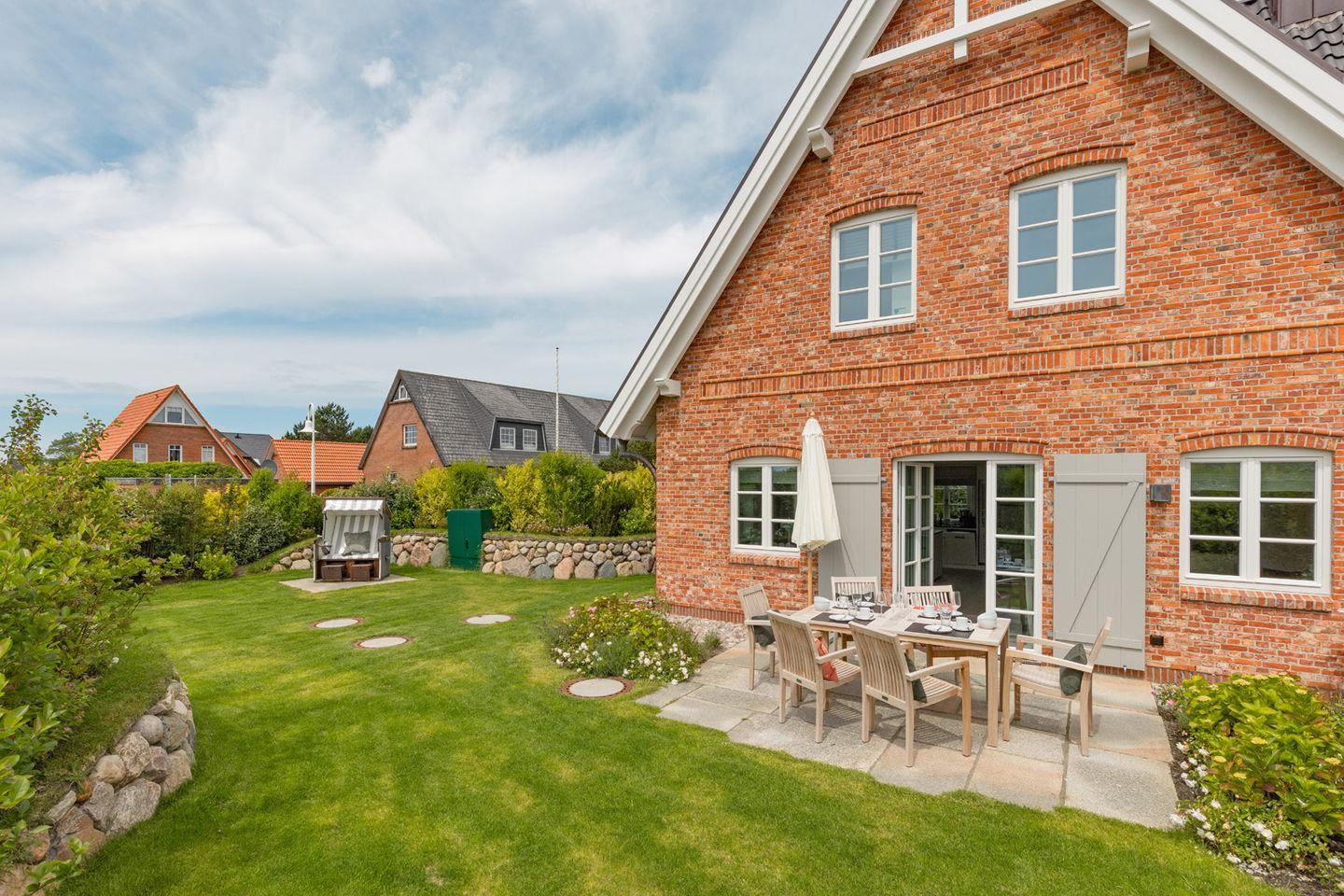 Zum Haus gehört ein großer Garten mit Terrasse und Gartenmöbeln.