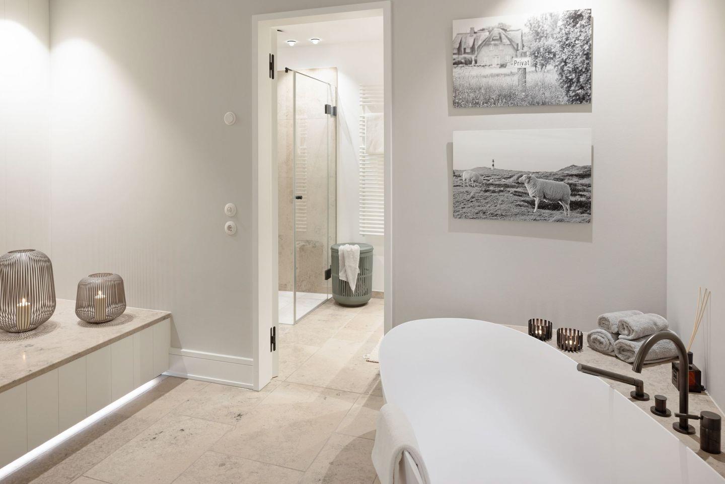 Der große Wellnessbereich mit Sauna, freistehender Badewanne und Sitzecke bietet Ihnen viele Möglichkeiten zum entspannen.