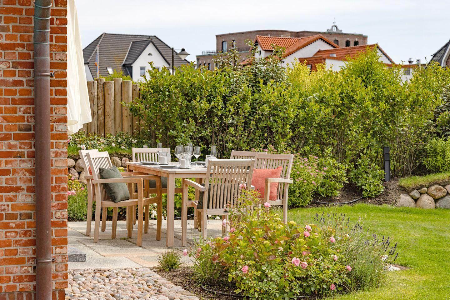 Gartenmöbel und ein Strandkorb stehen Ihnen saisonal begrenzt zur Verfügung.