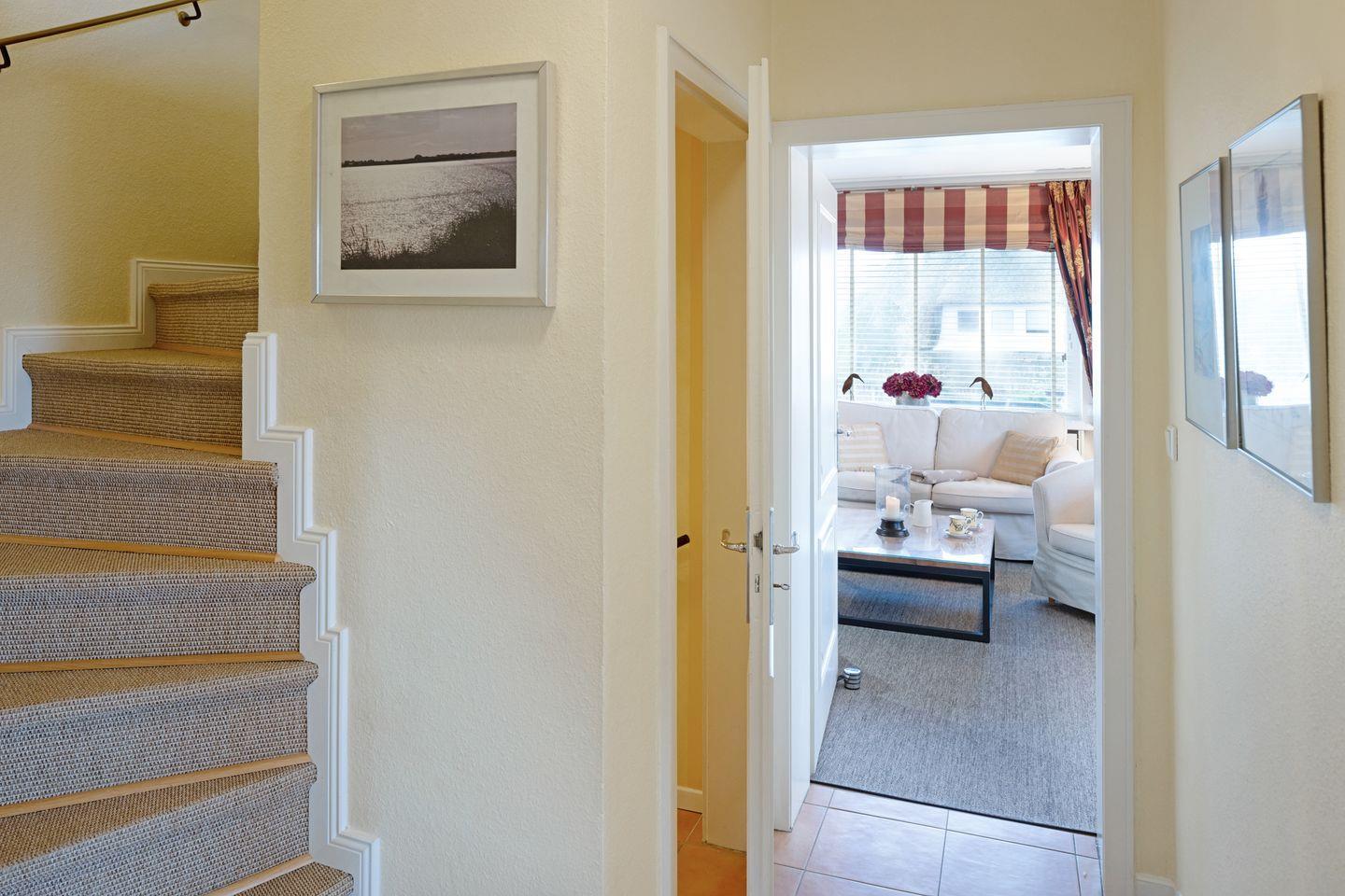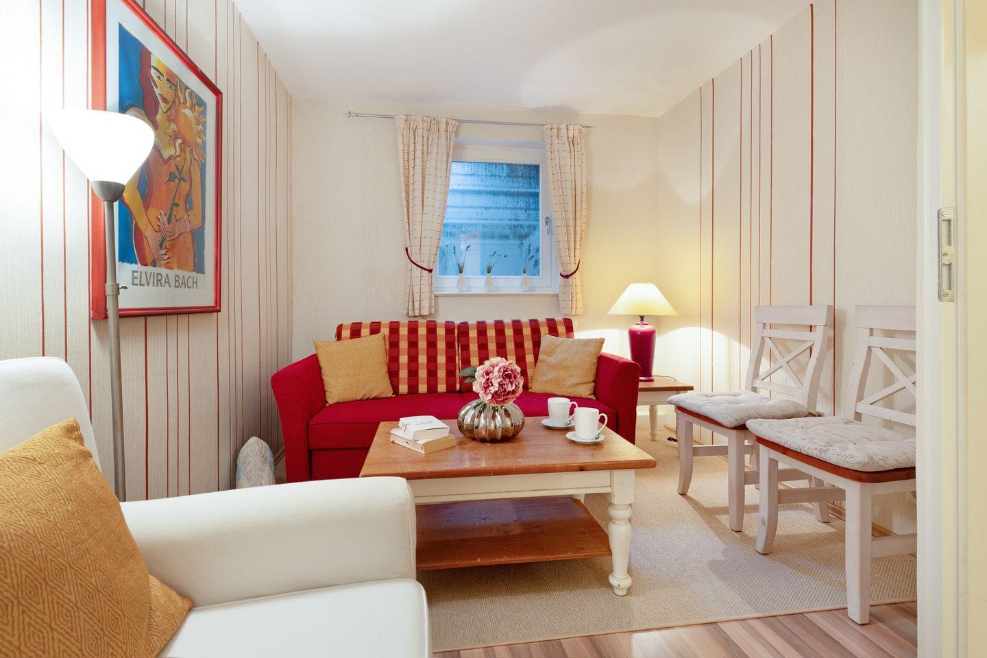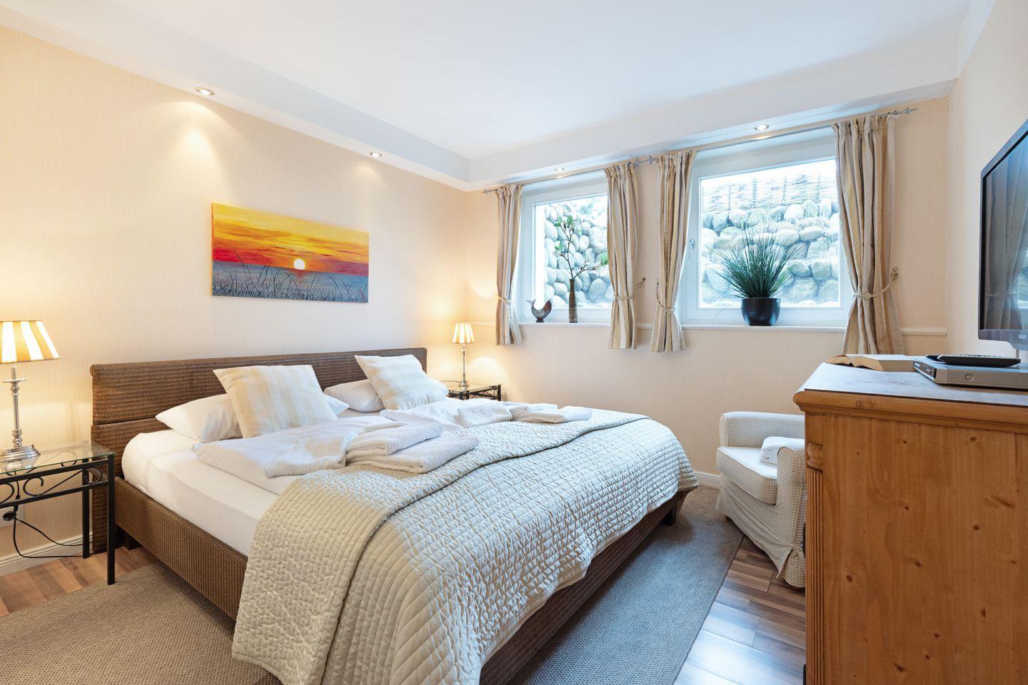 Ihr Feriendomizil verfügt über hochwertige Einrichtung und Ausstattung, Terracotta Fliesen, großes Wohn/Esszimmer, offene Landhausküche mit hochwertiger Küchentechnik, Kaminofen, Schlafplätze für 4 Personen, 1 Vollbad, 2 Duschbäder, Sauna, Gäste-WC, 3 Sat- LCD- TV, DVD, W-LAN/Glasfaseranschluss, große möblierte Terrasse mit Südausrichtung, 2 Strandkörbe, 2 Parkplätze.