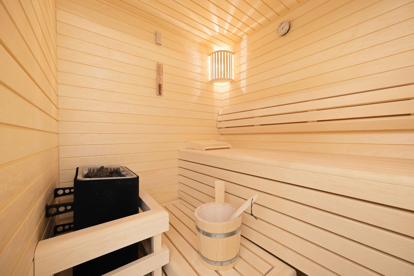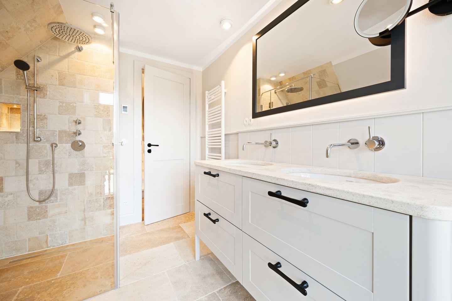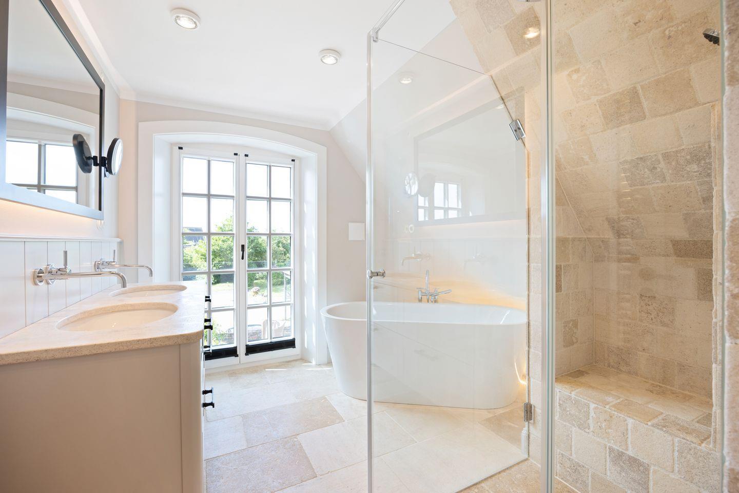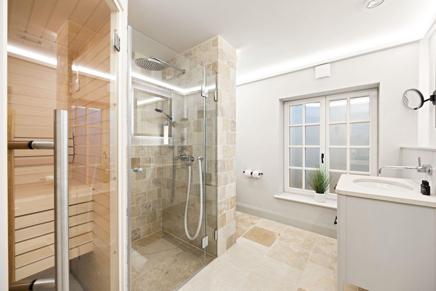 Das Haus verfügt über zwei moderne Badezimmer. Das erste Badezimmer ist mit einer bodengleichen Dusche, Tageslicht und einem Föhn ausgestattet. Das zweite, luxuriöse Wellnessbad bietet eine freistehende Badewanne, eine bodengleiche Dusche und eine Sauna – perfekt für erholsame Momente nach einem langen Tag auf der Insel. Ein zusätzliches Gäste-WC im Erdgeschoss sorgt für weiteren Komfort.