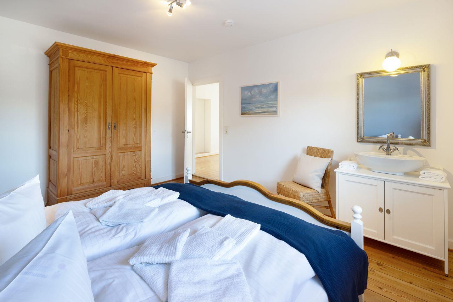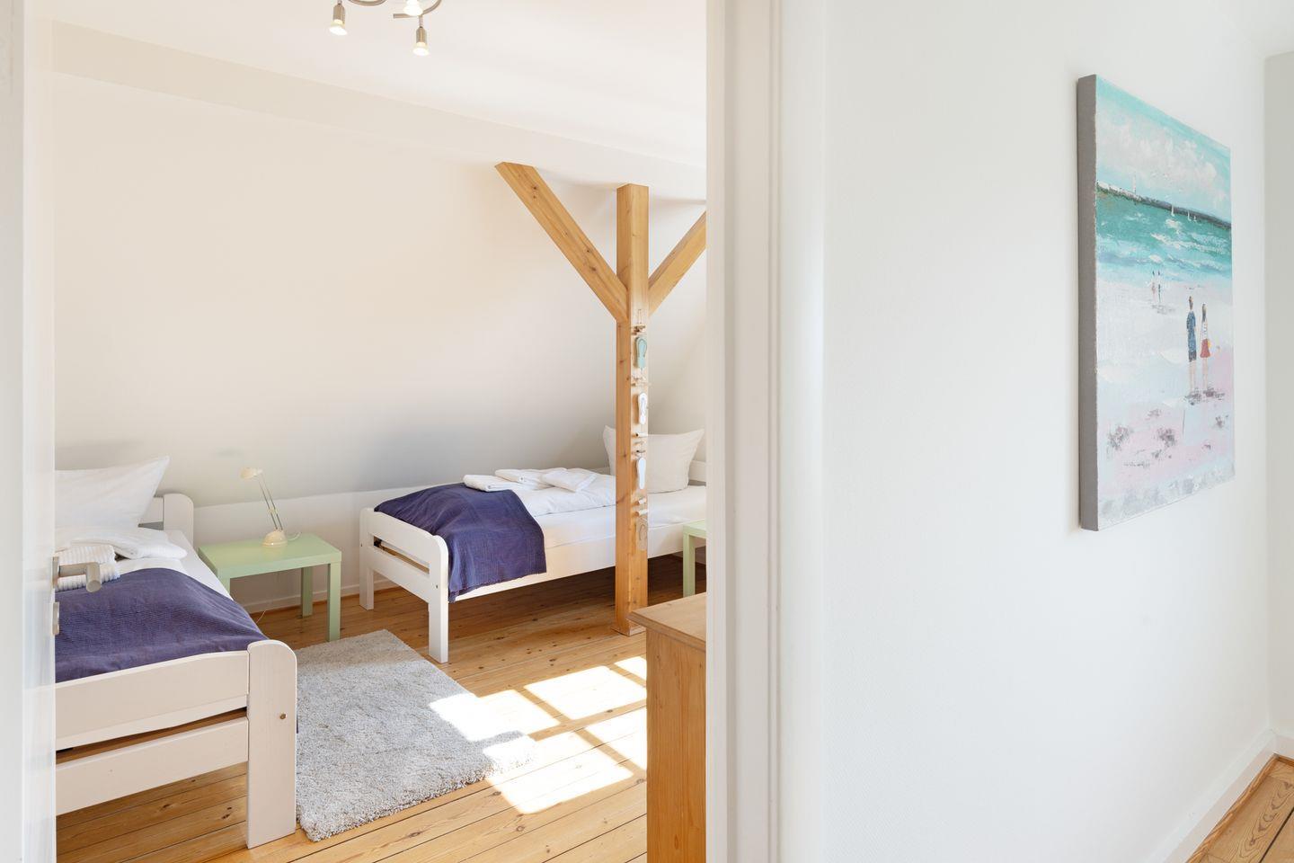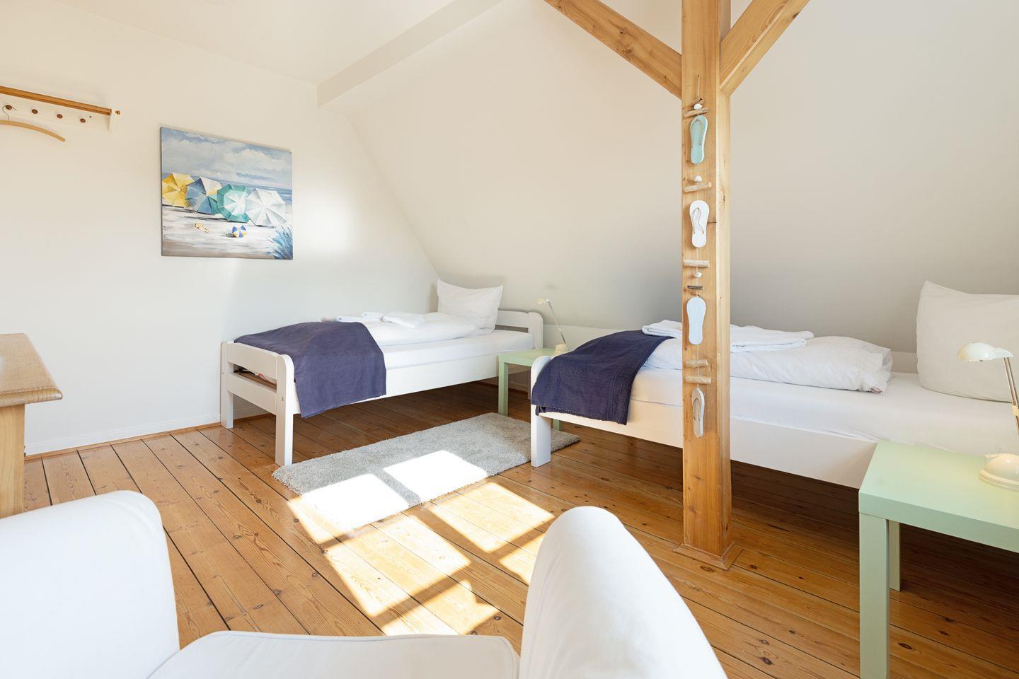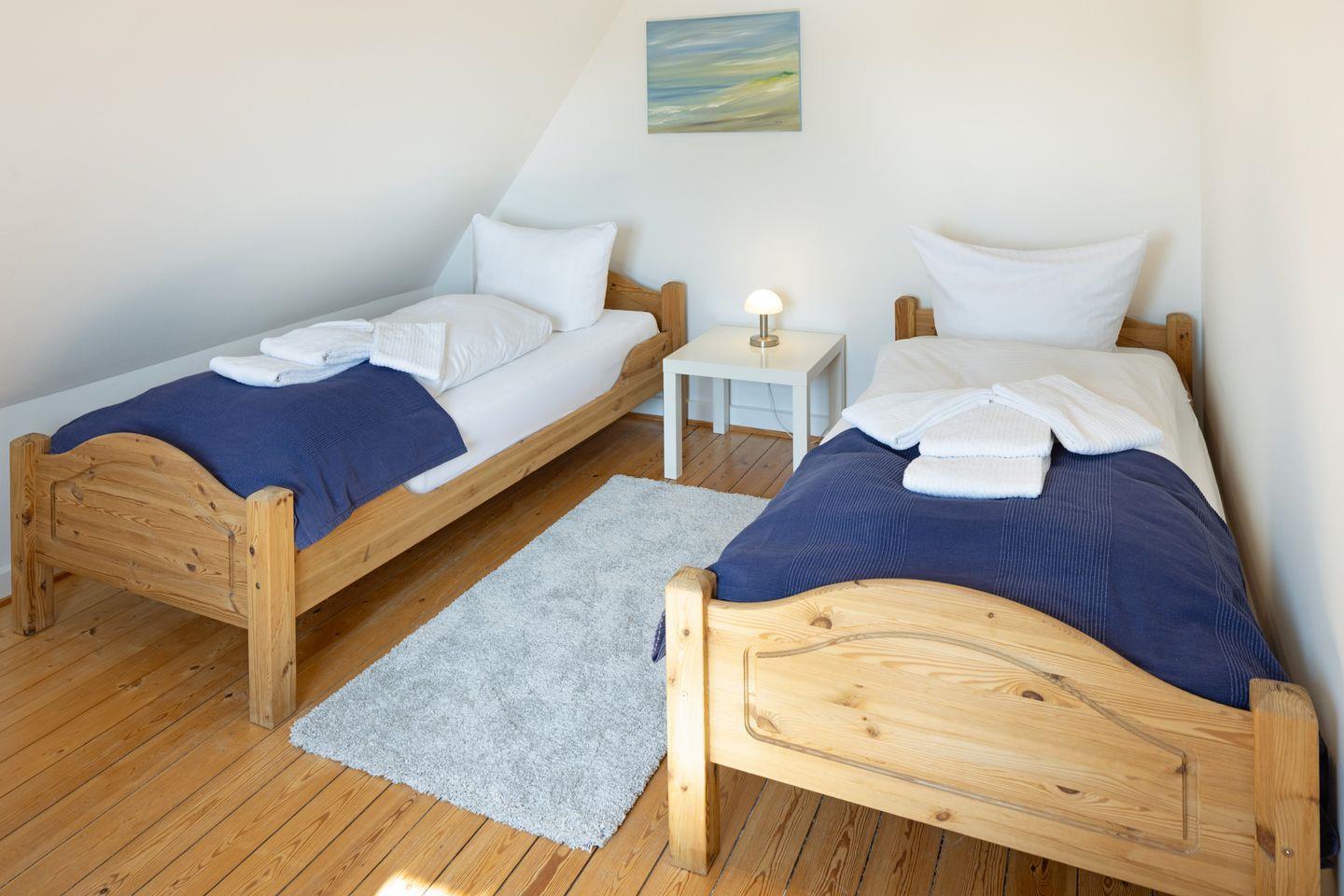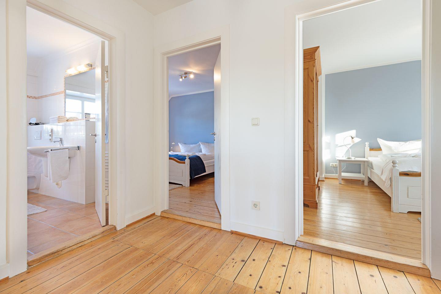 Die weiteren Schlafzimmer (zwei mit Doppelbetten, zwei mit jeweils zwei Einzelbetten) und das zweite Badezimmer mit Duschwanne befinden sich 1. Stock.