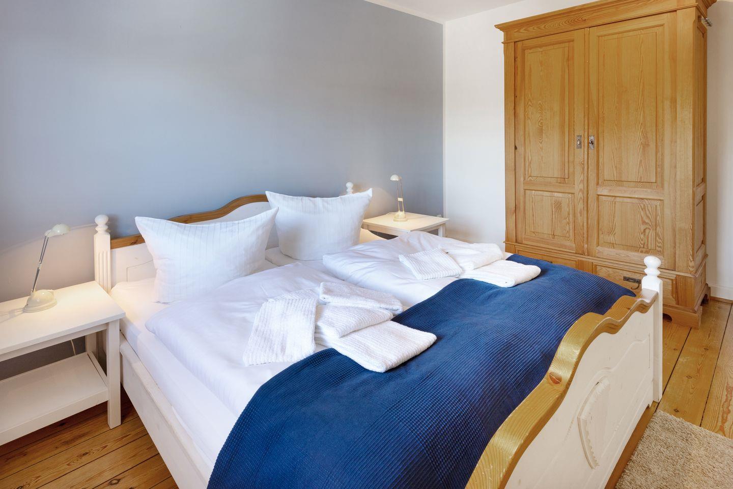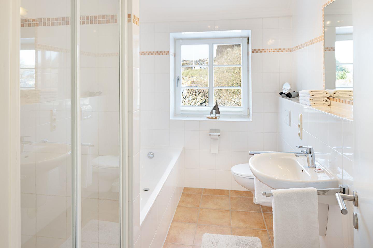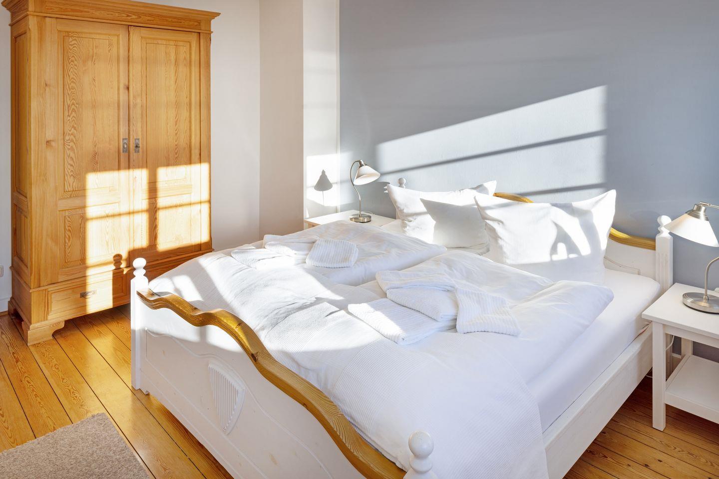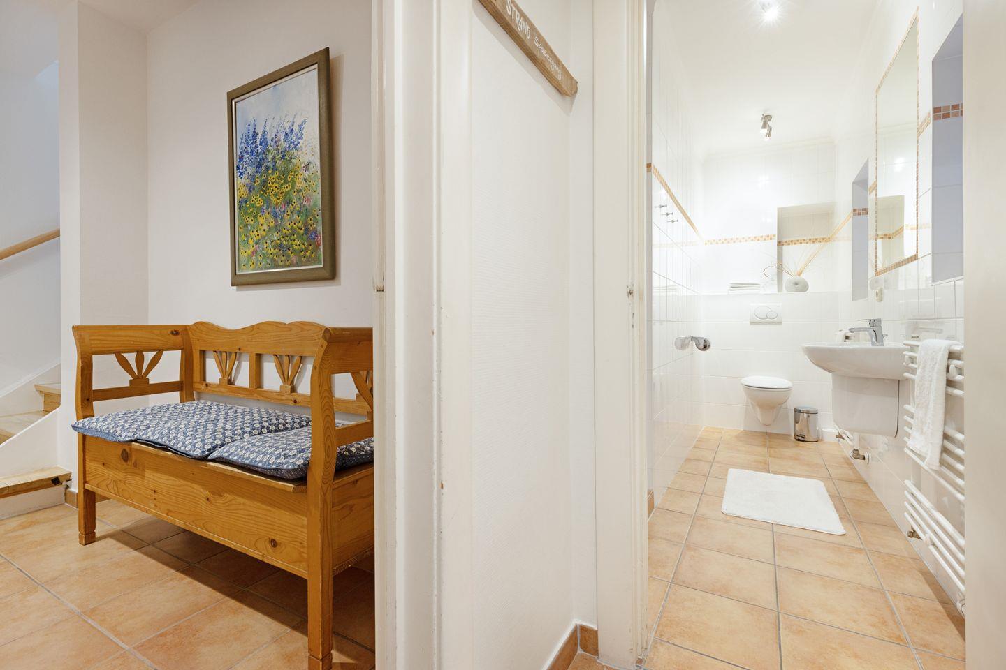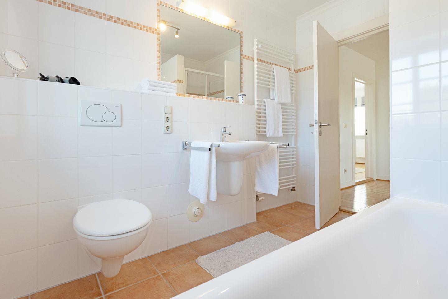 Die weiteren Schlafzimmer (zwei mit Doppelbetten, zwei mit jeweils zwei Einzelbetten) und das zweite Badezimmer mit Duschwanne befinden sich 1. Stock.