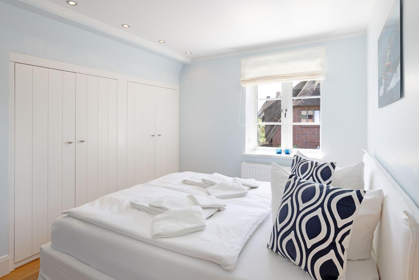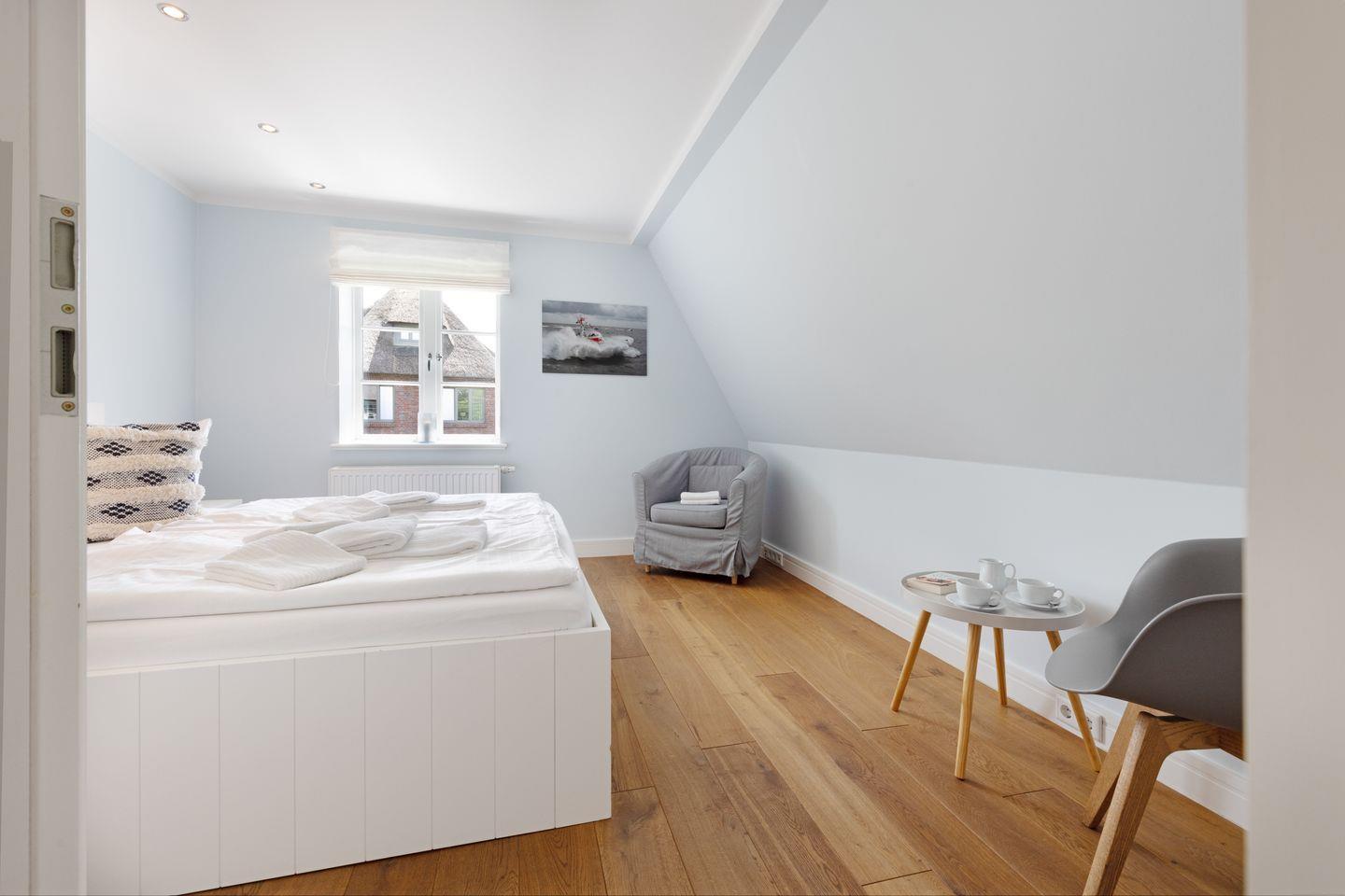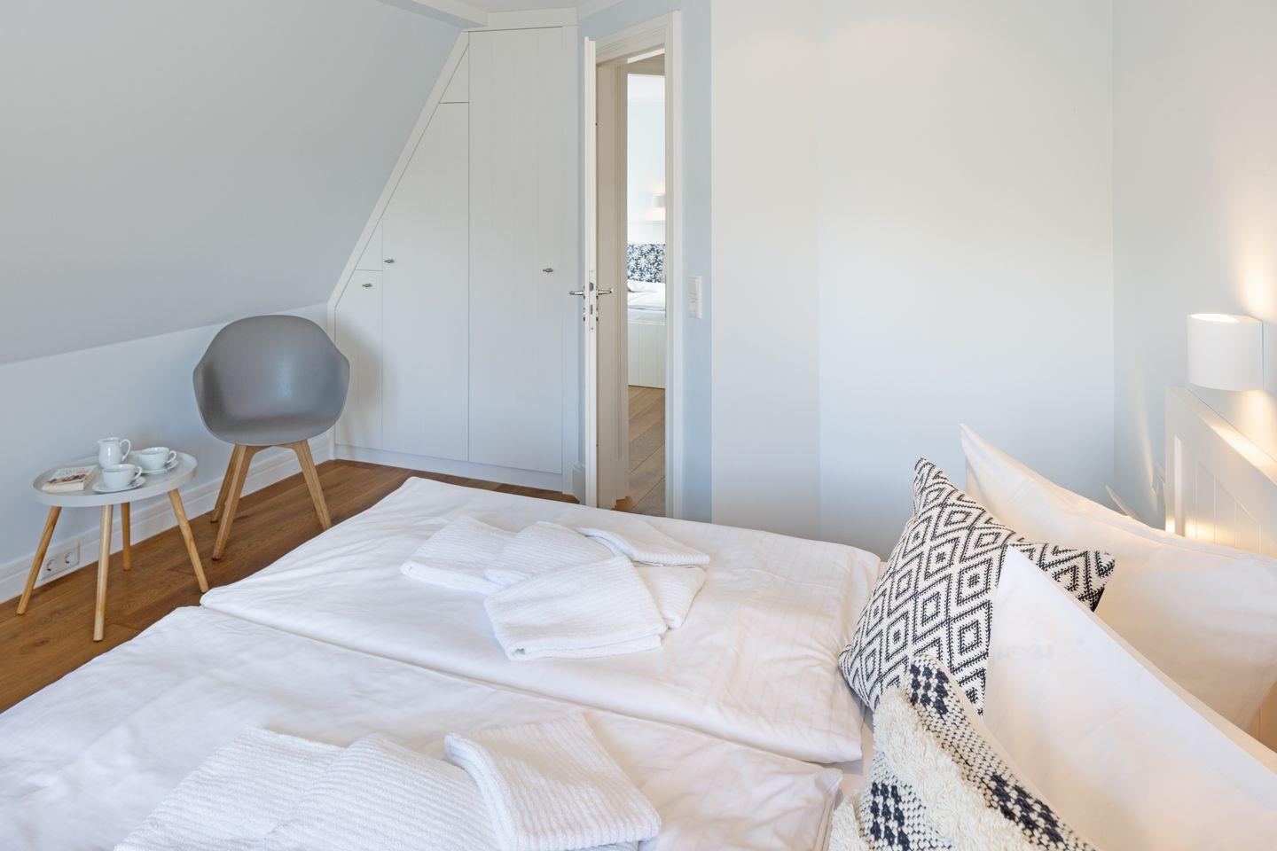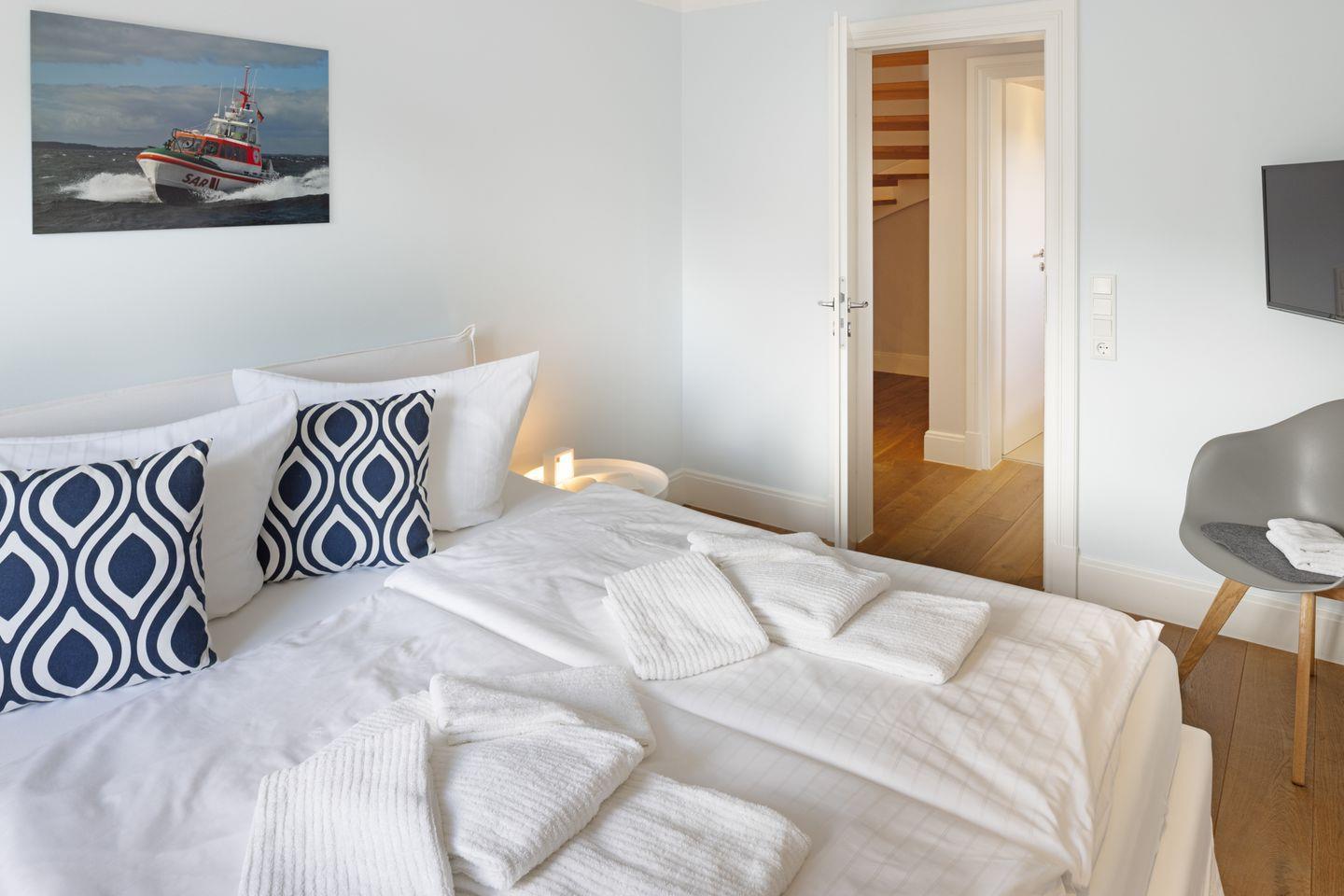 Nordisch moderne Behaglichkeit erwartet sie auch in den geräumigen Schlafzimmern und Bädern im Obergeschoss mit Blick auf die reetgedeckte Nachbarschaft. Zwei Schlafzimmer verfügen über Smart TVs. Der Saunabereich im Untergeschoß lädt sie zum Erholen ein.