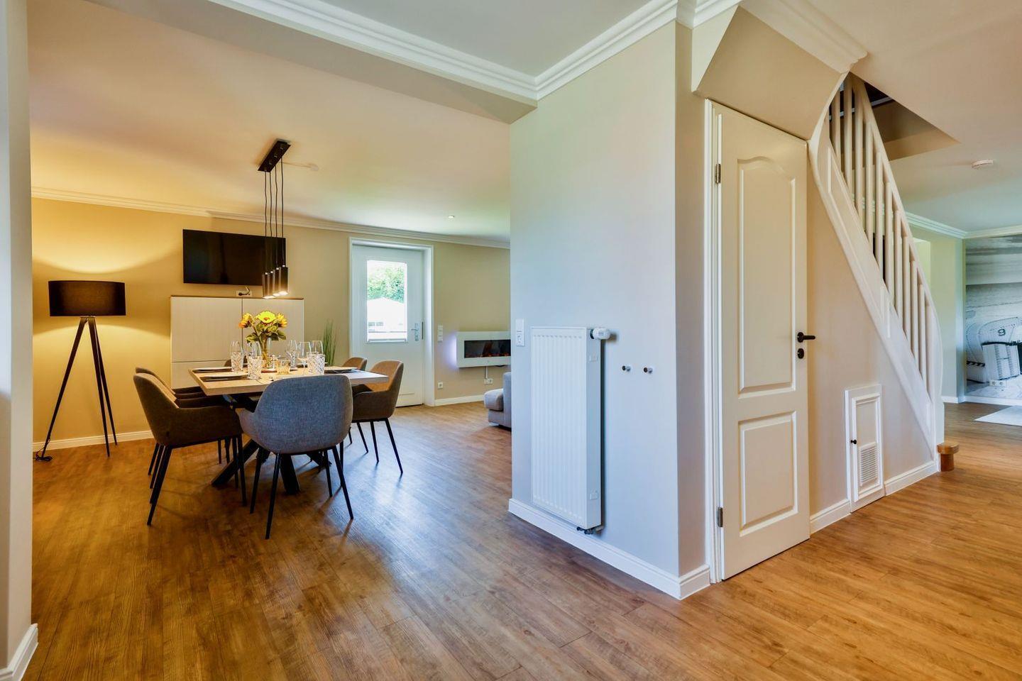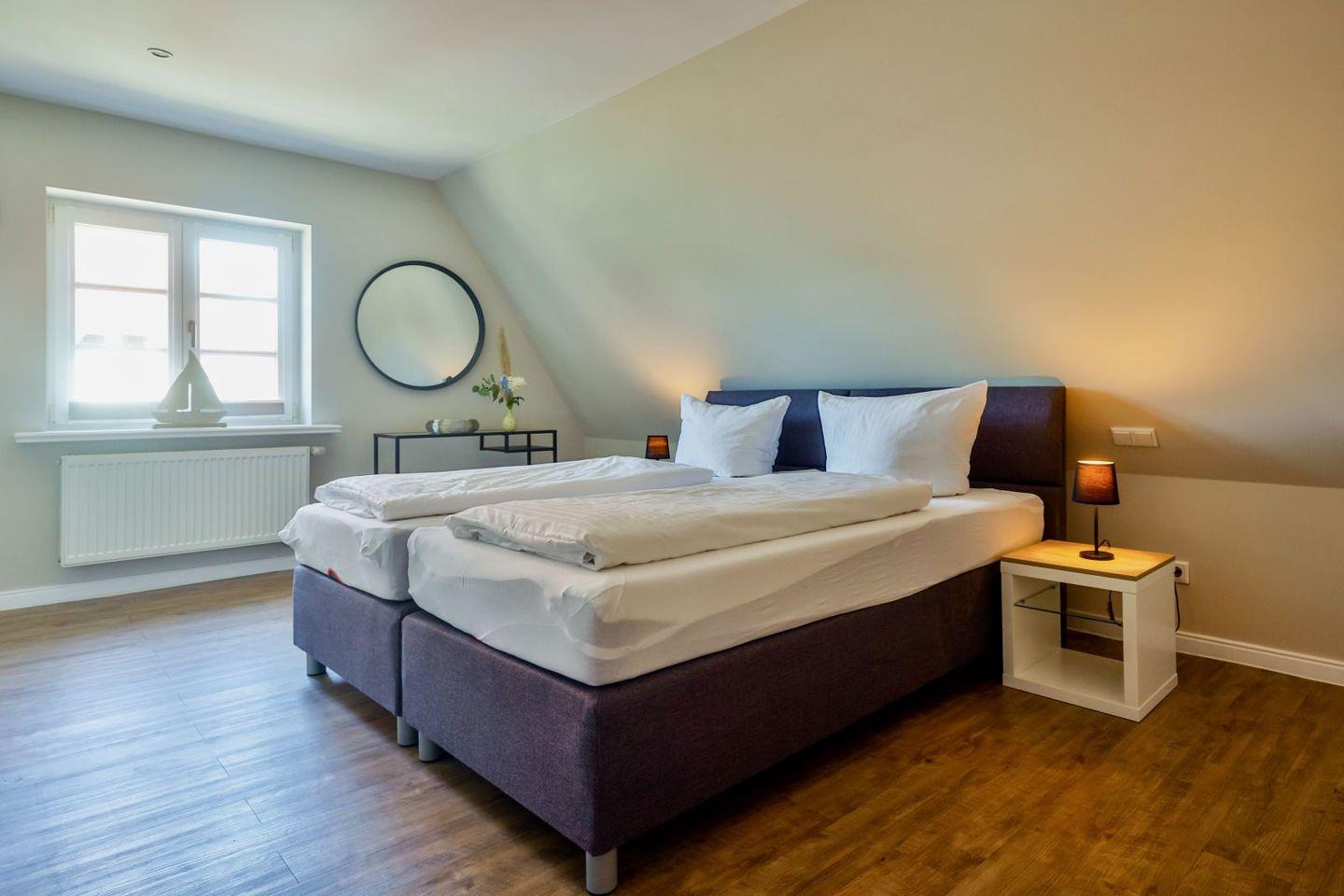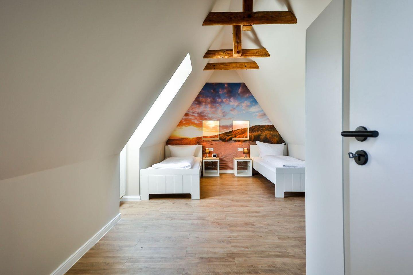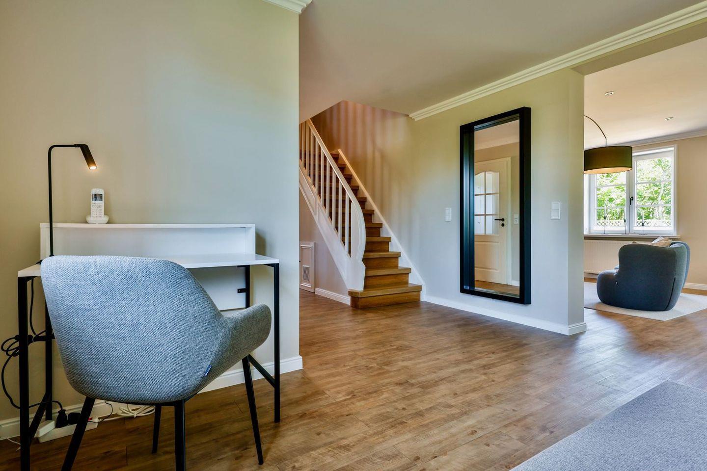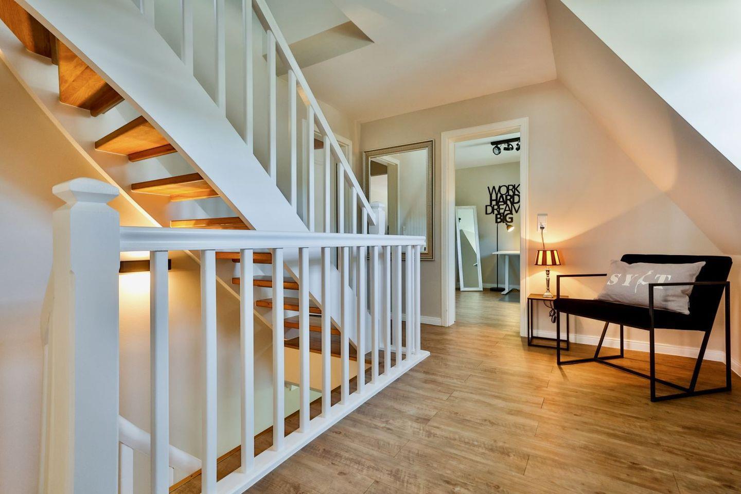 (geschlossene Treppe) befinden sich zwei große Schlafzimmer mit Boxspring-Betten, ein eigener Bereich für die Möglichkeit zum Home-Office sowie ein großes Bad mit Dusche und Badewanne. Im 2.Stock (offene, stark ansteigende Treppe) befindet sich das dritte Schlafzimmer mit zwei Einzelbetten und einem separaten Duschbad. Der großzügige Garten hält Sonnenliegen und eine Sauna bereit.