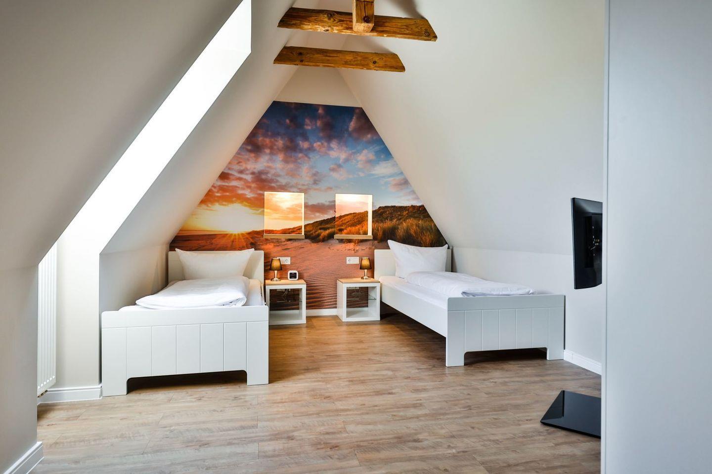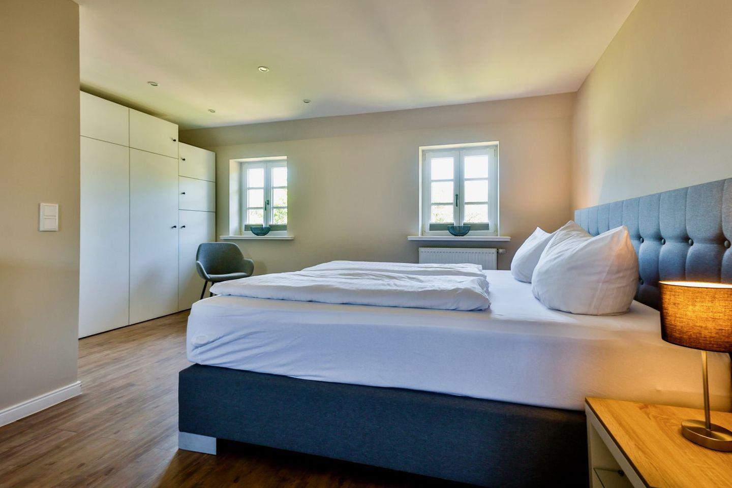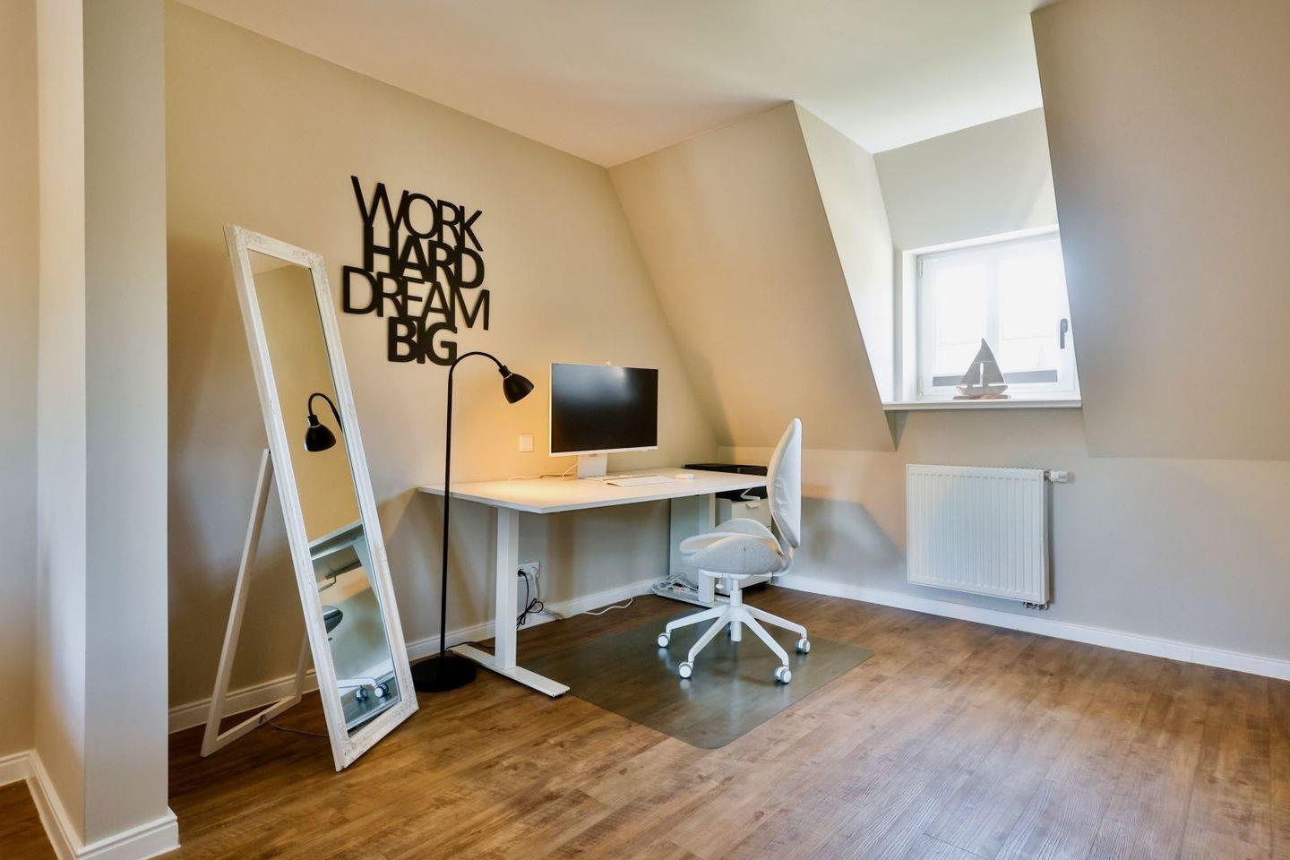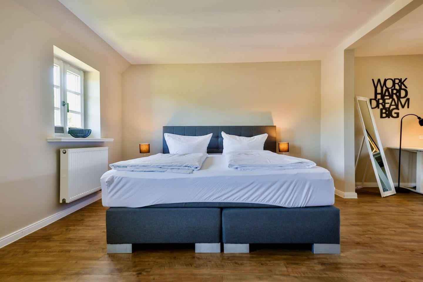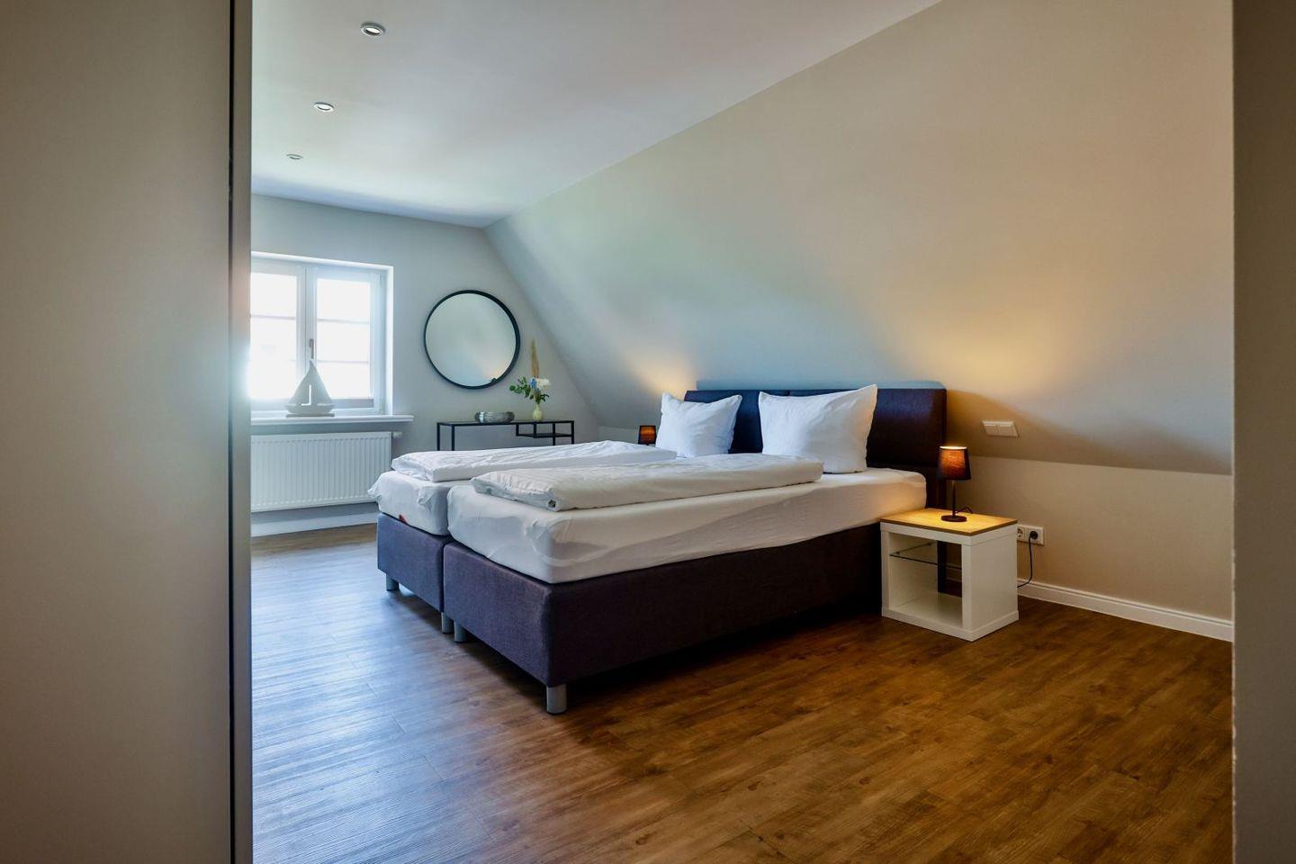 (geschlossene Treppe) befinden sich zwei große Schlafzimmer mit Boxspring-Betten, ein eigener Bereich für die Möglichkeit zum Home-Office sowie ein großes Bad mit Dusche und Badewanne. Im 2.Stock (offene, stark ansteigende Treppe) befindet sich das dritte Schlafzimmer mit zwei Einzelbetten und einem separaten Duschbad. Der großzügige Garten hält Sonnenliegen und eine Sauna bereit.