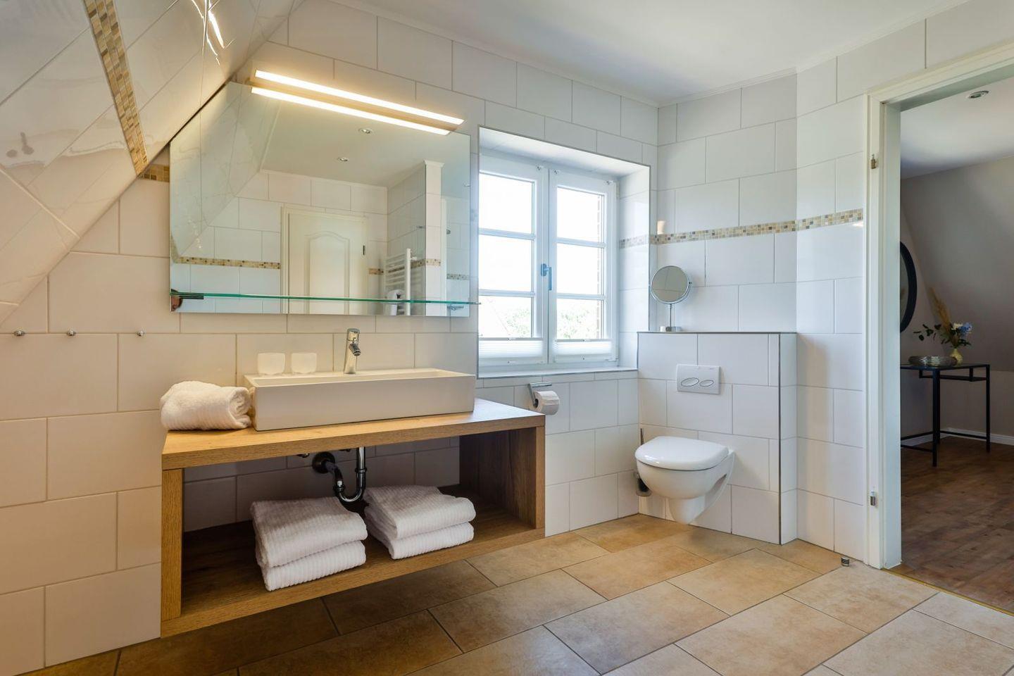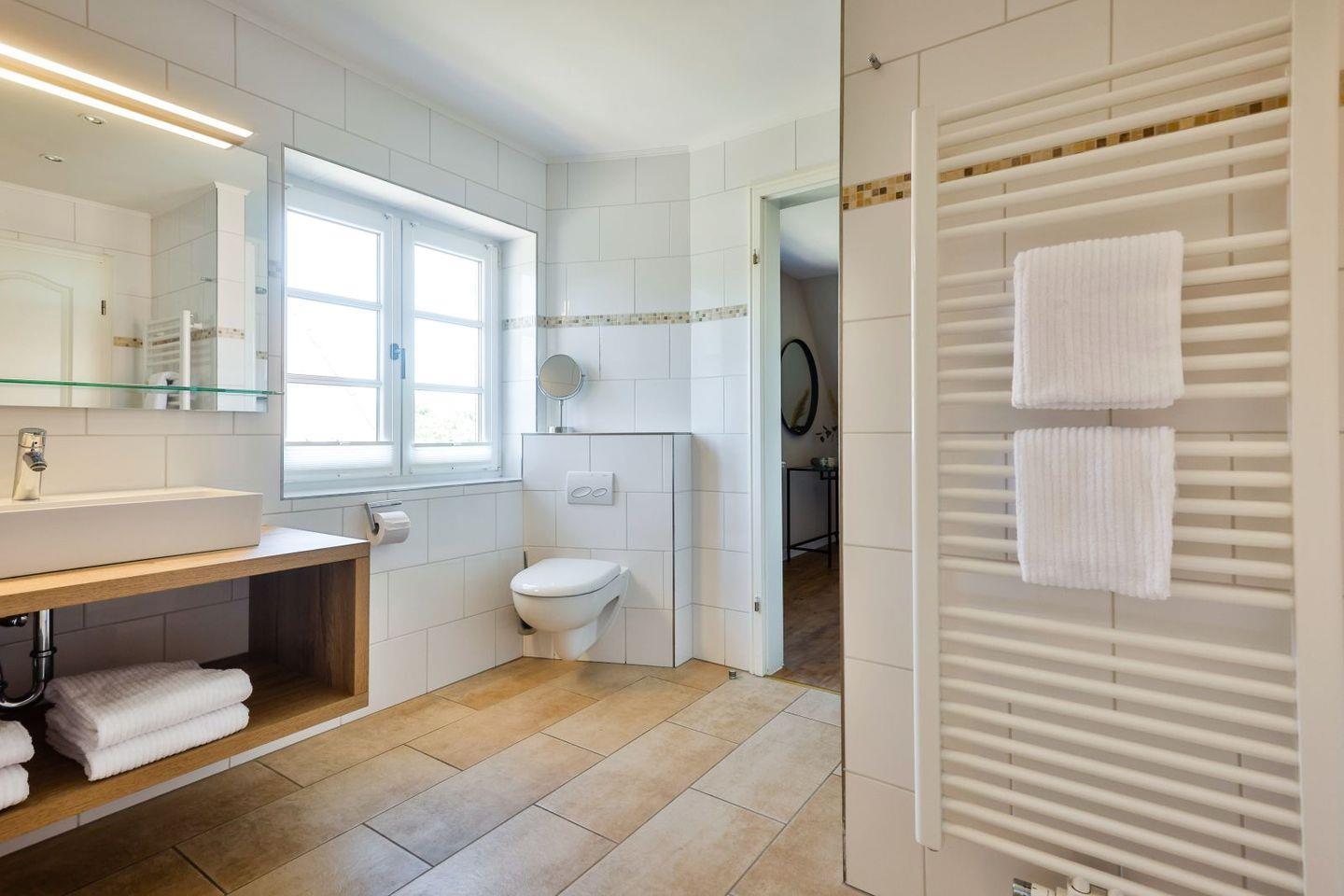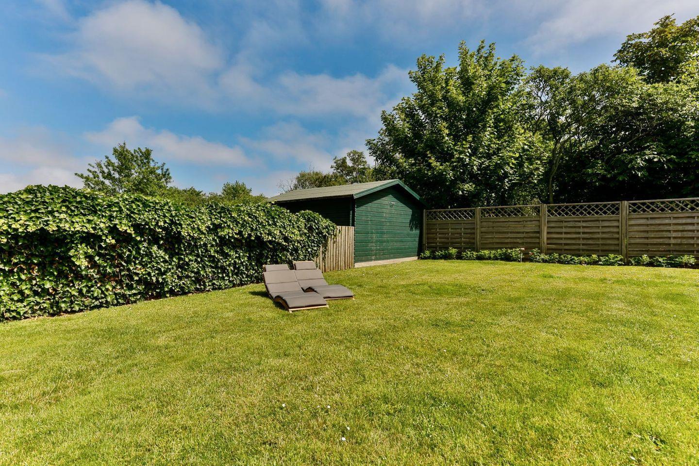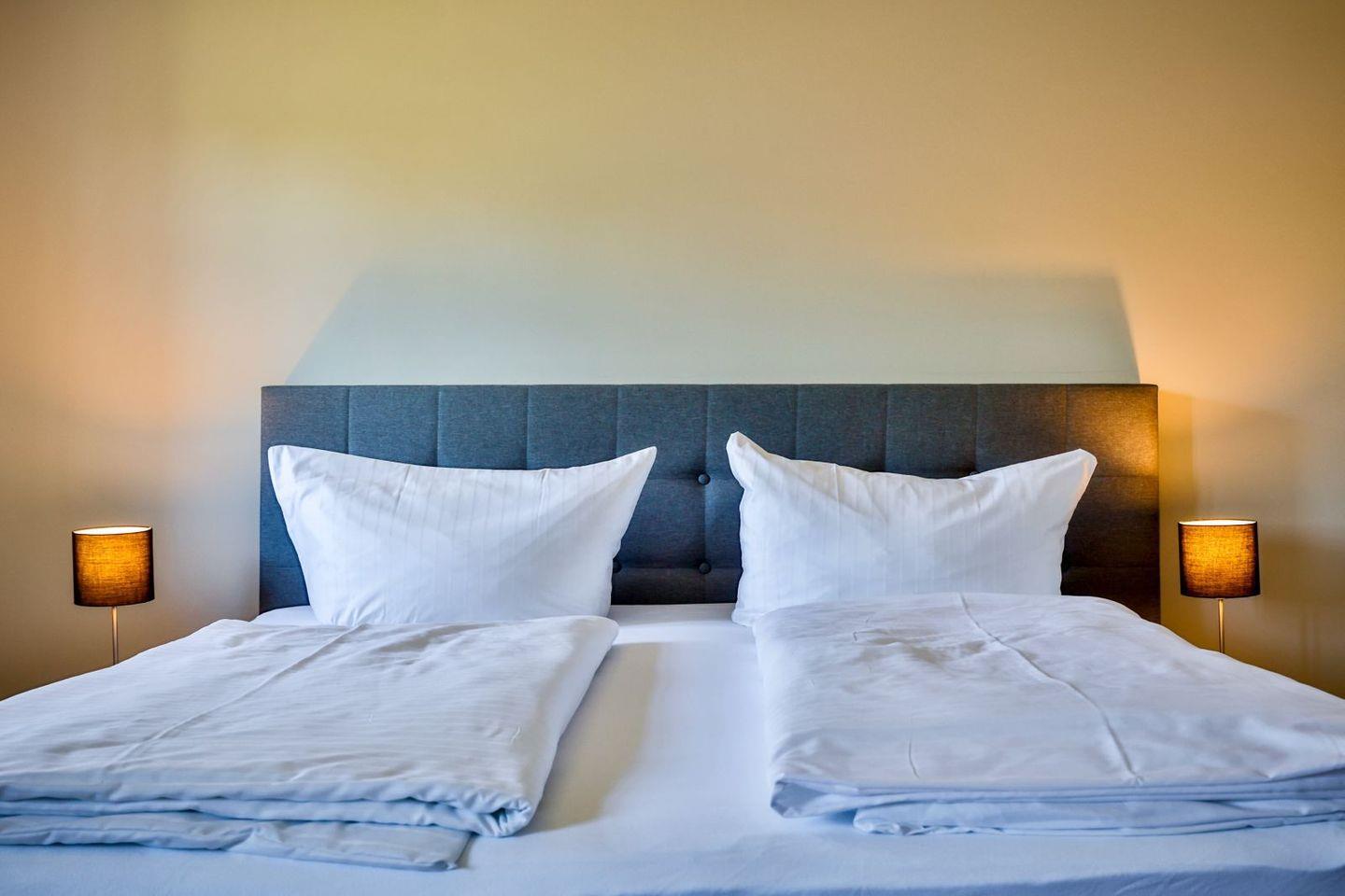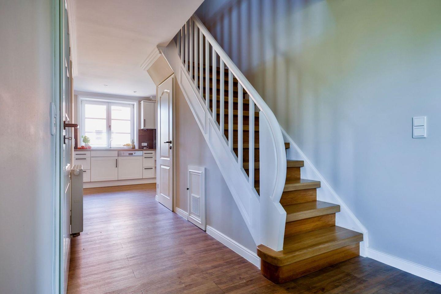 (geschlossene Treppe) befinden sich zwei große Schlafzimmer mit Boxspring-Betten, ein eigener Bereich für die Möglichkeit zum Home-Office sowie ein großes Bad mit Dusche und Badewanne. Im 2.Stock (offene, stark ansteigende Treppe) befindet sich das dritte Schlafzimmer mit zwei Einzelbetten und einem separaten Duschbad. Der großzügige Garten hält Sonnenliegen und eine Sauna bereit.