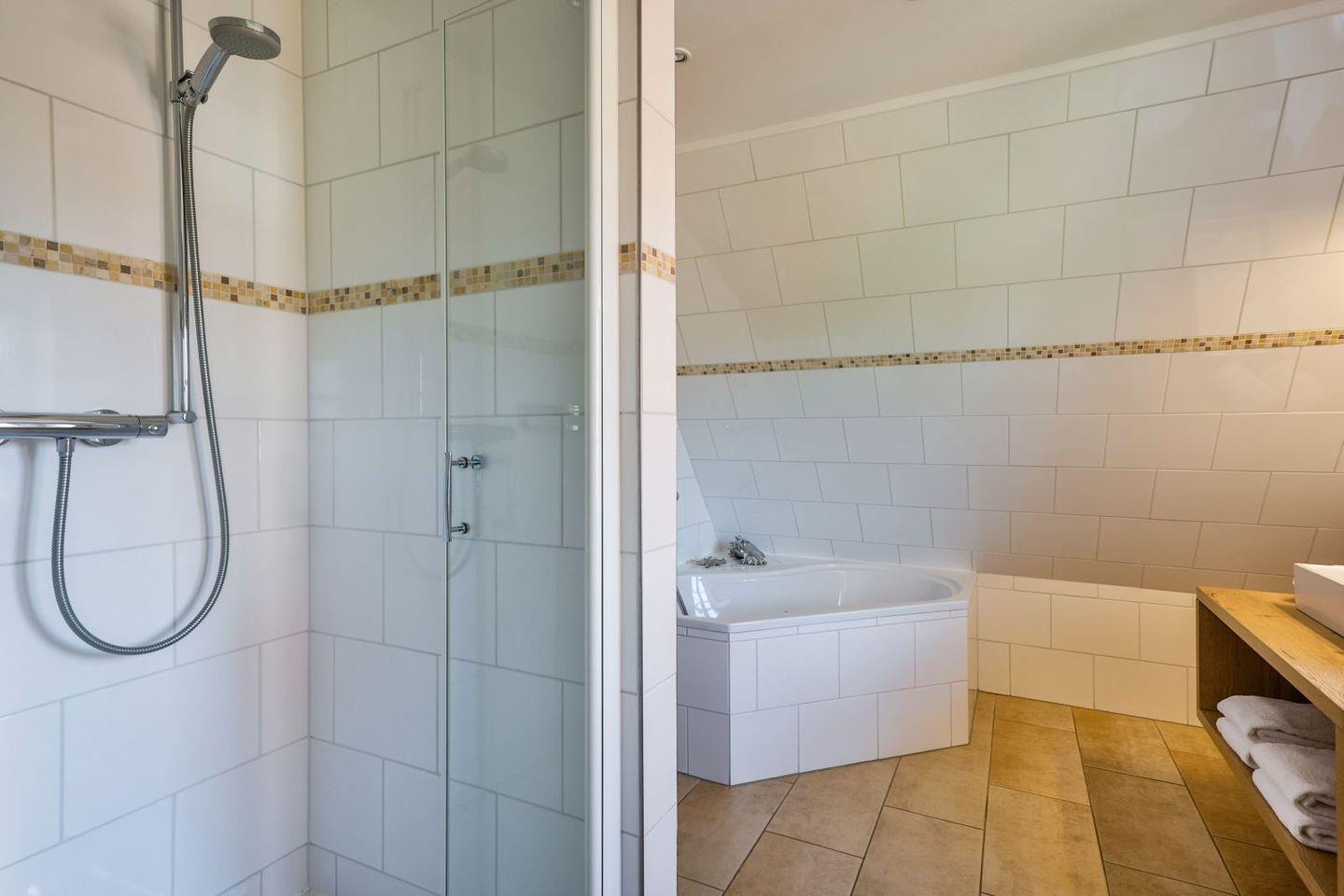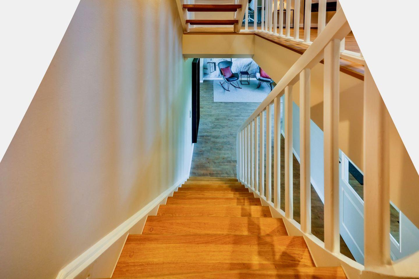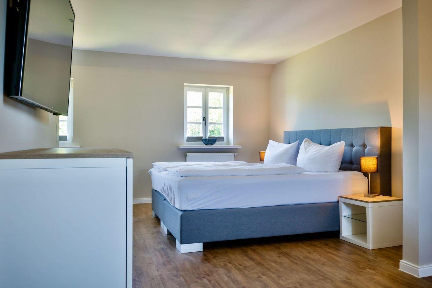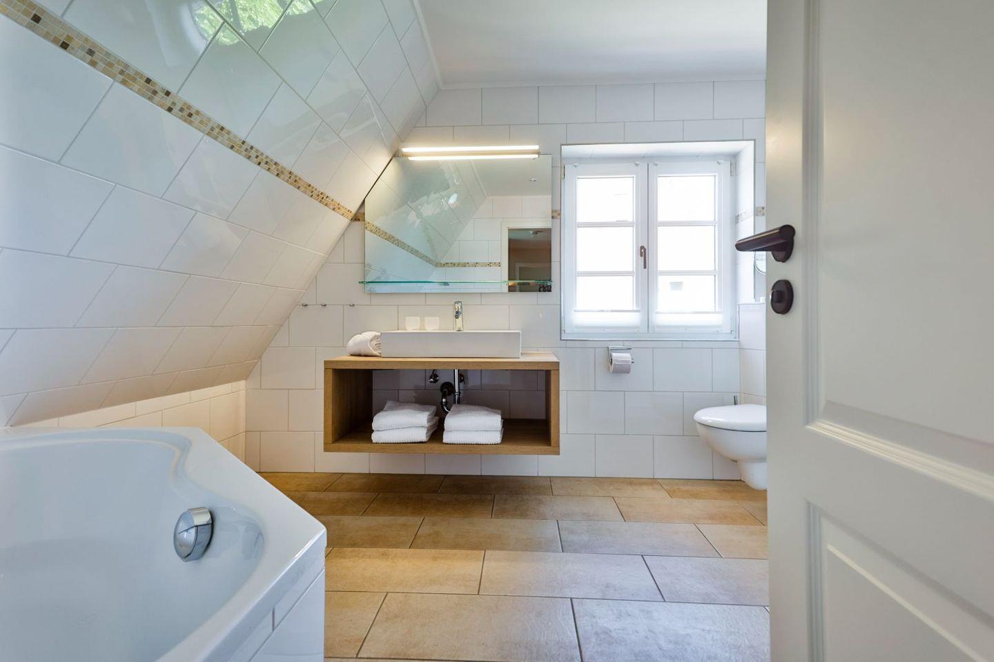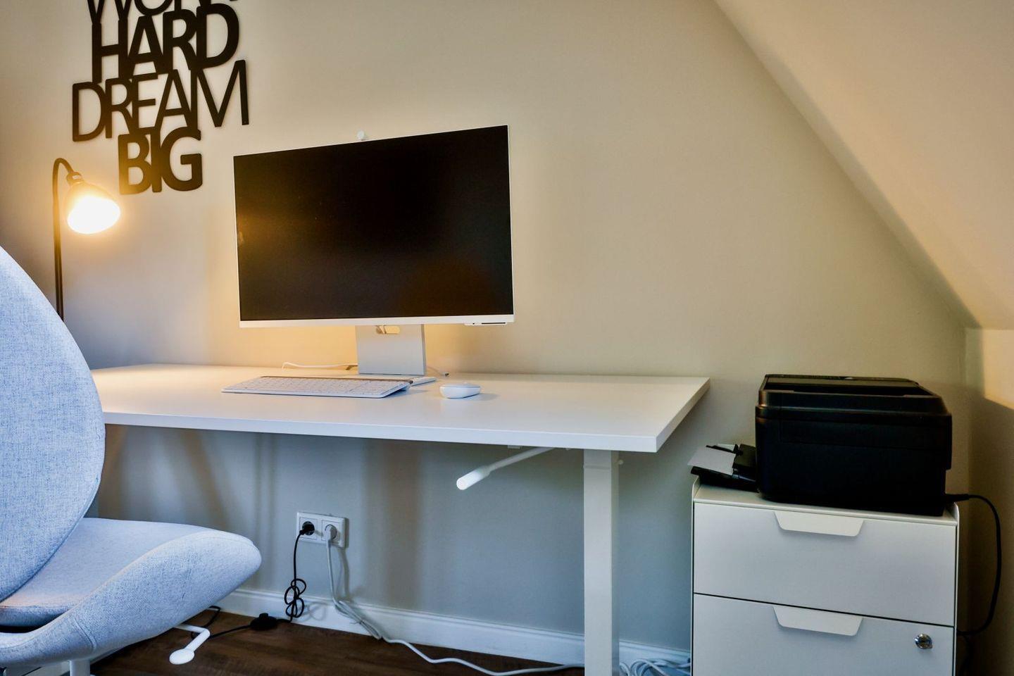 (geschlossene Treppe) befinden sich zwei große Schlafzimmer mit Boxspring-Betten, ein eigener Bereich für die Möglichkeit zum Home-Office sowie ein großes Bad mit Dusche und Badewanne. Im 2.Stock (offene, stark ansteigende Treppe) befindet sich das dritte Schlafzimmer mit zwei Einzelbetten und einem separaten Duschbad. Der großzügige Garten hält Sonnenliegen und eine Sauna bereit.