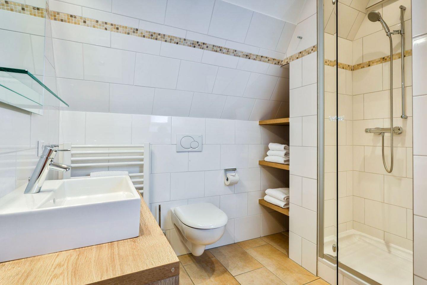 Im Erdgeschoss befindet sich die Küche, eine Dusche mit Toilette und der Wohn-Essbereich mit Elektrokamin auf.