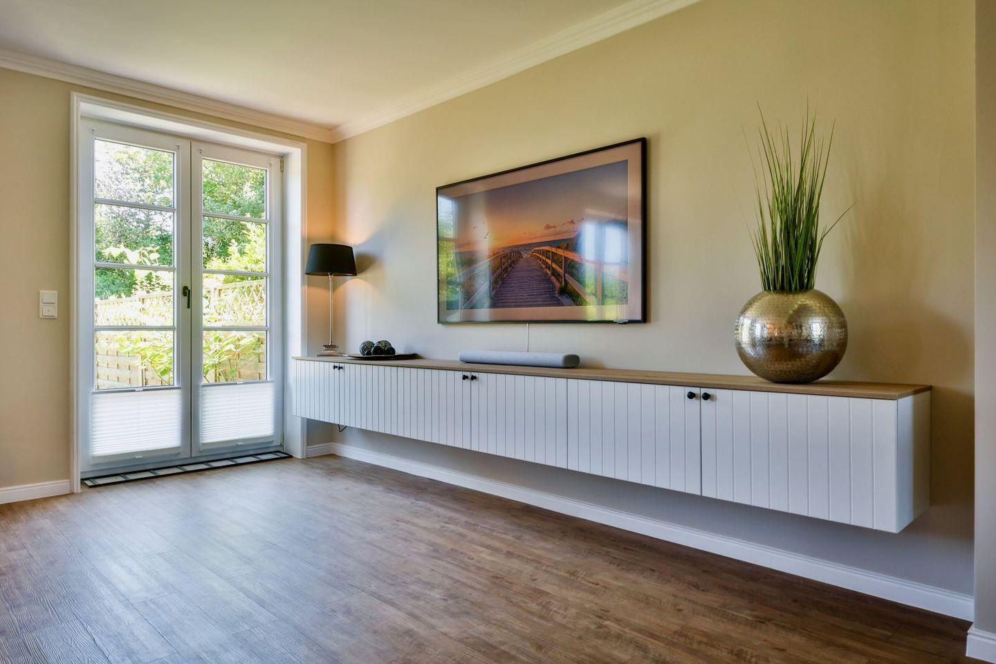 Vom Wohnzimmer geht es hinaus in den Garten mit schöner Terrasse und zwei Stellplätzen für Autos mit Wallbox-Anschluss. Im 1.Stock