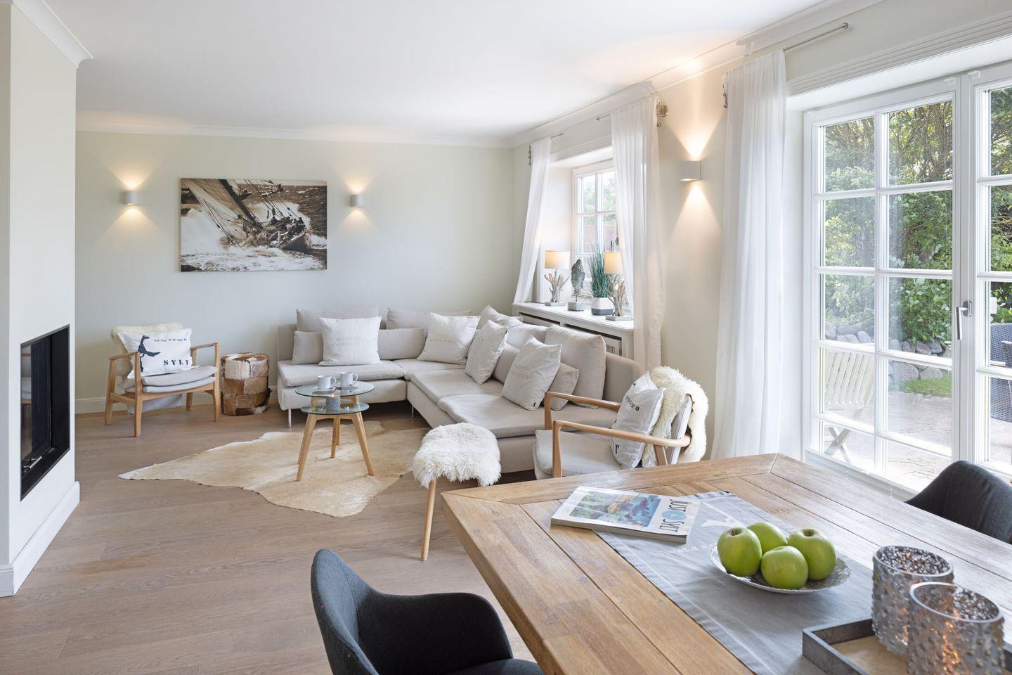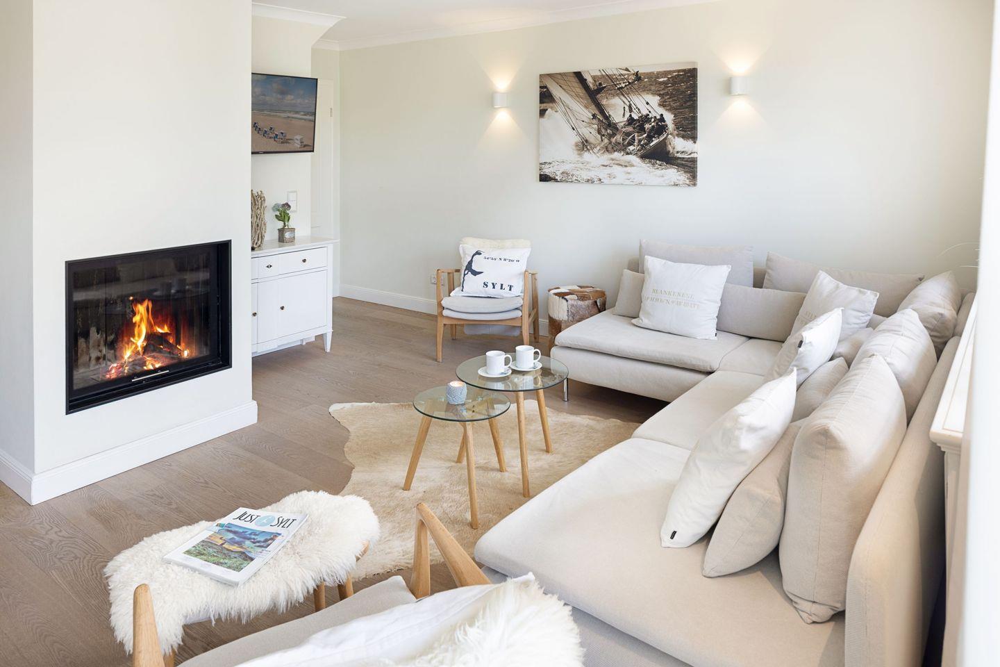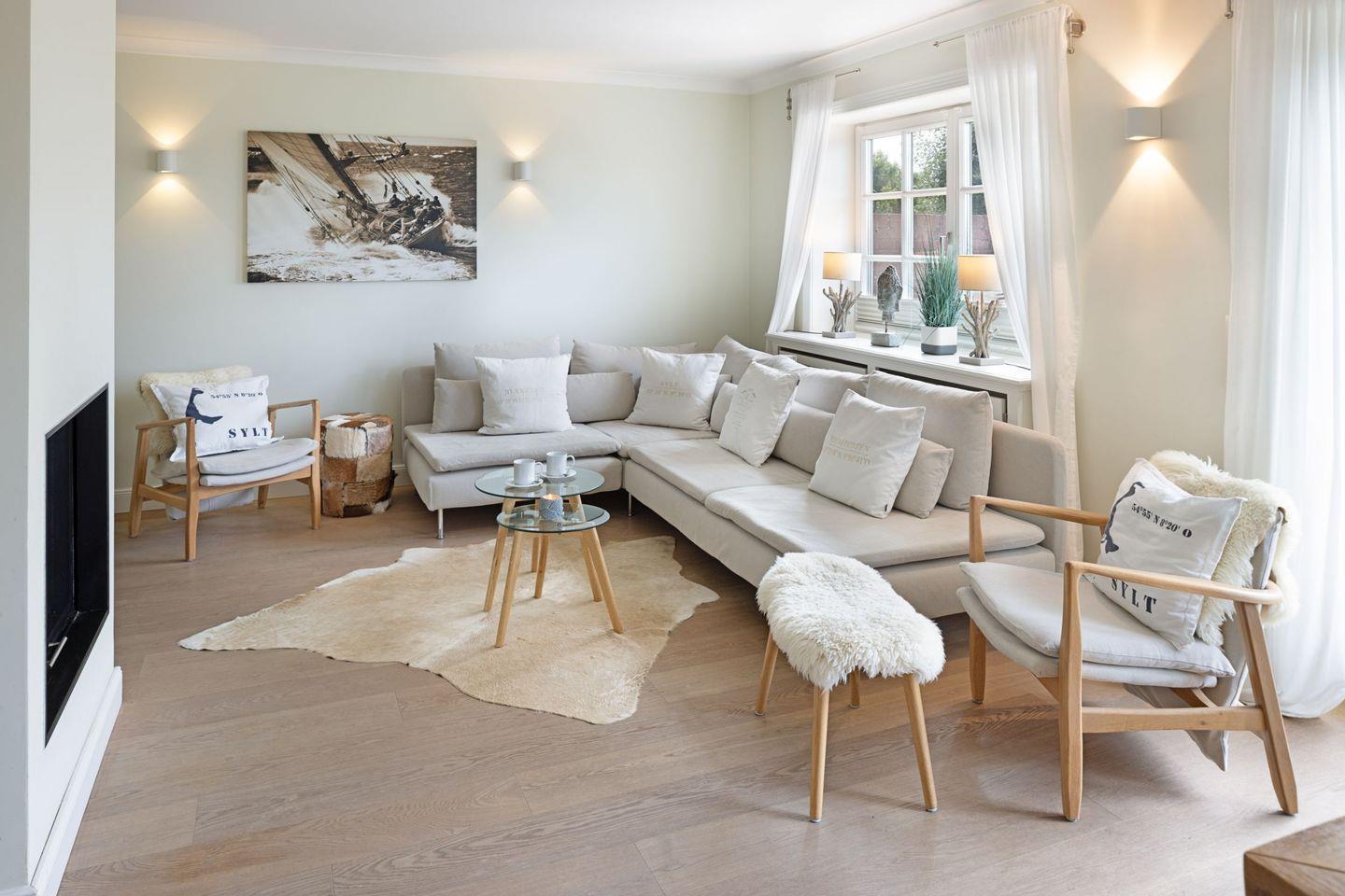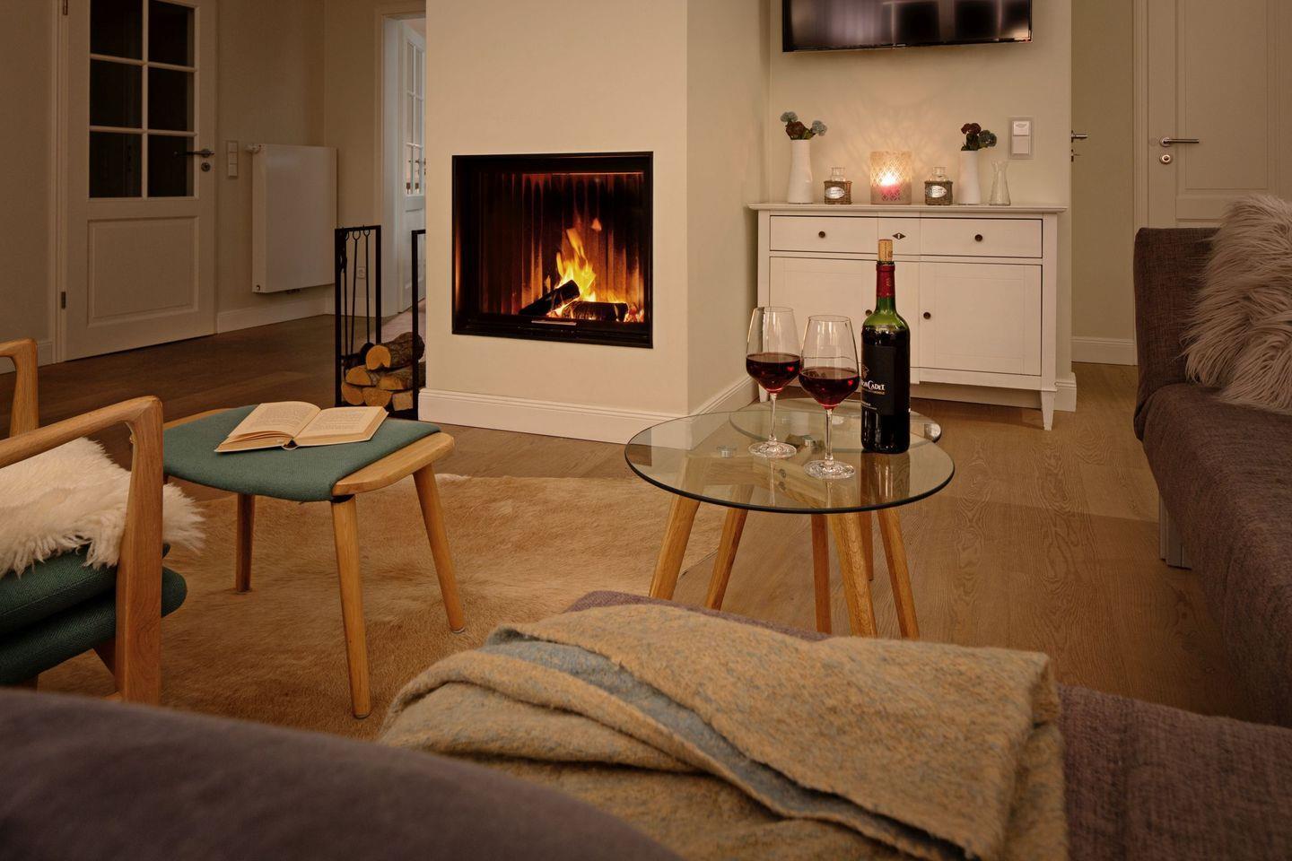 Des weiteren befindet sich im Erdgeschoss eine großzügige Küche mit Essbereich und das separate, gemütliche Wohnzimmer mit Kamin und ein zusätzliches Gäste-WC.