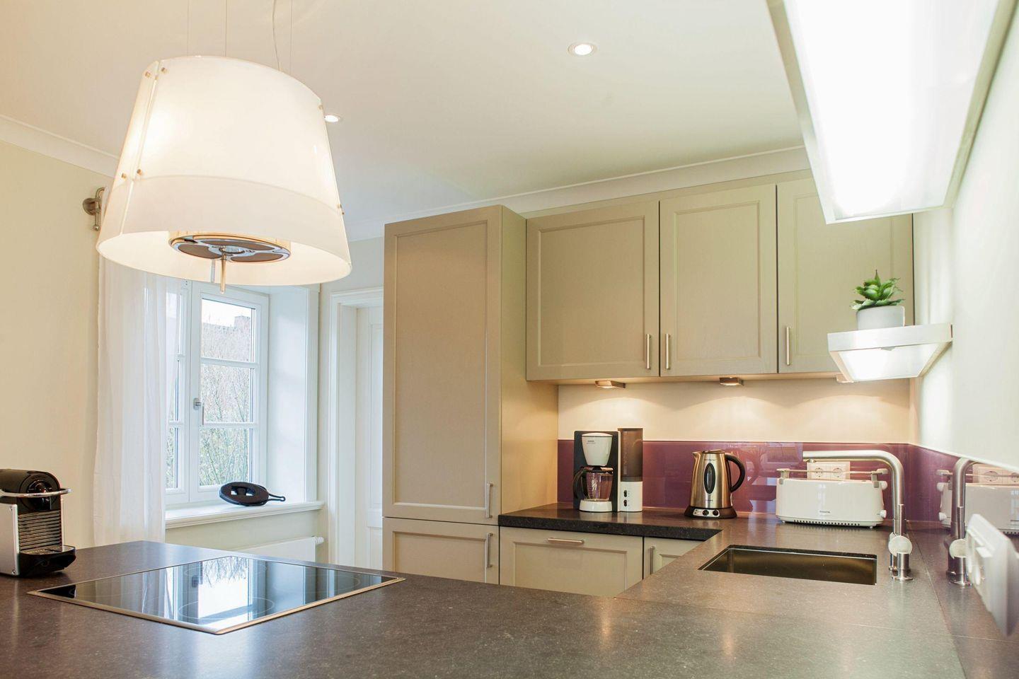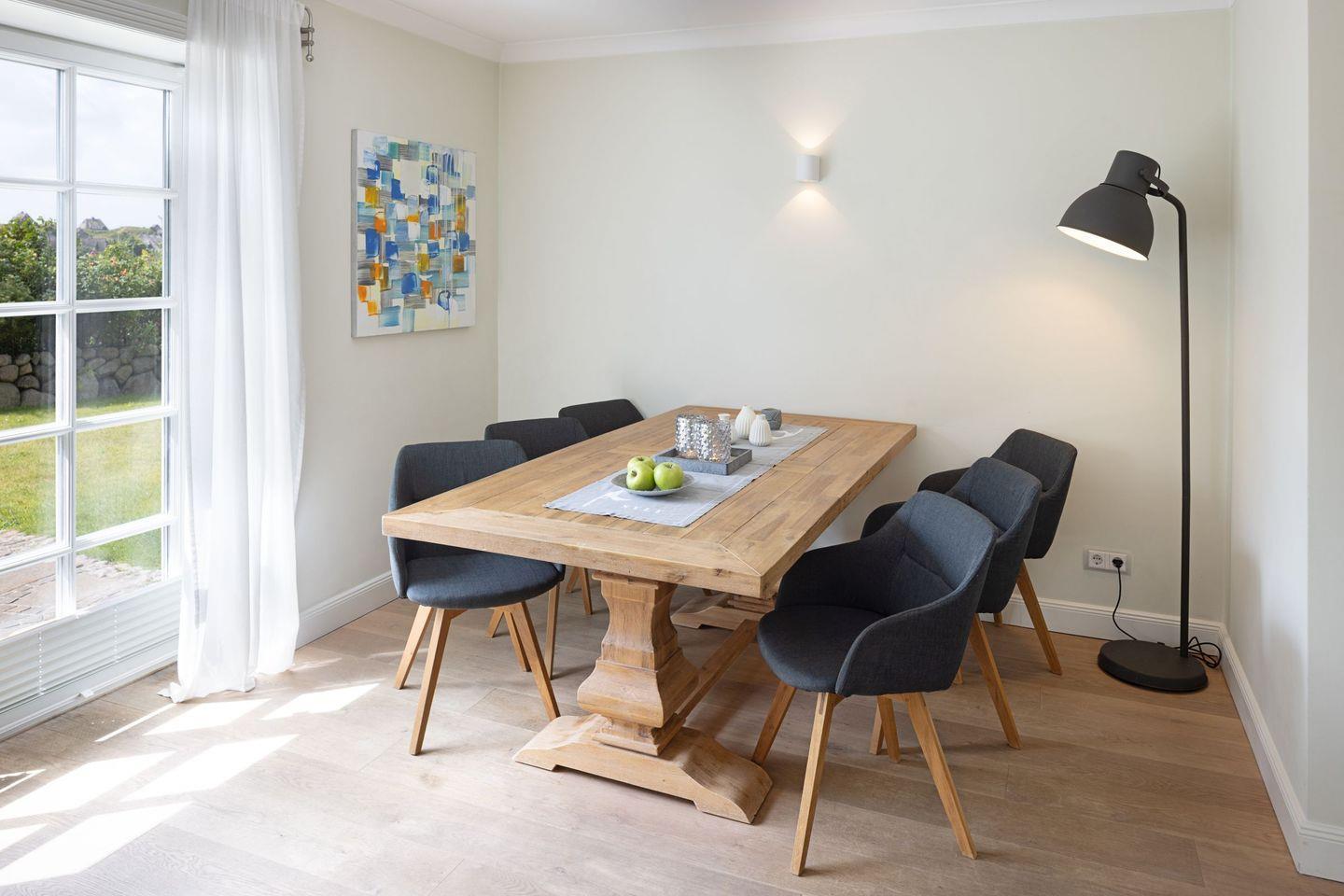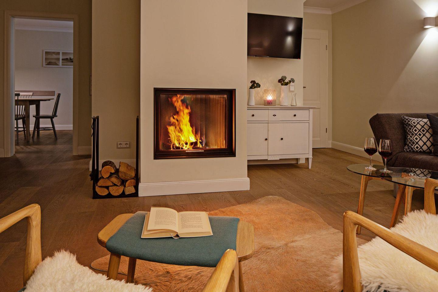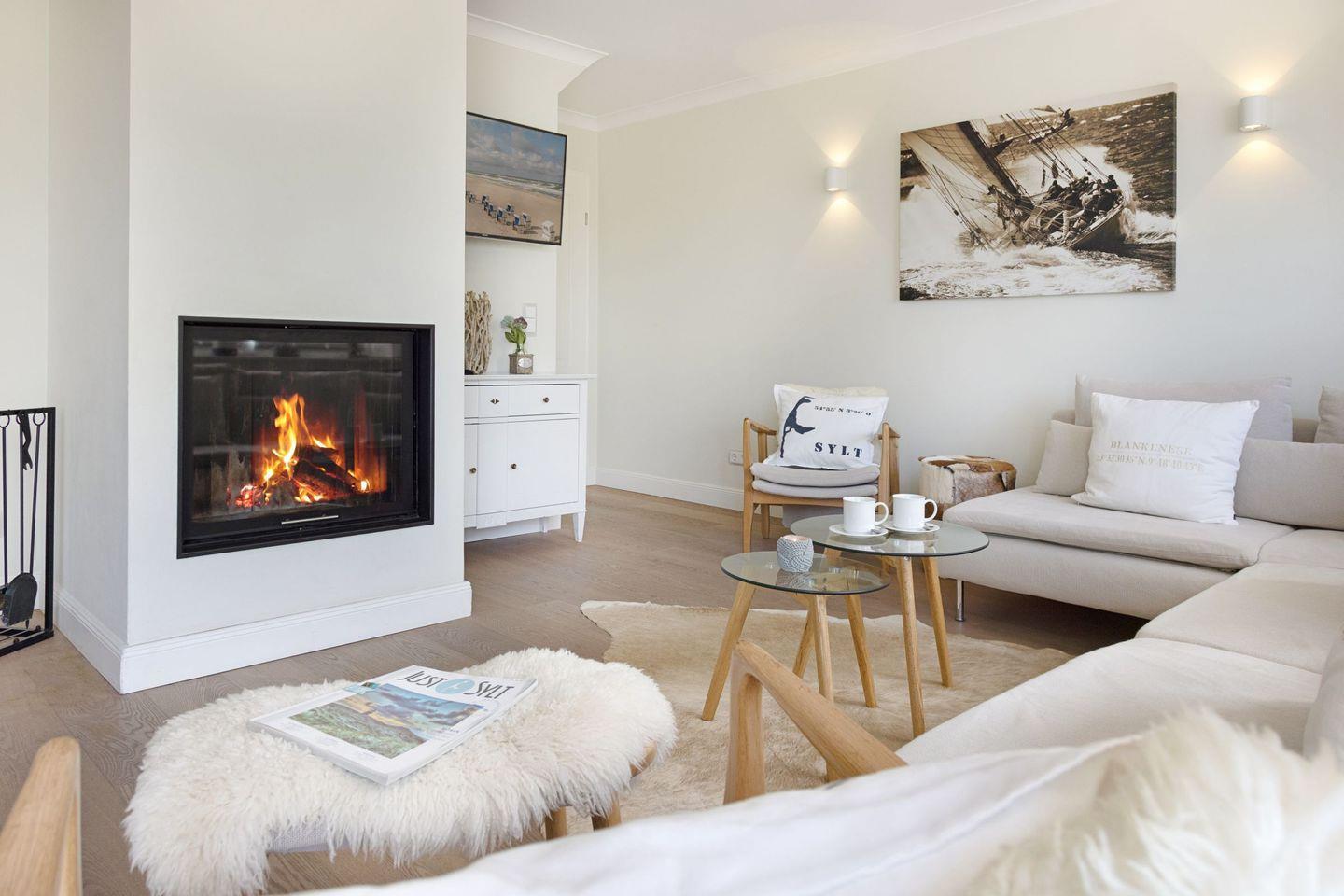 Des weiteren befindet sich im Erdgeschoss eine großzügige Küche mit Essbereich und das separate, gemütliche Wohnzimmer mit Kamin und ein zusätzliches Gäste-WC.