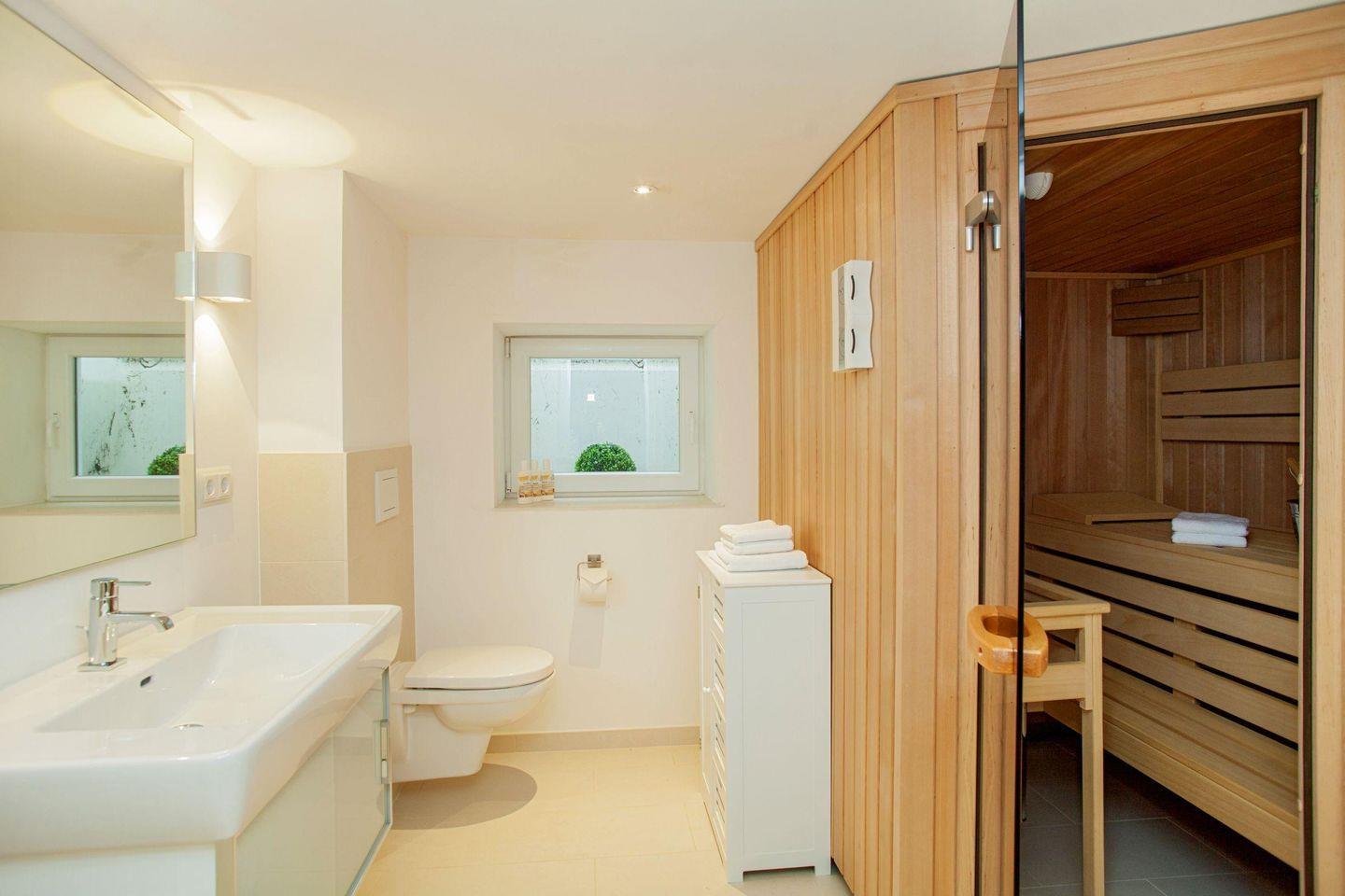 Genießen Sie den Wellness-Bereich mit Sauna und Dusche. Der große Garten lädt zum Spielen und Verweilen ein.