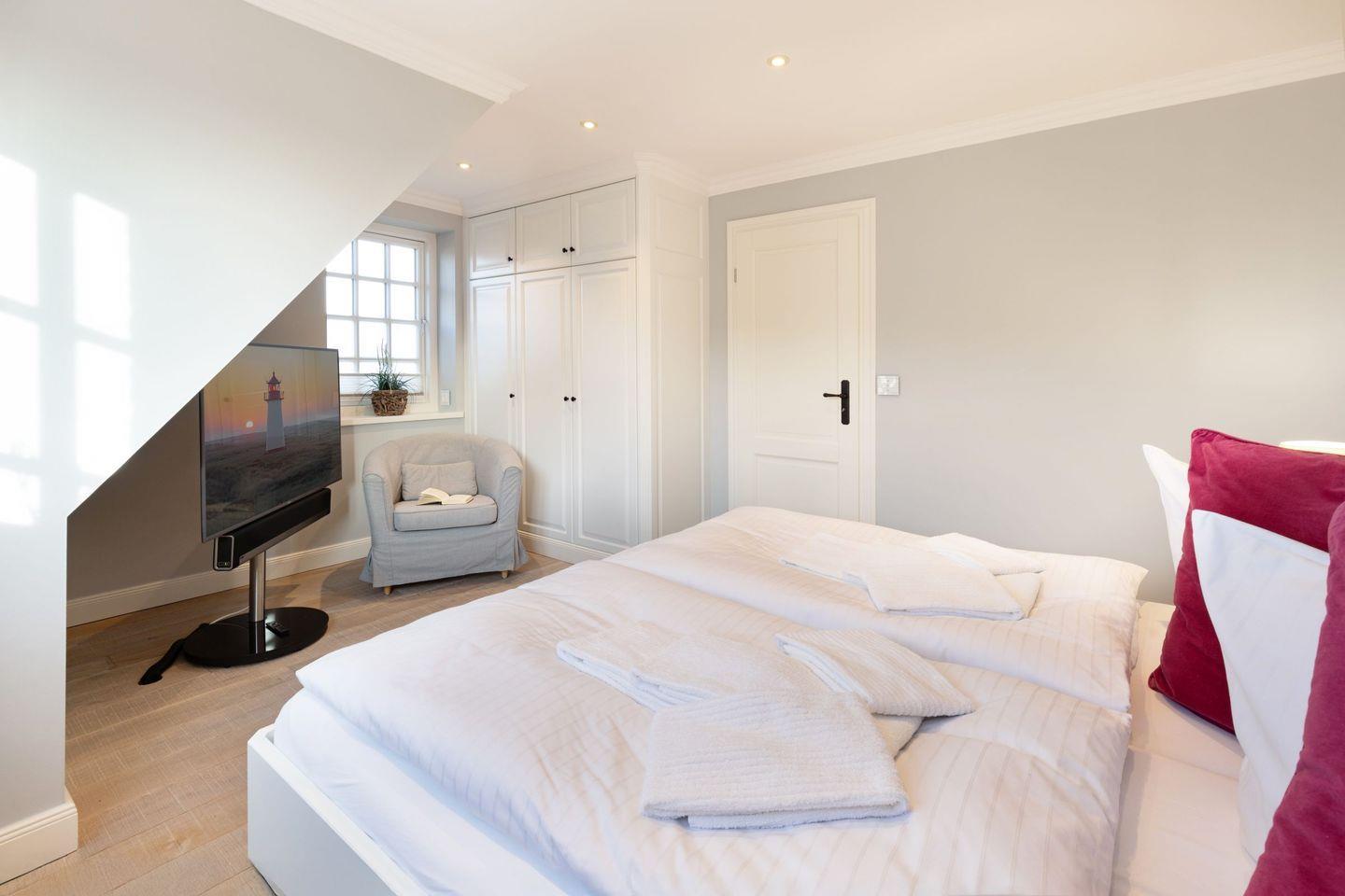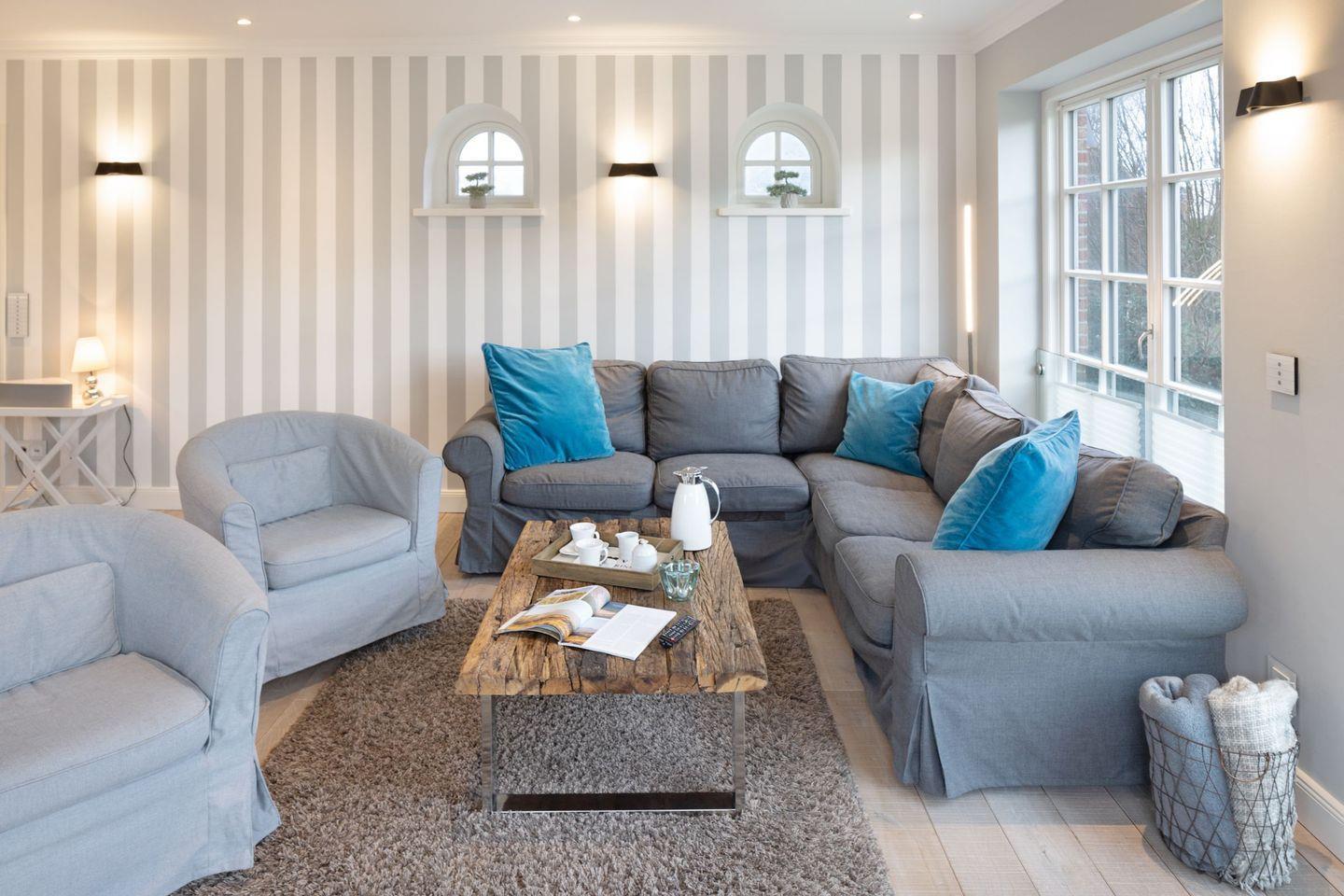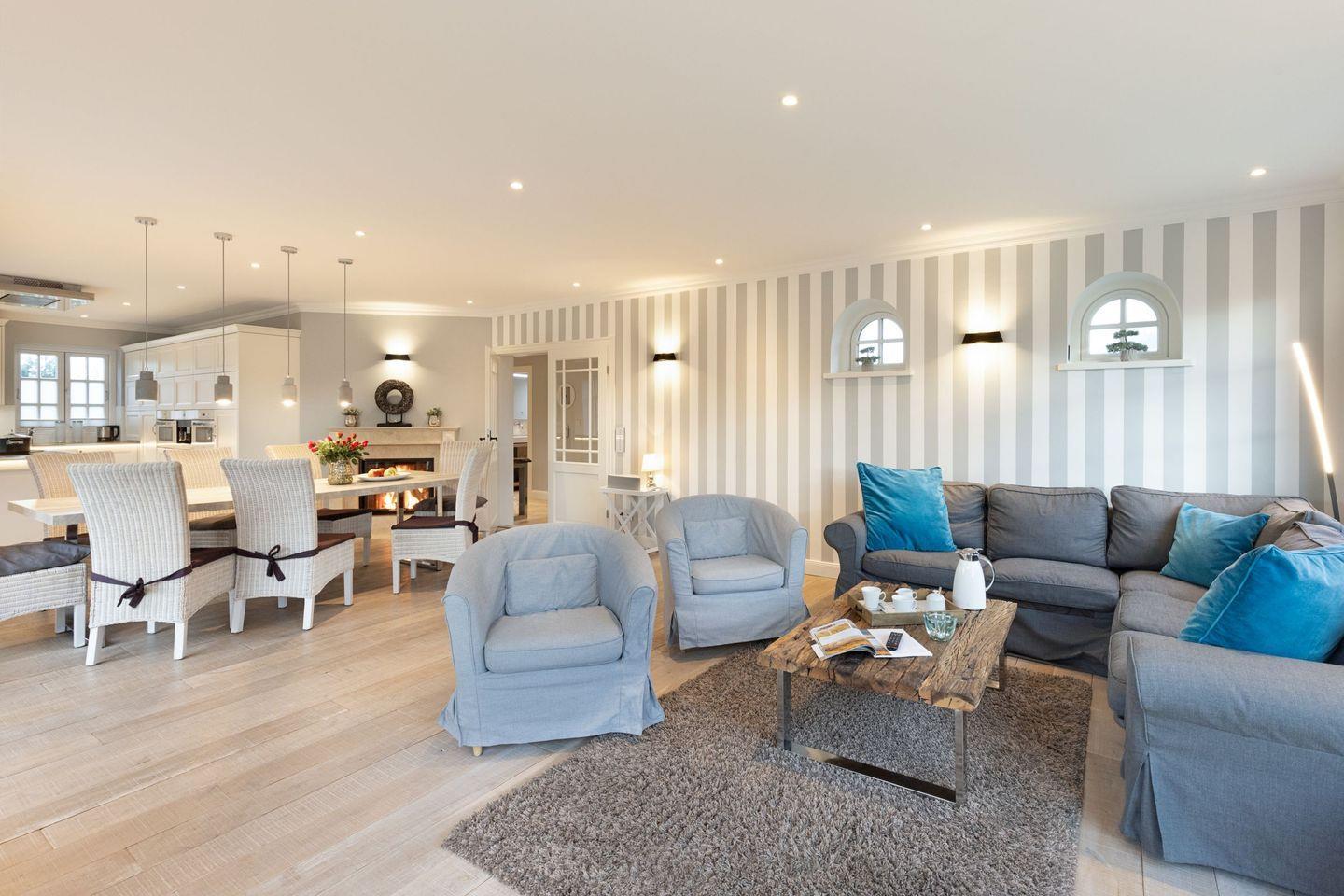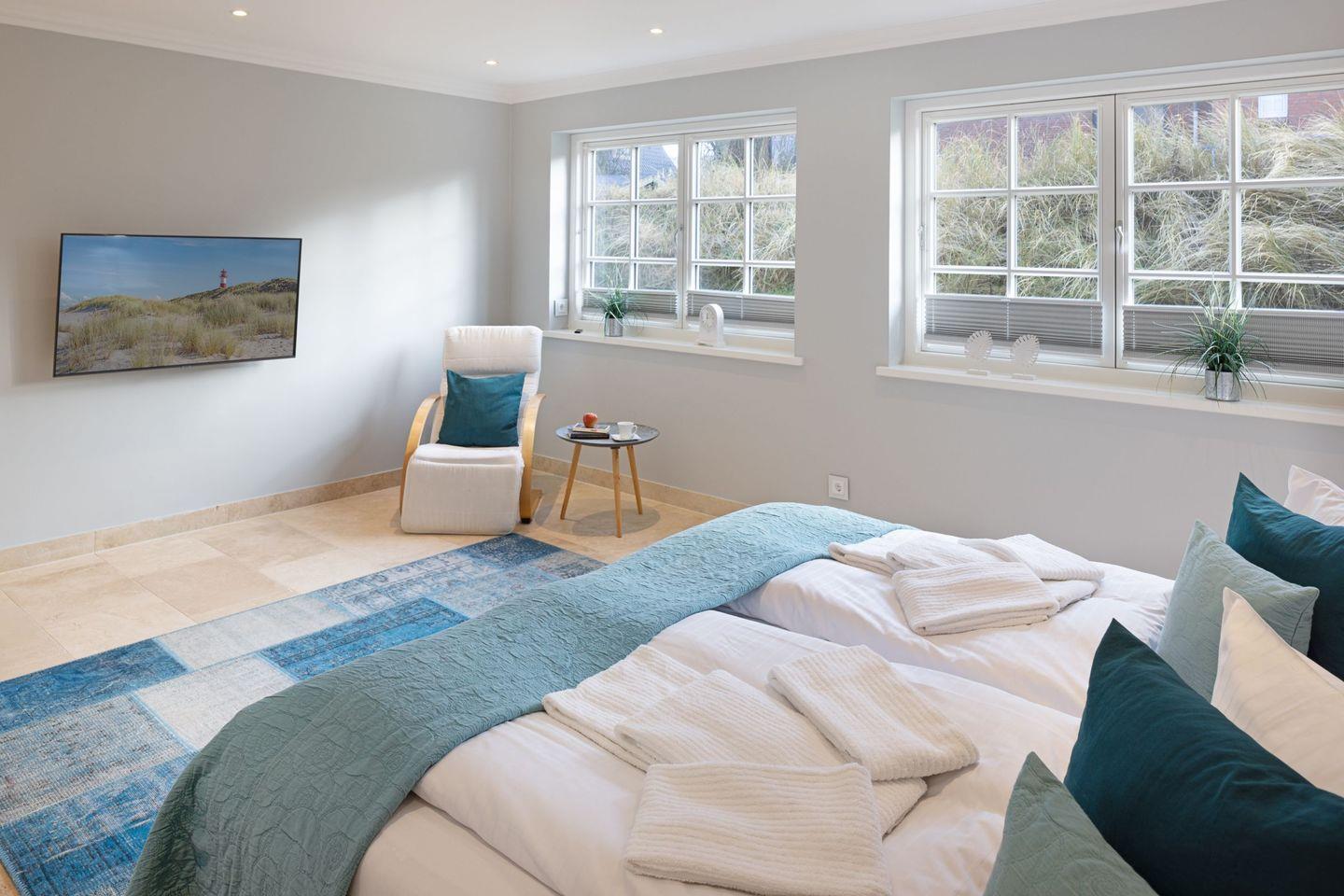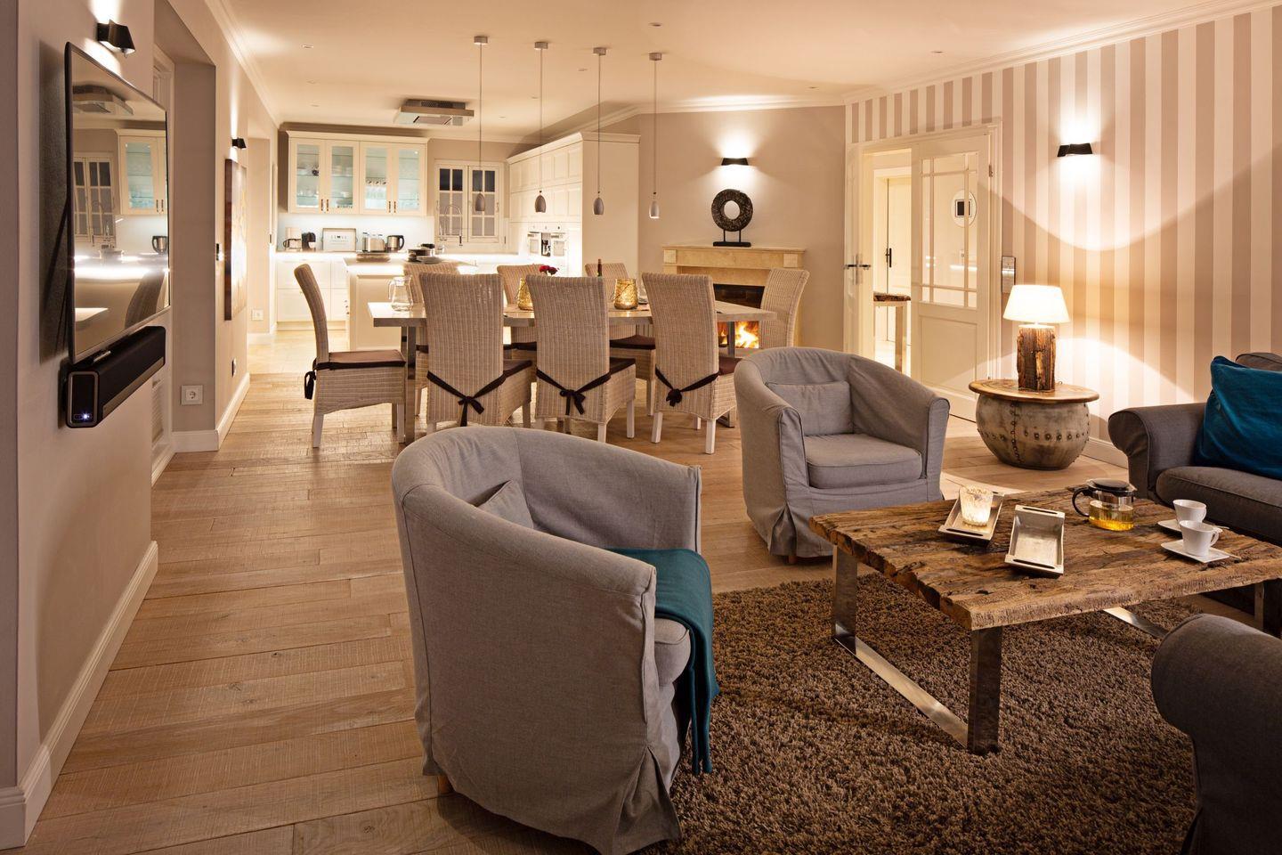 Die Syltresidenz ist mit vier gemütlichen Schlafzimmern ausgestattet, die Ihnen höchster Schlafkomfort bieten. Jedes Zimmer ist liebevoll eingerichtet und sorgt für eine entspannte Atmosphäre. Mit drei modernen Badezimmern und einem Gäste-WC müssen Sie sich nie um lange Wartezeiten kümmern – ideal für einen erholsamen Urlaub mit mehreren Personen. Das offene Wohnzimmer ist das Herzstück der Wohnung, ausgestattet mit einer komfortablen Sofaecke, einem modernen Kaminofen und einem Entertainment-Bereich mit insgesamt sechs Fernsehern und einer HiFi-Anlage, die für gemütliche Abende sorgen.