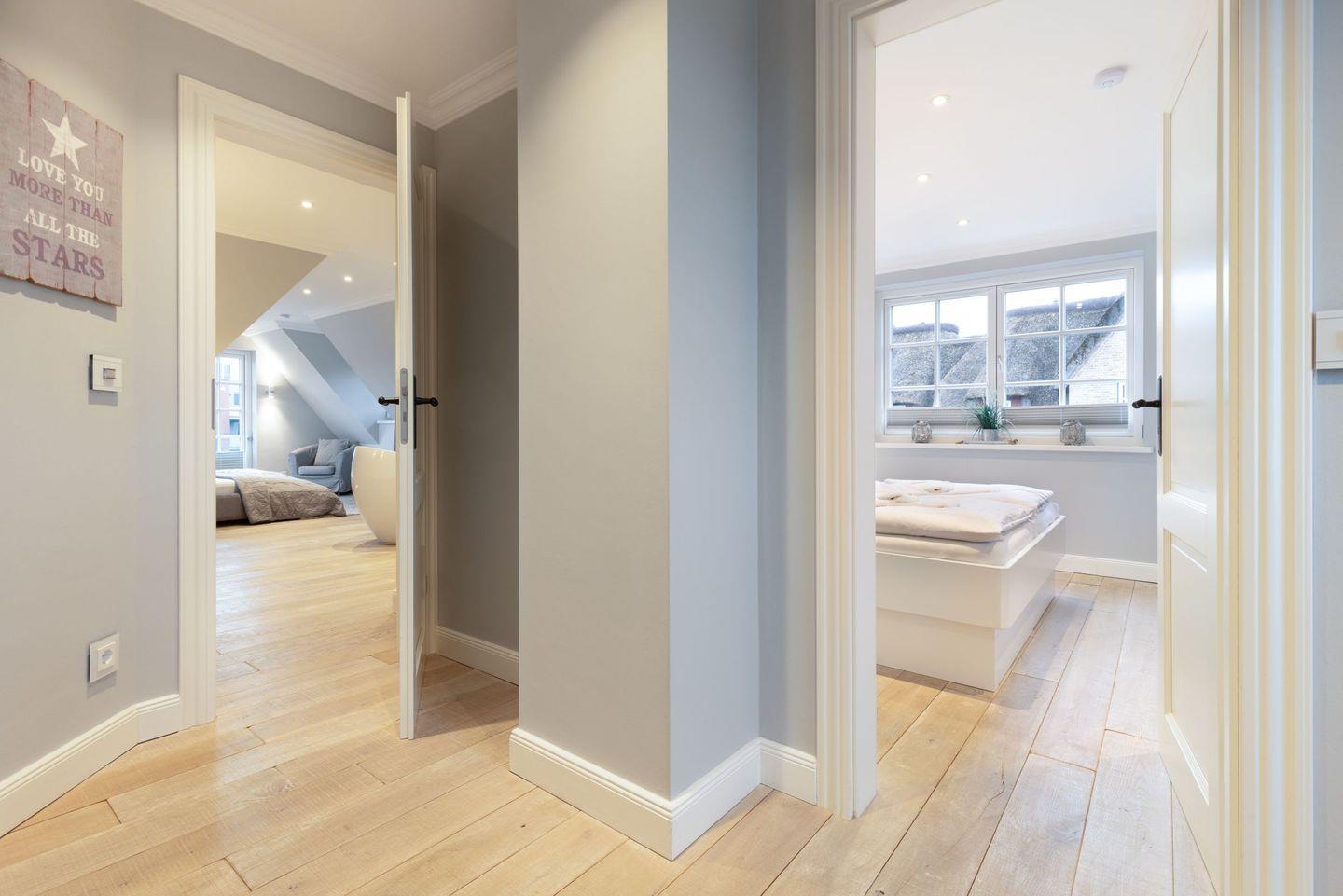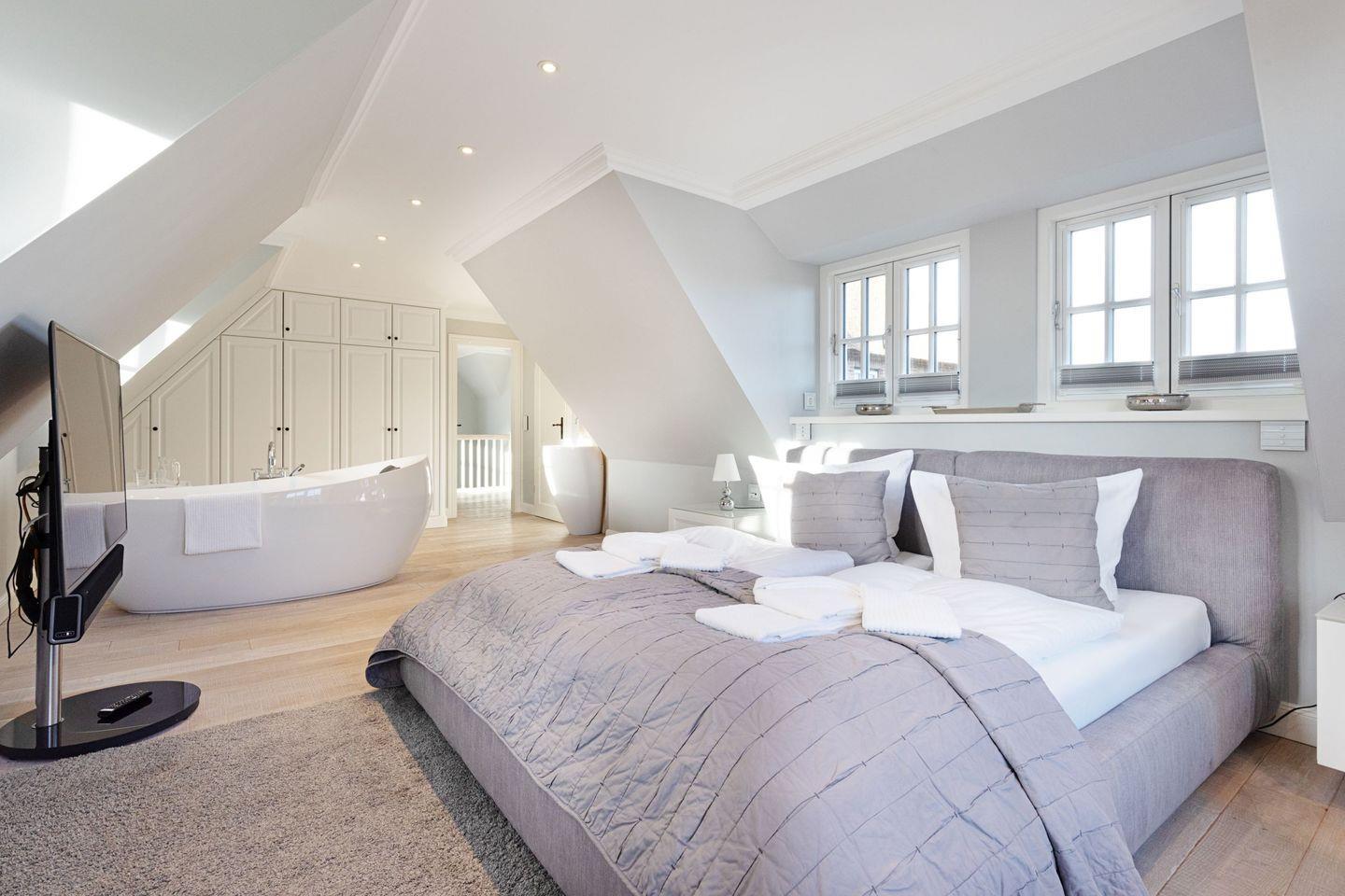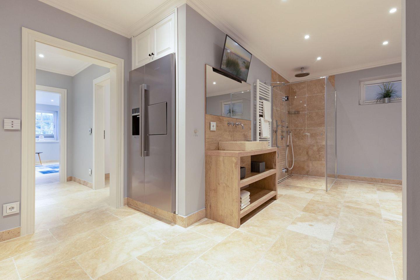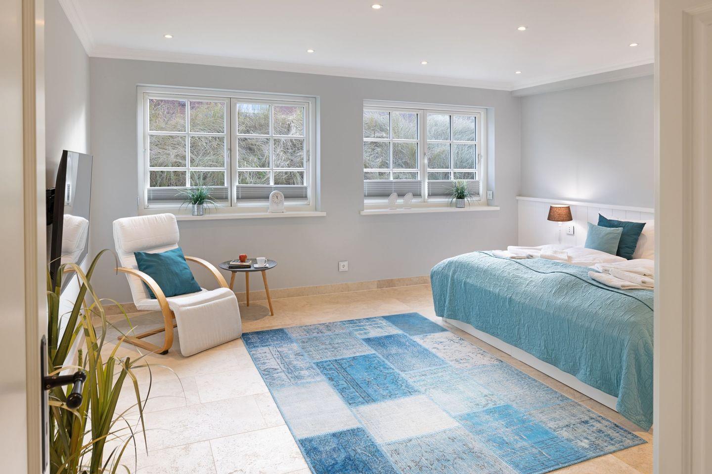 Die Syltresidenz ist mit vier gemütlichen Schlafzimmern ausgestattet, die Ihnen höchster Schlafkomfort bieten. Jedes Zimmer ist liebevoll eingerichtet und sorgt für eine entspannte Atmosphäre. Mit drei modernen Badezimmern und einem Gäste-WC müssen Sie sich nie um lange Wartezeiten kümmern – ideal für einen erholsamen Urlaub mit mehreren Personen. Das offene Wohnzimmer ist das Herzstück der Wohnung, ausgestattet mit einer komfortablen Sofaecke, einem modernen Kaminofen und einem Entertainment-Bereich mit insgesamt sechs Fernsehern und einer HiFi-Anlage, die für gemütliche Abende sorgen.