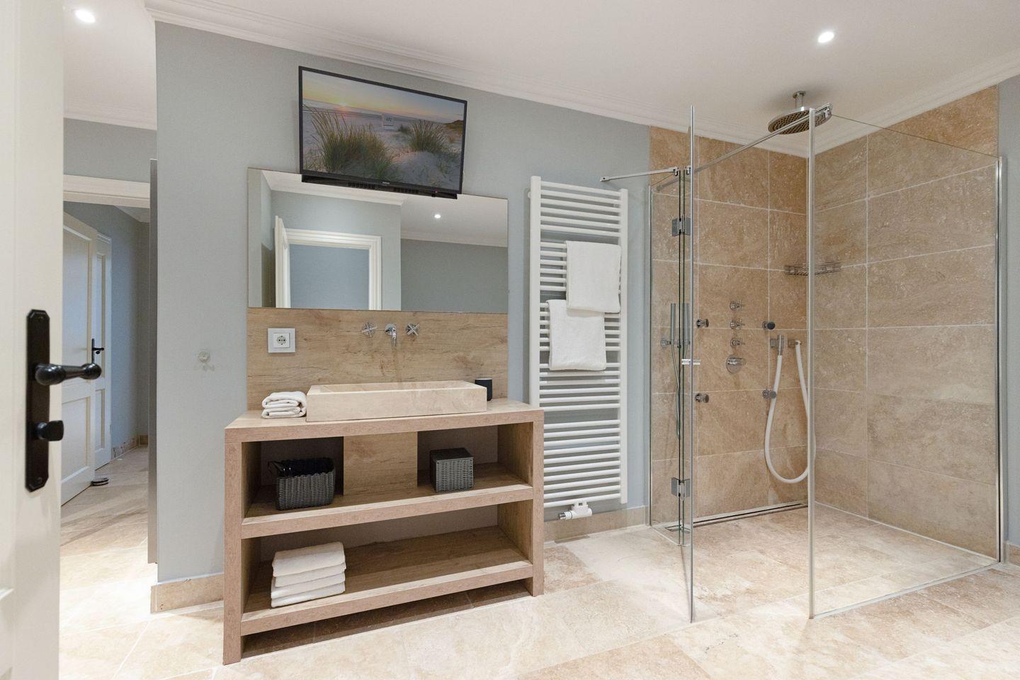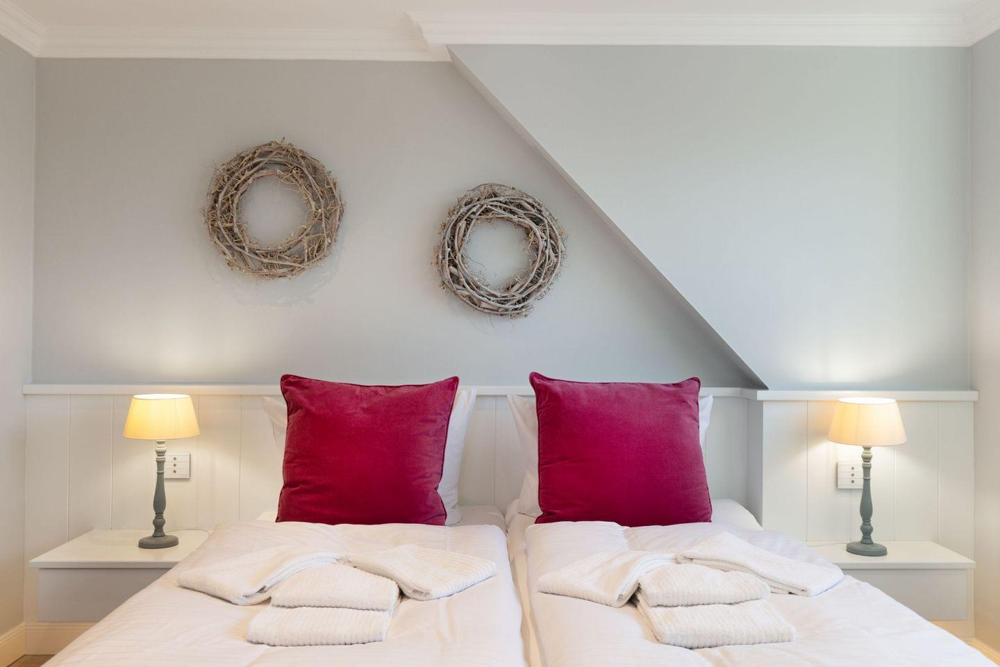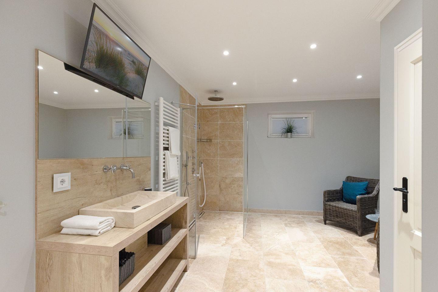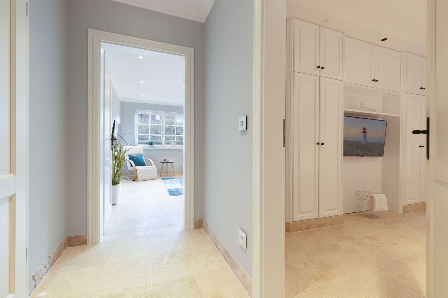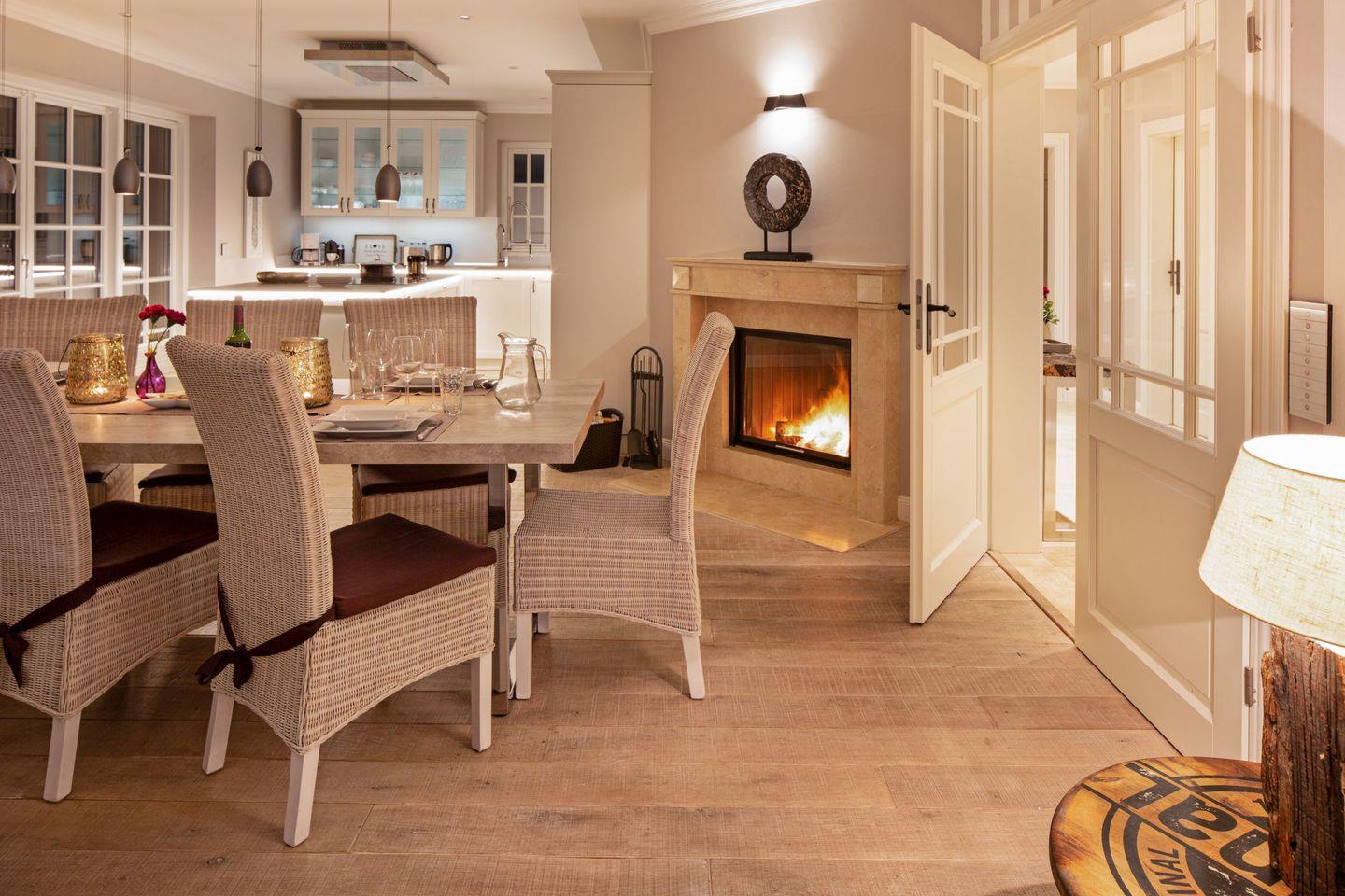 Die Syltresidenz ist mit vier gemütlichen Schlafzimmern ausgestattet, die Ihnen höchster Schlafkomfort bieten. Jedes Zimmer ist liebevoll eingerichtet und sorgt für eine entspannte Atmosphäre. Mit drei modernen Badezimmern und einem Gäste-WC müssen Sie sich nie um lange Wartezeiten kümmern – ideal für einen erholsamen Urlaub mit mehreren Personen. Das offene Wohnzimmer ist das Herzstück der Wohnung, ausgestattet mit einer komfortablen Sofaecke, einem modernen Kaminofen und einem Entertainment-Bereich mit insgesamt sechs Fernsehern und einer HiFi-Anlage, die für gemütliche Abende sorgen.