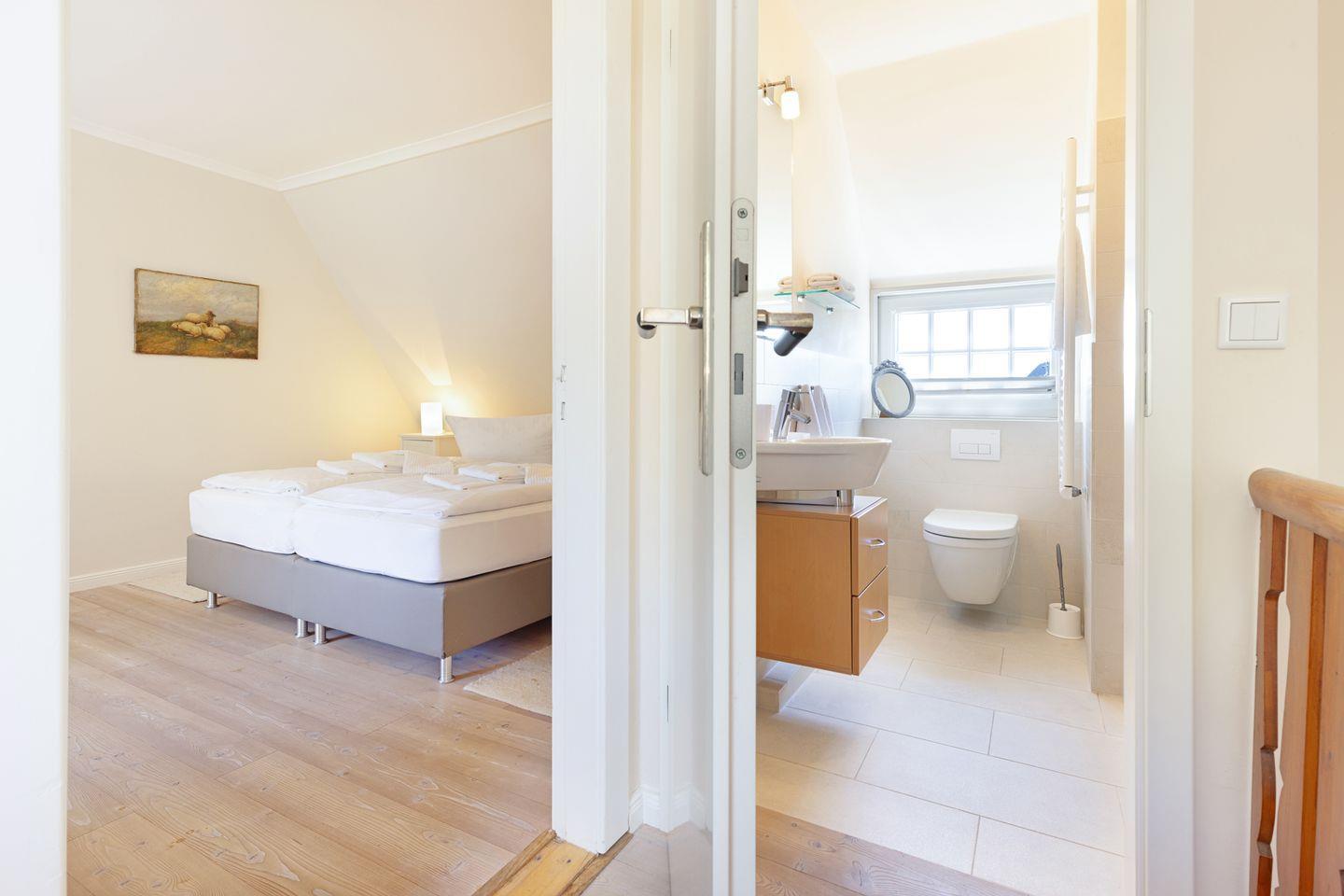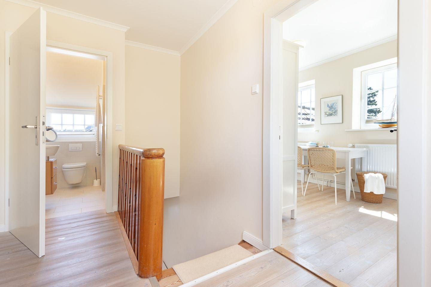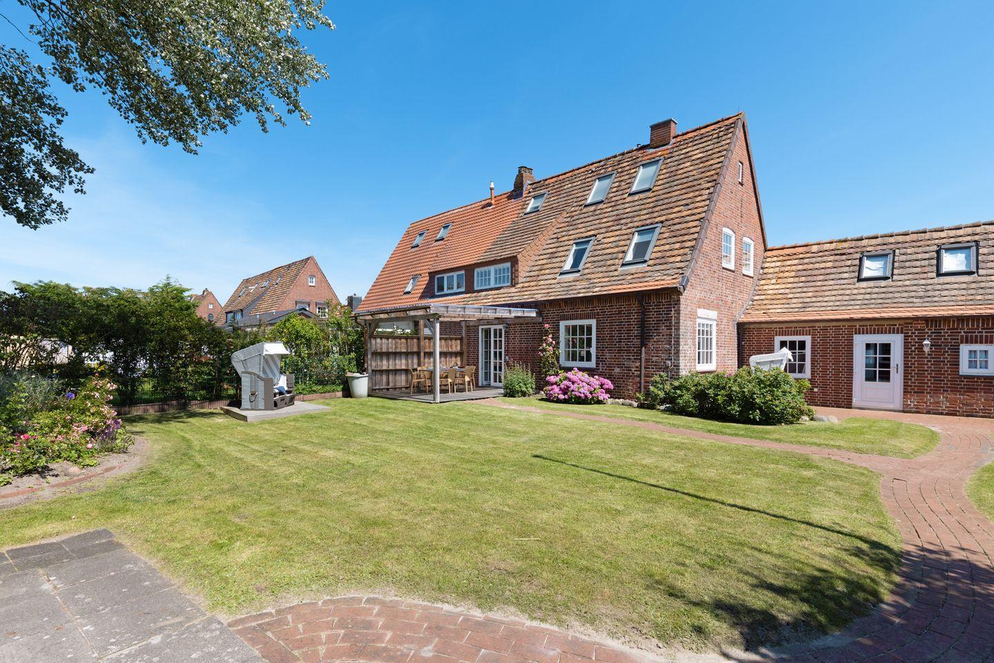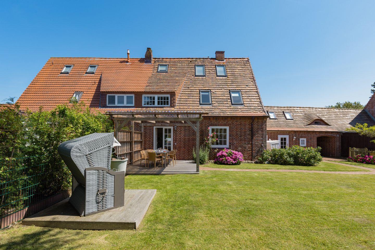 Zwei Badezimmer mit Dusche und ein Gäste-WC, sowie die große Küche mit guter Ausstattung. Sie haben einen eigenen Garten mit großer Liegewiese und Strandkorb und eine überdachte Terrasse. Ein Einstellplatz für Fahrräder und 2 PKW-Stellplätze befinden sich am Haus.
