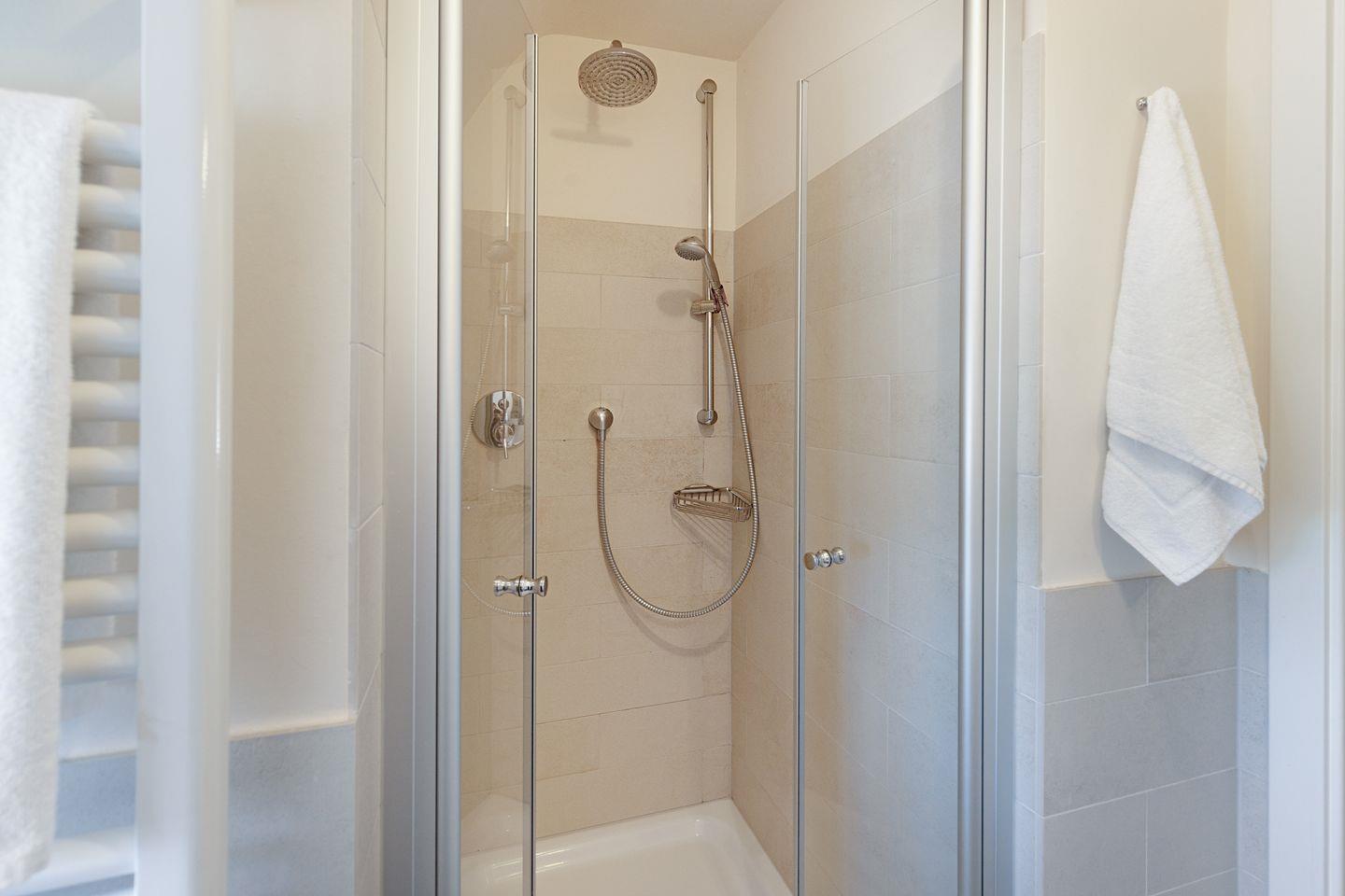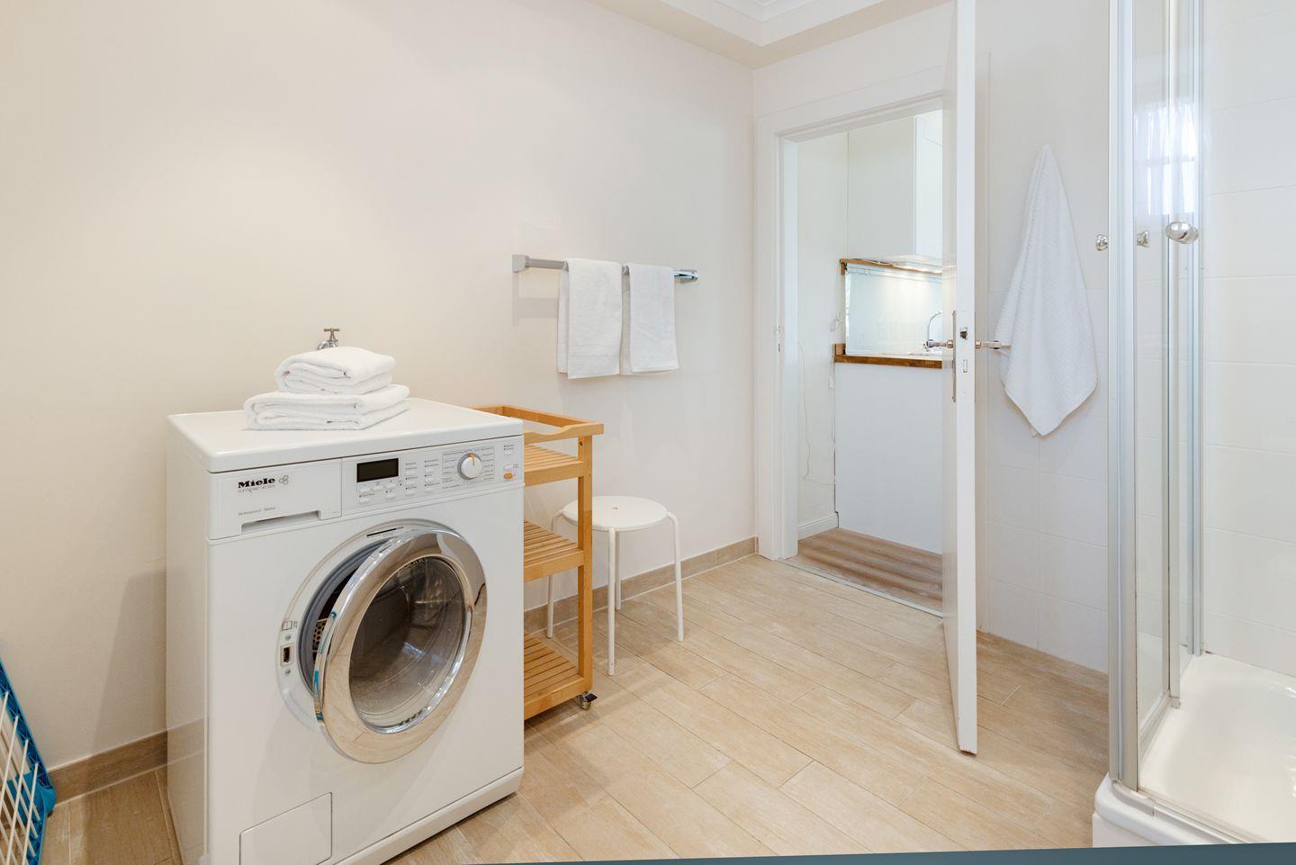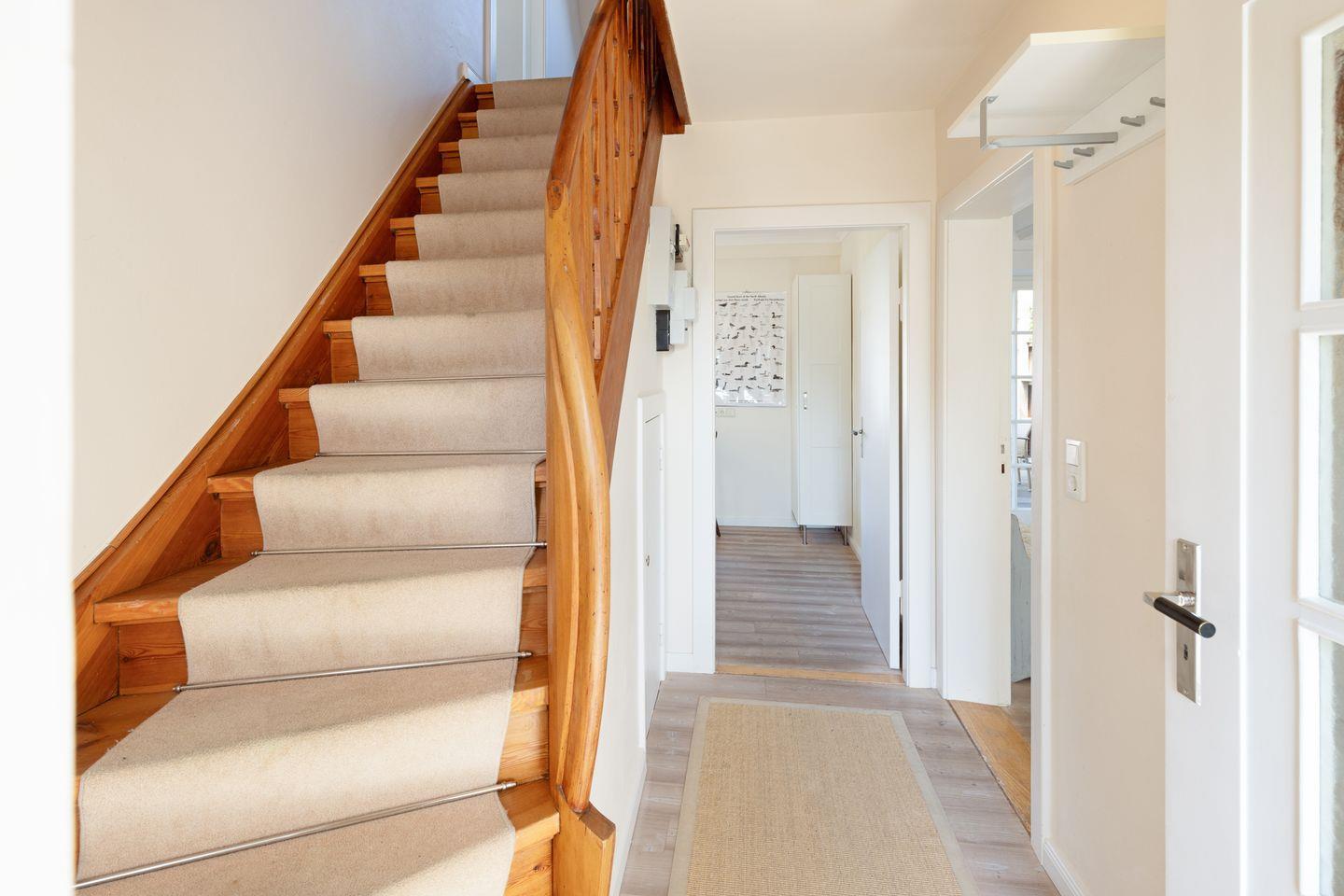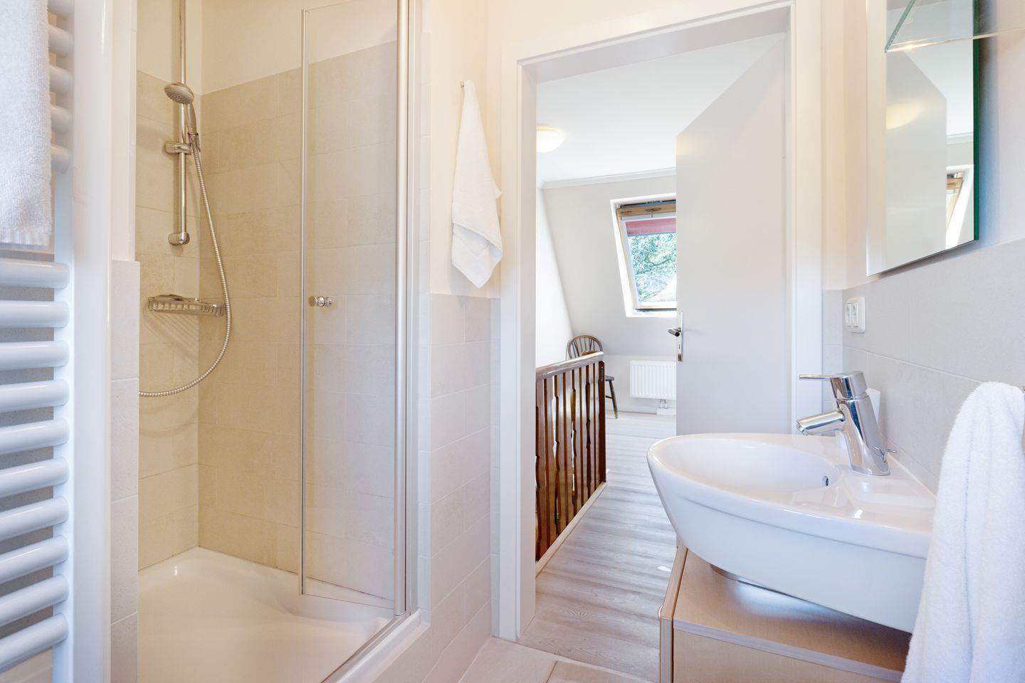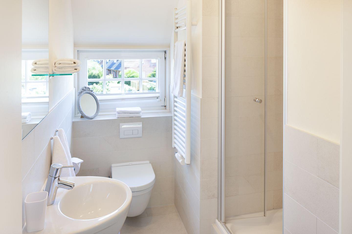 Zwei Badezimmer mit Dusche und ein Gäste-WC, sowie die große Küche mit guter Ausstattung. Sie haben einen eigenen Garten mit großer Liegewiese und Strandkorb und eine überdachte Terrasse. Ein Einstellplatz für Fahrräder und 2 PKW-Stellplätze befinden sich am Haus.