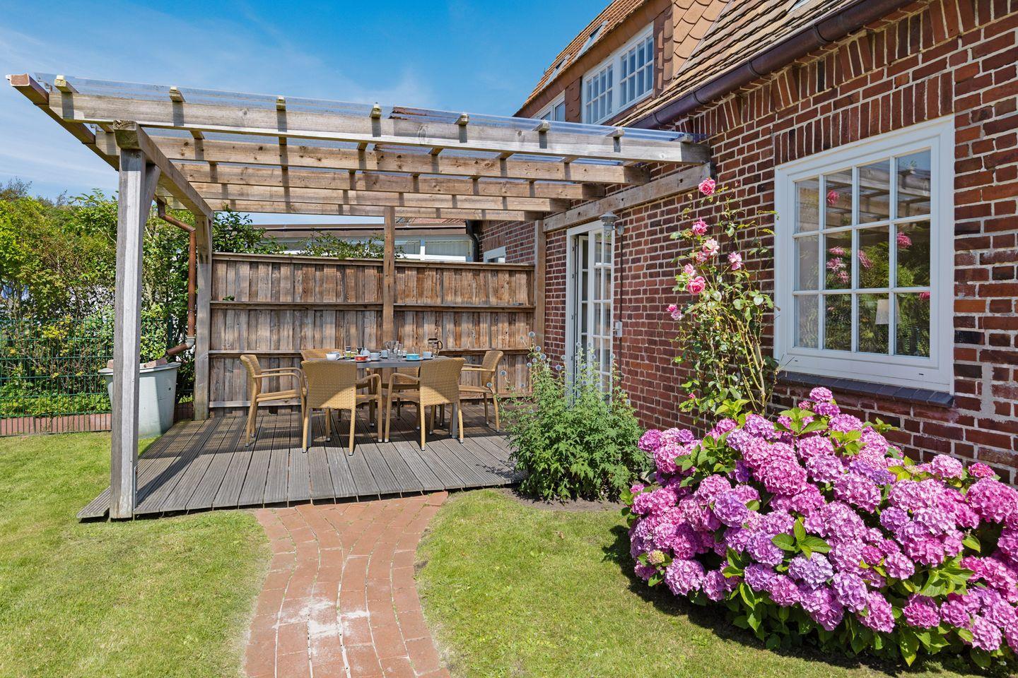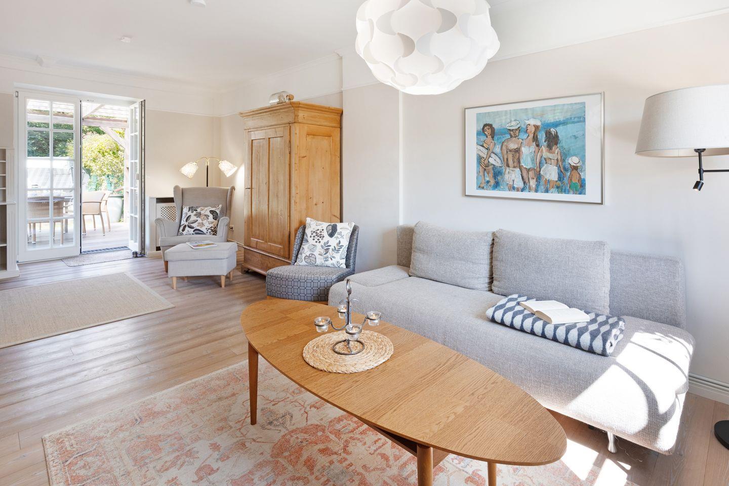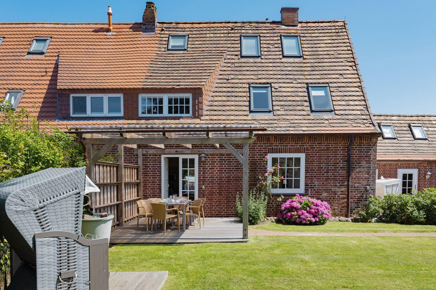 Individuell eingerichtetes Ferienreihenhaus mit Holzfußböden ausgestattet für bis zu sieben Personen mit Garten, großer Liegewiese und Strandkorb.