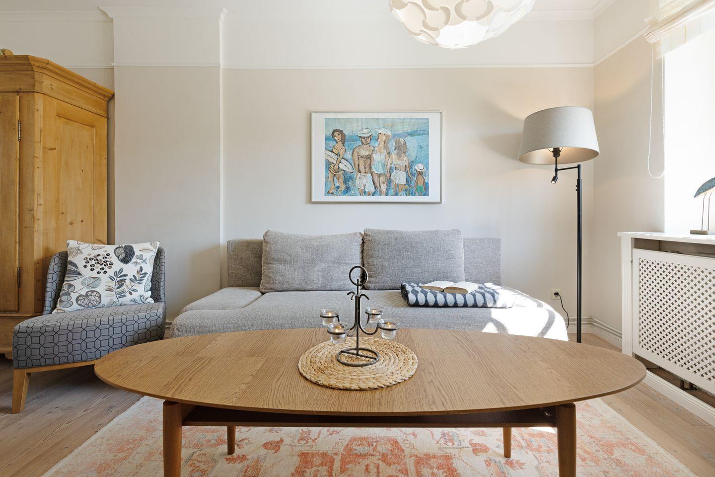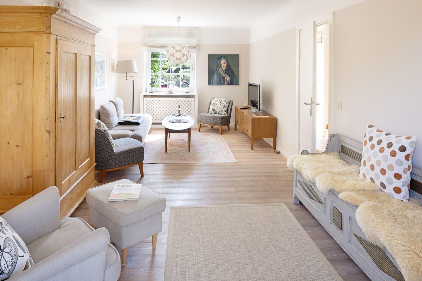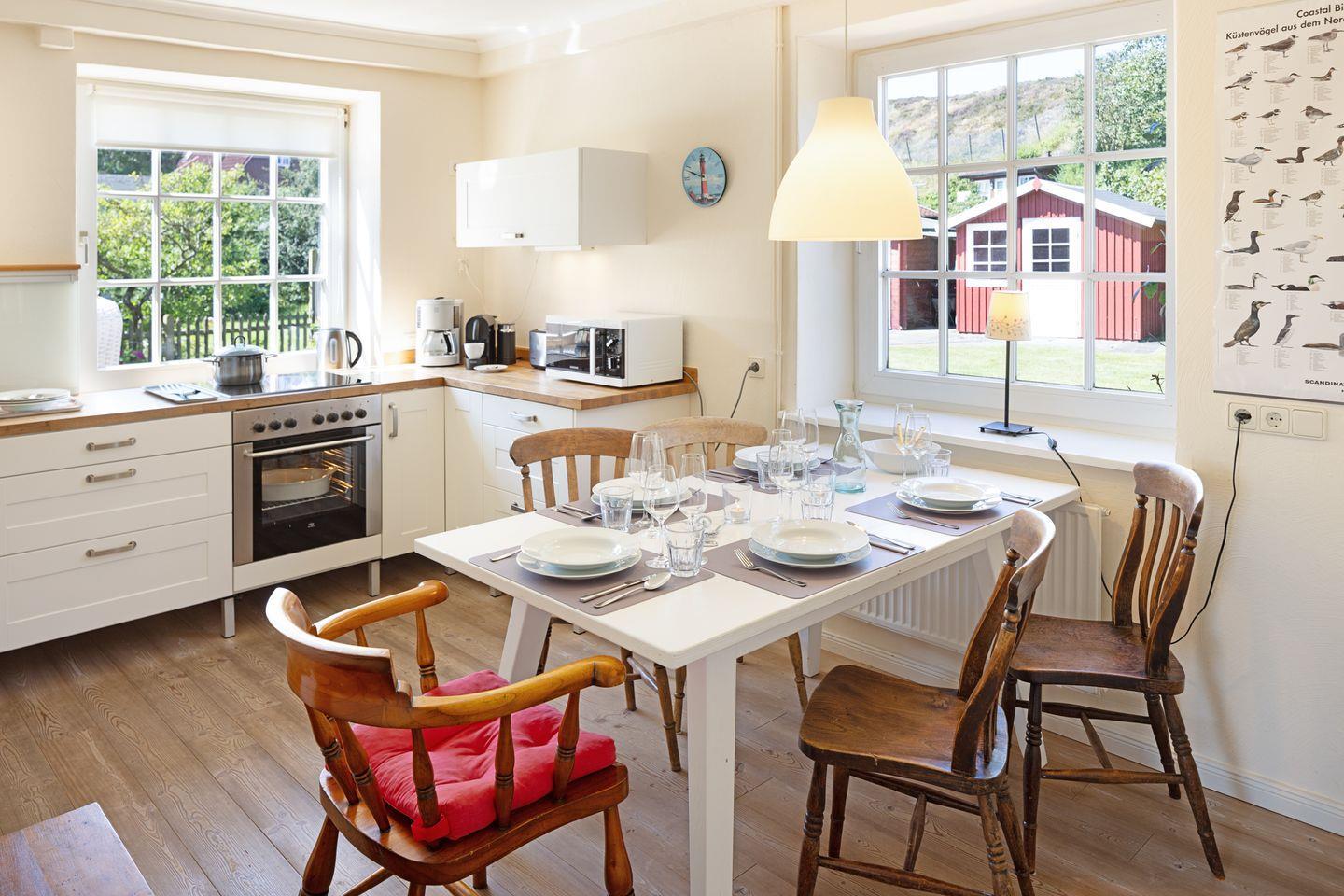 Individuell eingerichtetes Ferienreihenhaus mit Holzfußböden ausgestattet für bis zu sieben Personen mit Garten, großer Liegewiese und Strandkorb.