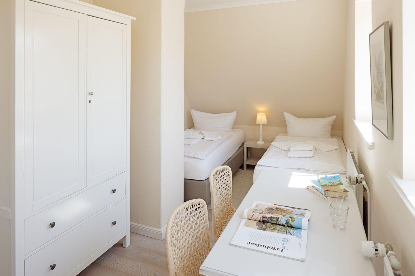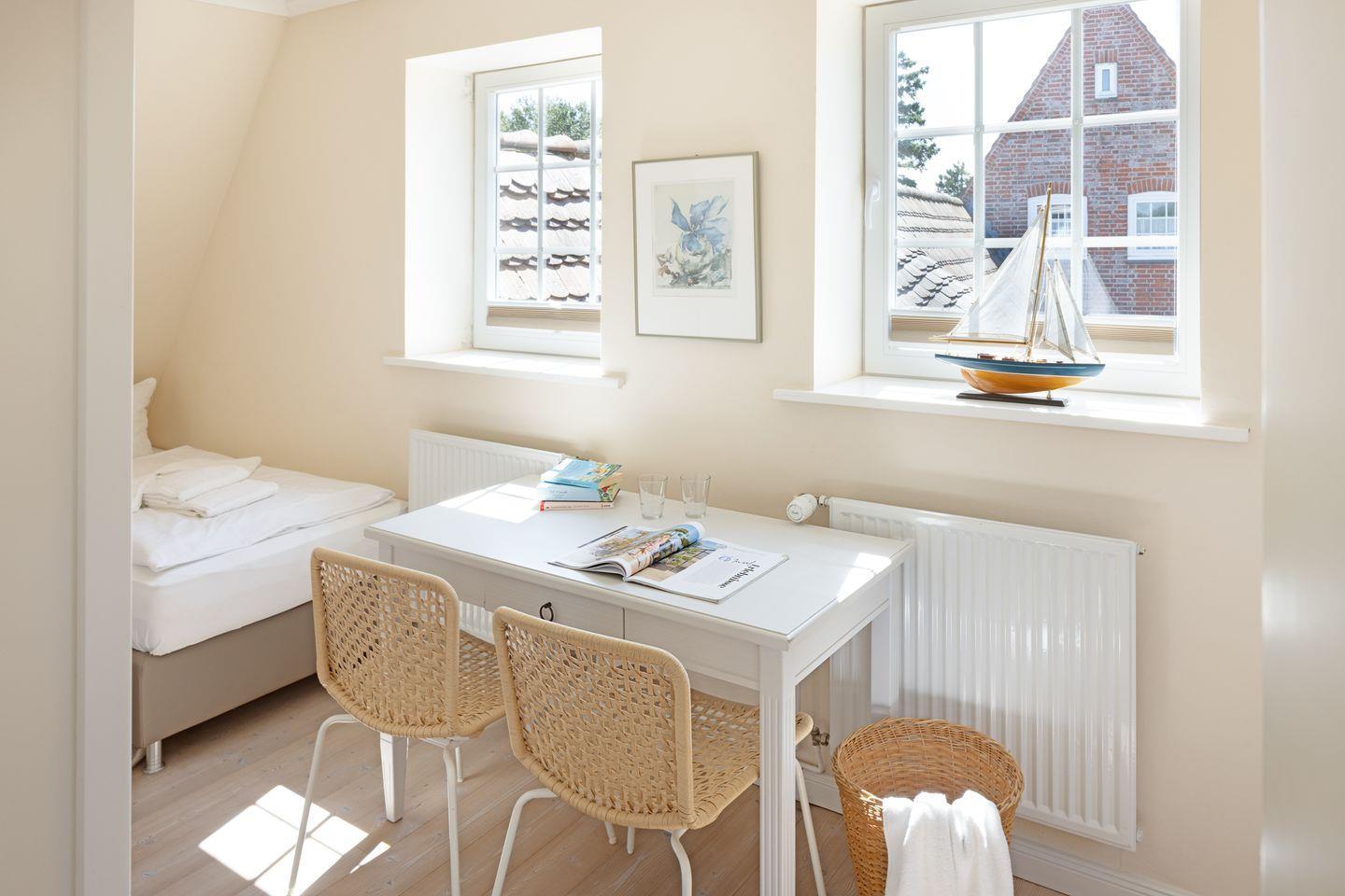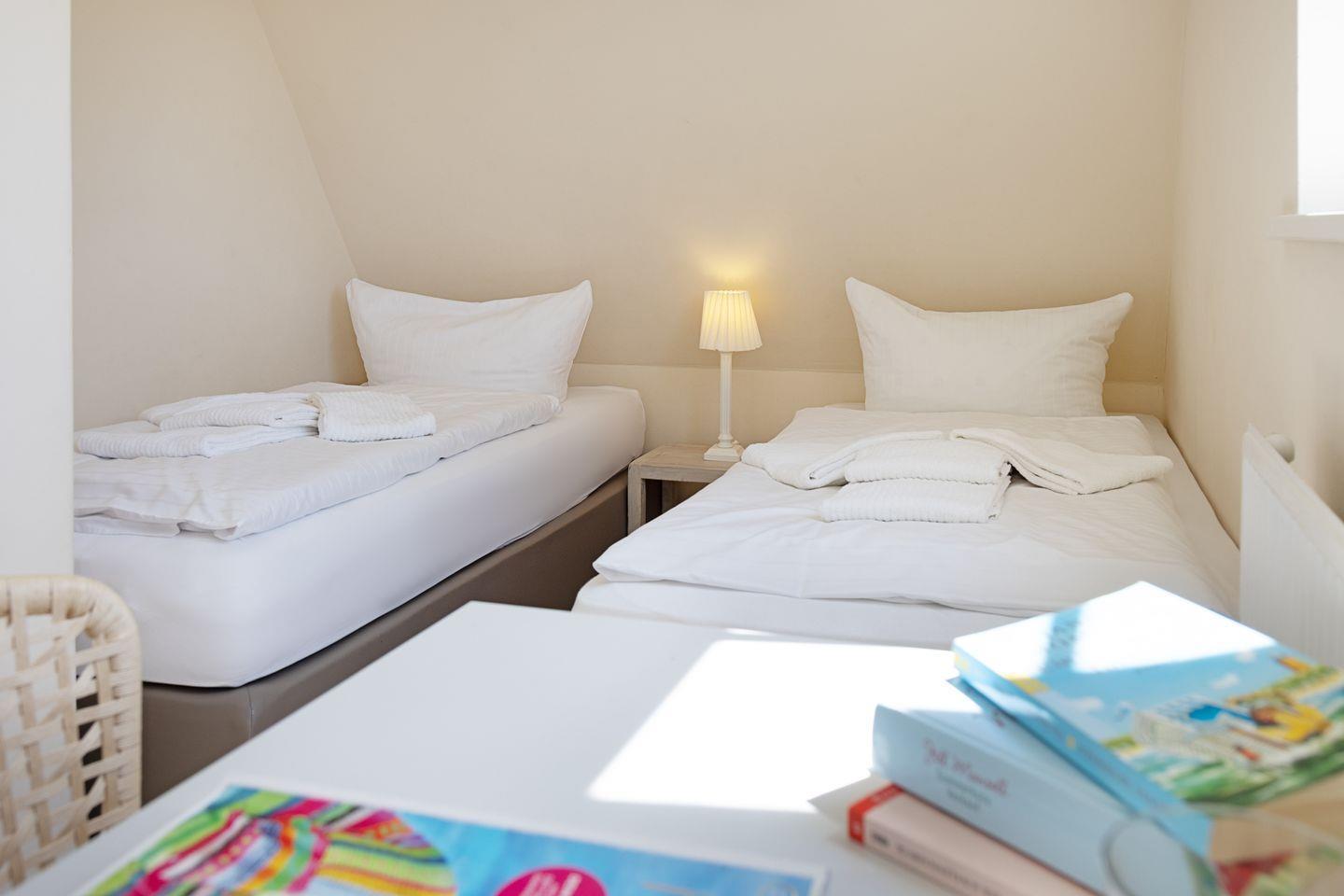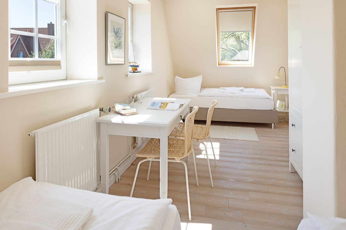 Das individuell eingerichtete Ferienreihenhaus ist mit Holzfußböden ausgestattet und verfügt über ein Schlafzimmer mit Doppelbett, ein Schlafzimmer mit drei Einzelbetten und einem Schlafzimmer mit zwei Einzelbetten.