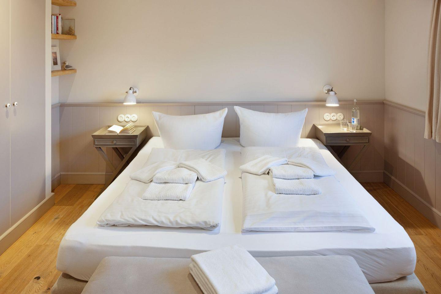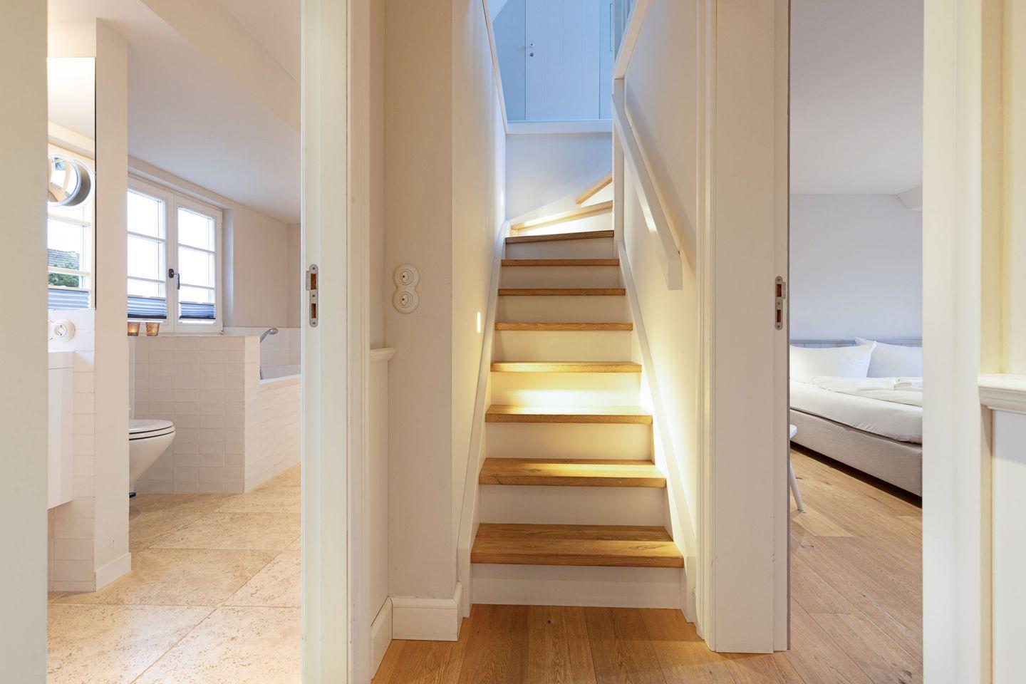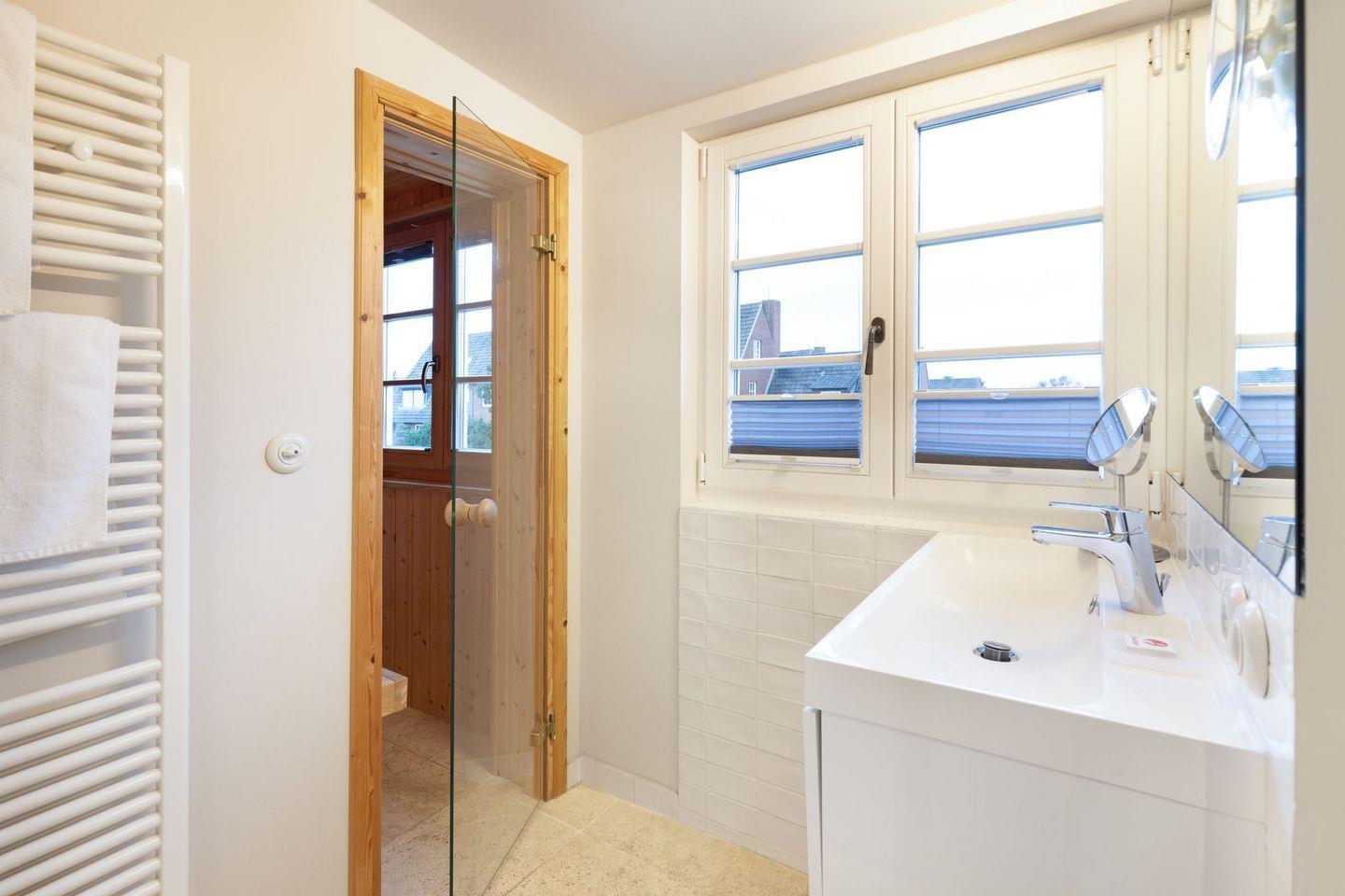 Im Erdgeschoss befindet sich der großzügige Wohn-Essbereich mit offener Küche über den Sie auf die große Sonnenterrasse und in den Garten gelangen. Im EG befindet sich auch ein Duschbad. Im 1.OG ist ein Schlafzimmer mit einem Doppelbett, ein Schlafzimmer mit zwei Einzelbetten und ein großes Wannen/Duschbad mit Sauna. Ein drittes Schlafzimmer mit Doppelbett befindet sich im Dachgeschoss.