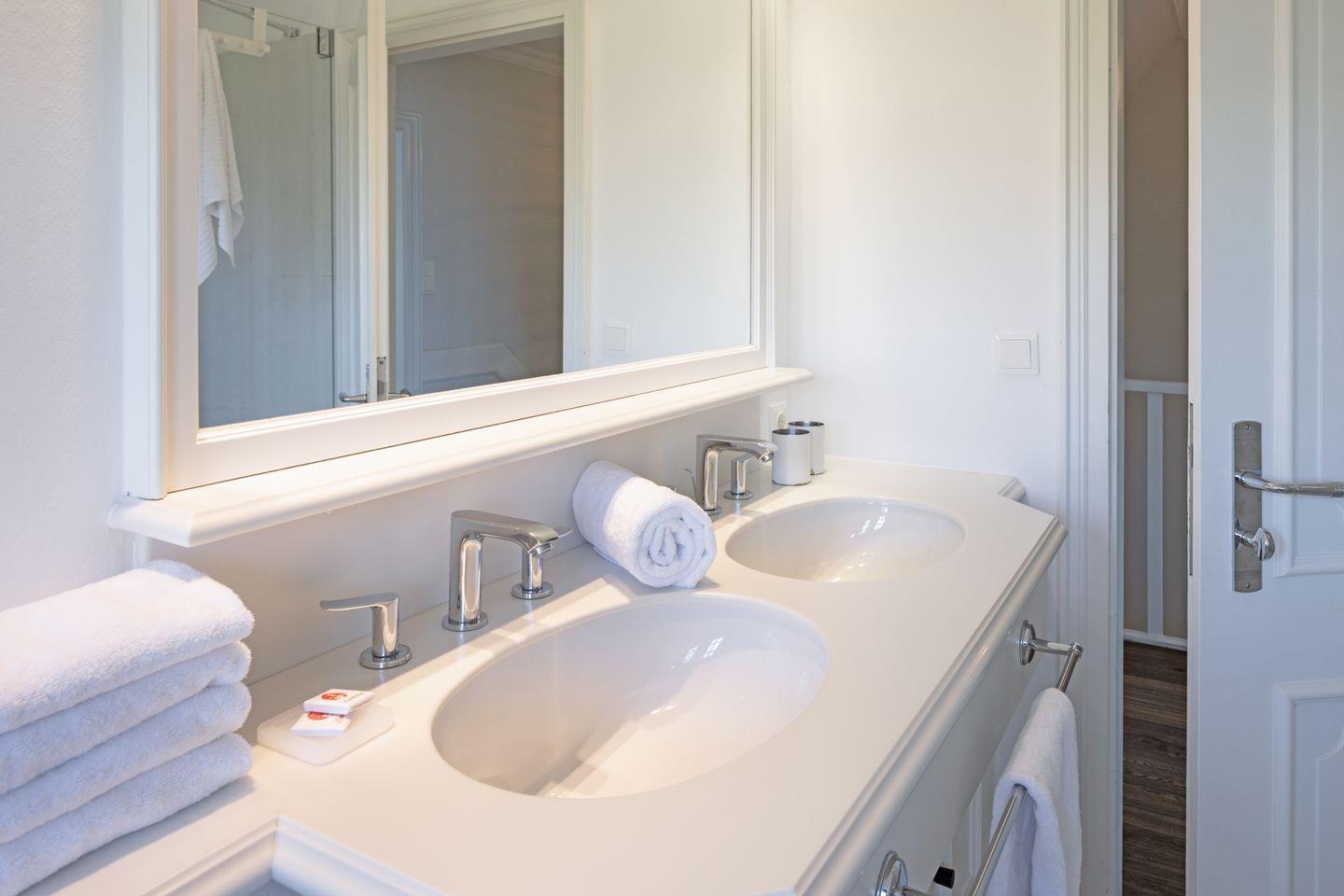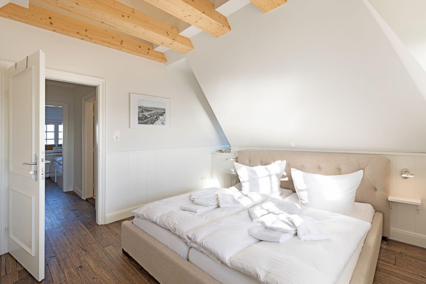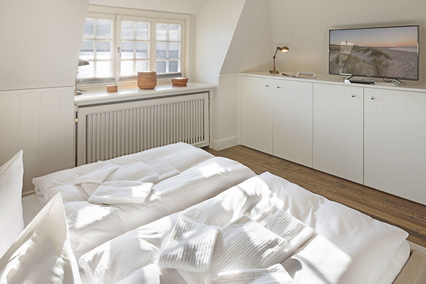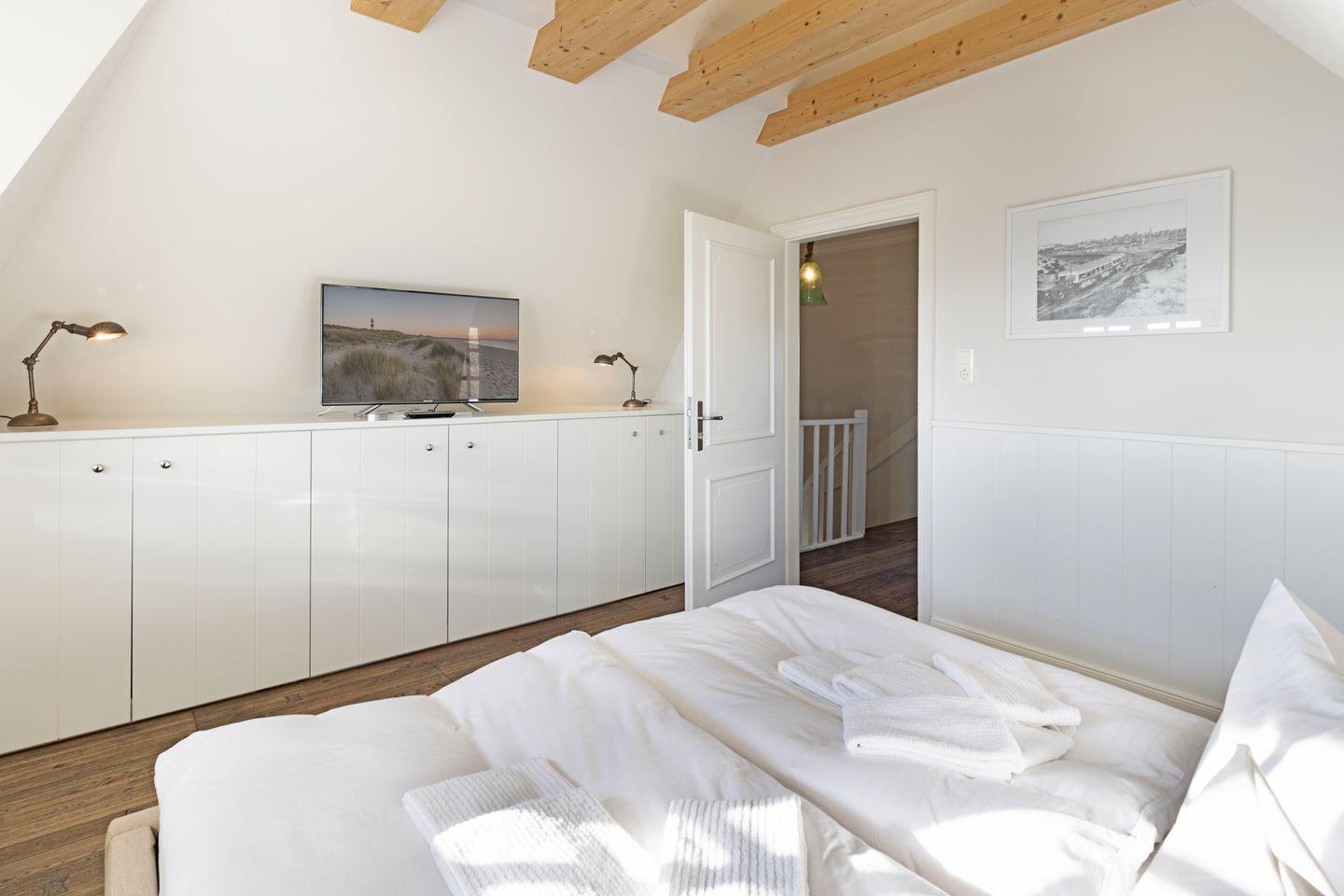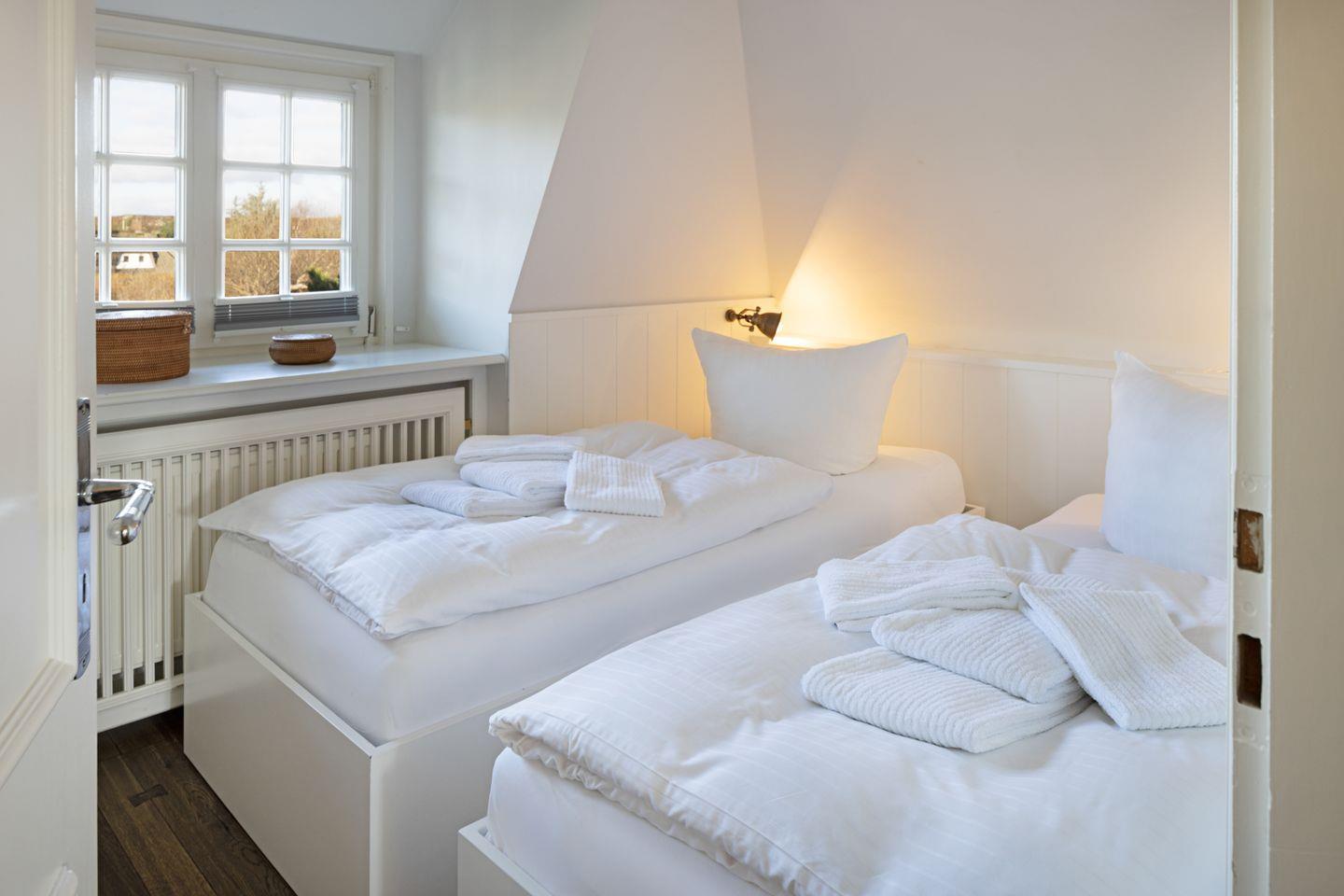 Die beiden Schlafzimmer liegen in der ersten Etage und verfügen über ein Doppelbett bzw. zwei Einzelbetten und ein Bad auf dem Flur.