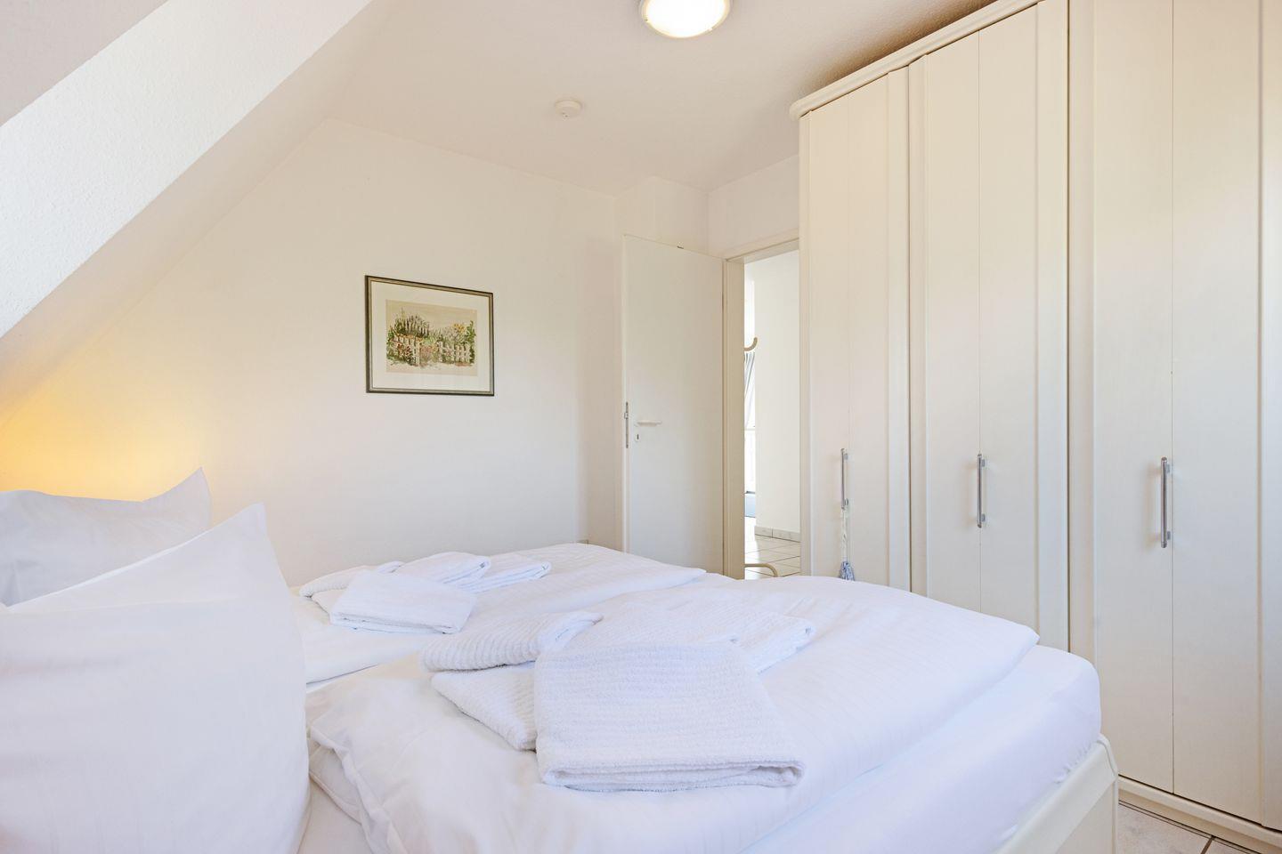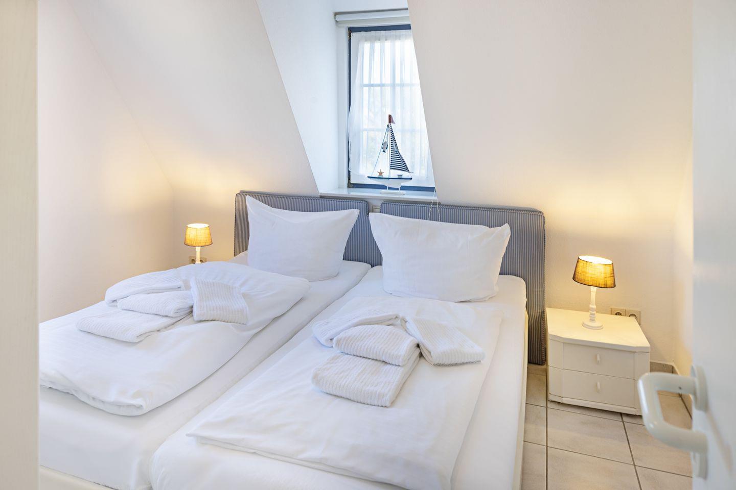 Ein Schlafzimmer ist mit einem Doppelbett und ein Schlafzimmer mit zwei Einzelbetten ausgestattet.