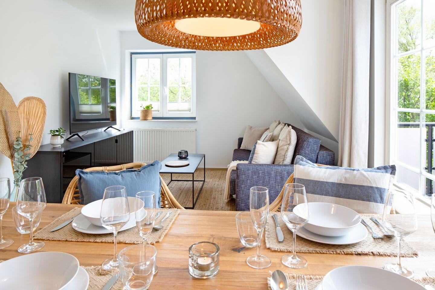 offen gestalteten Wohnbereich mit gemütlicher Sofaecke und Essplatz – ideal für entspannte