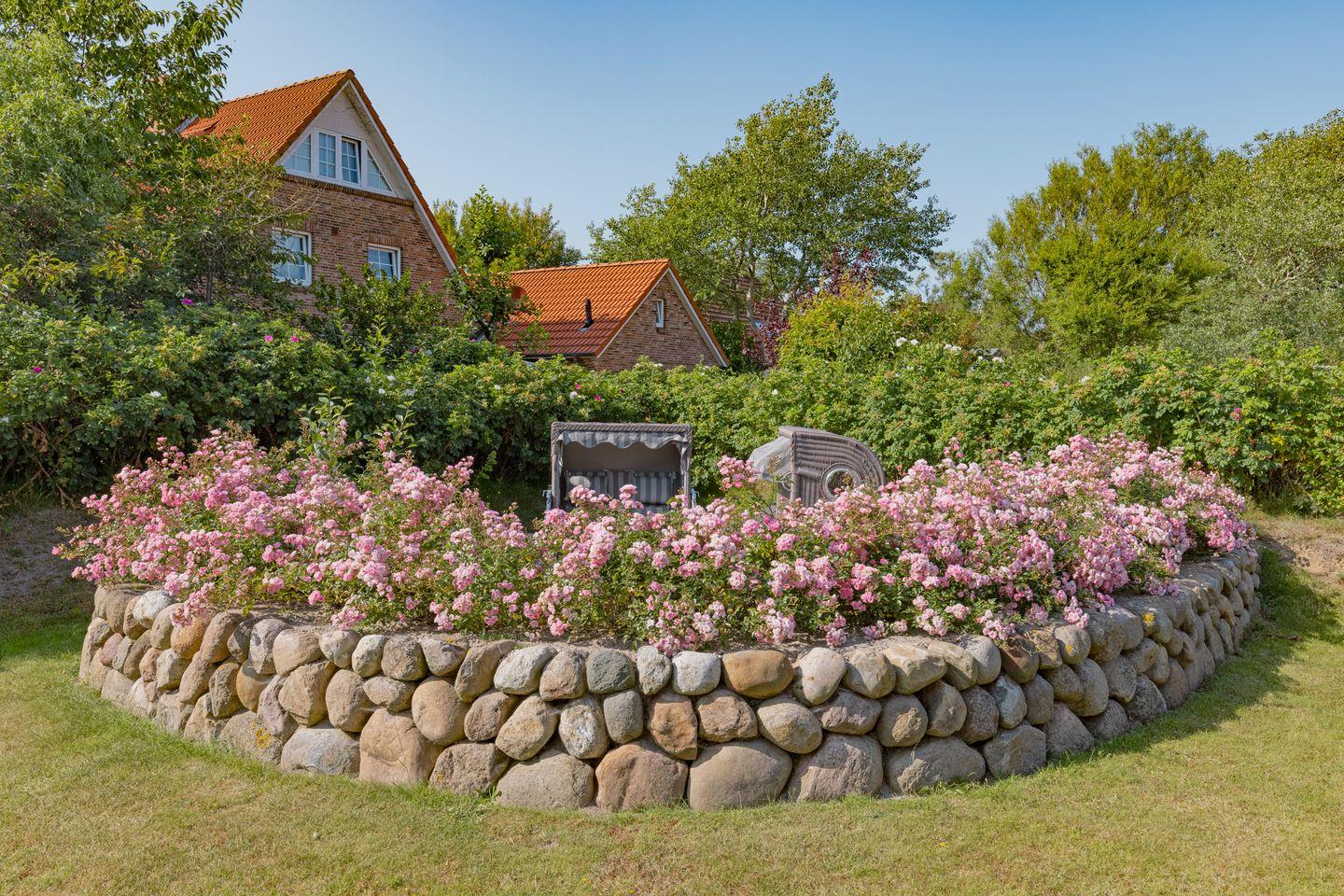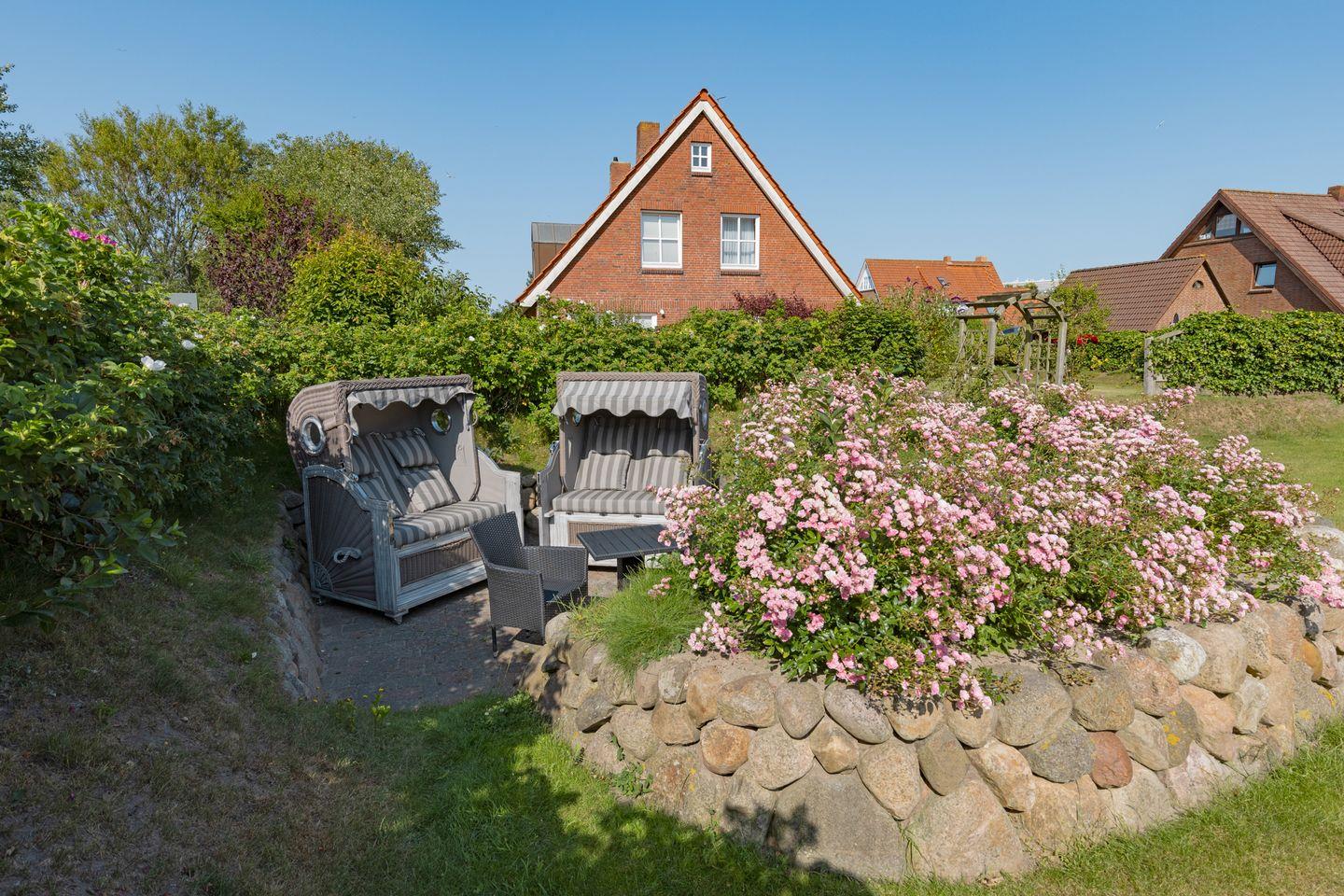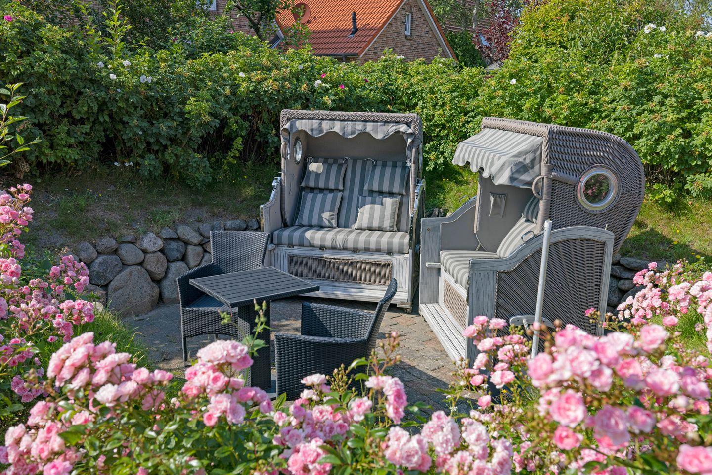 Gartenmöbel und Strandkörbe stehen Ihnen in einem windgeschützten, abgesenkten Gartenbereich, saisonal begrenzt zur Verfügung.