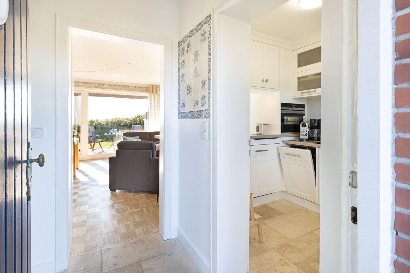 Über die Terrassentür im Wohnbereich kommen Sie in den Garten mit Meerblick.