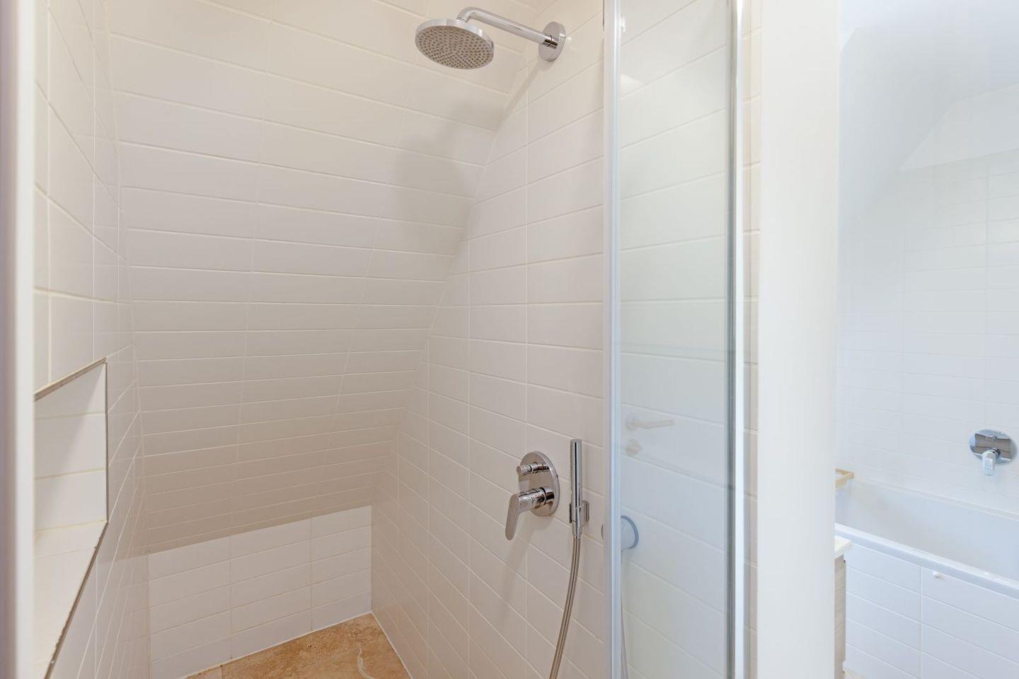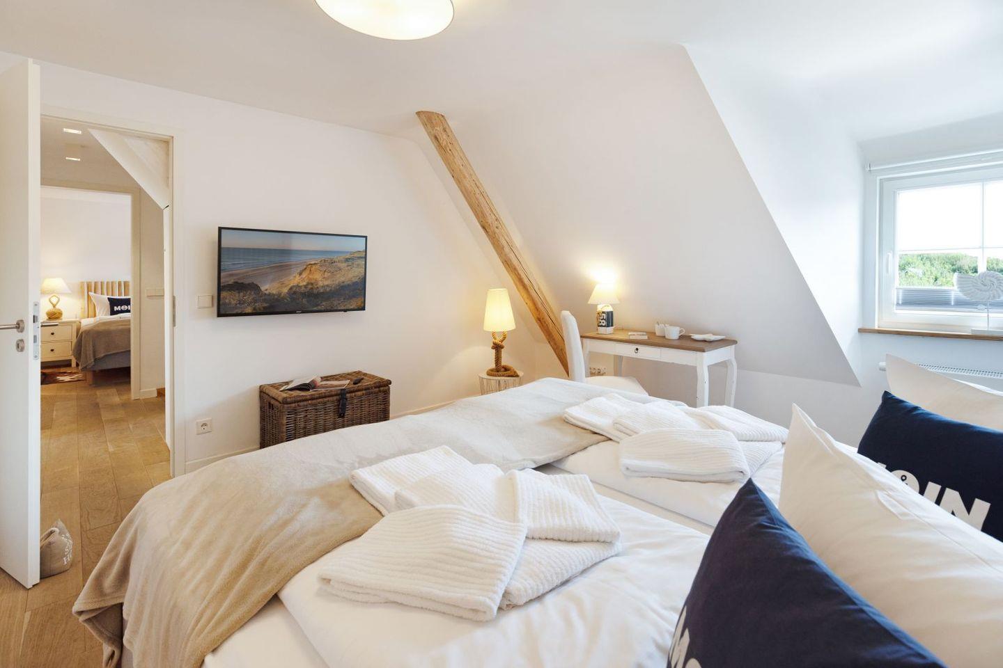 Im Erdgeschoss befindet sich ein Masterbedroom mit Doppelbett und Duschbad en suite, im Obergeschoss zwei weitere Schlafzimmer mit Doppelbett