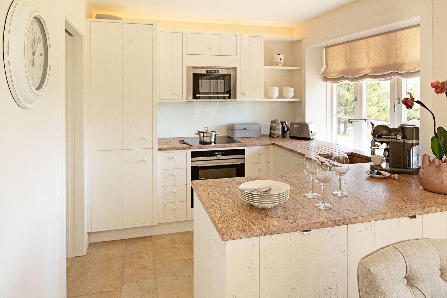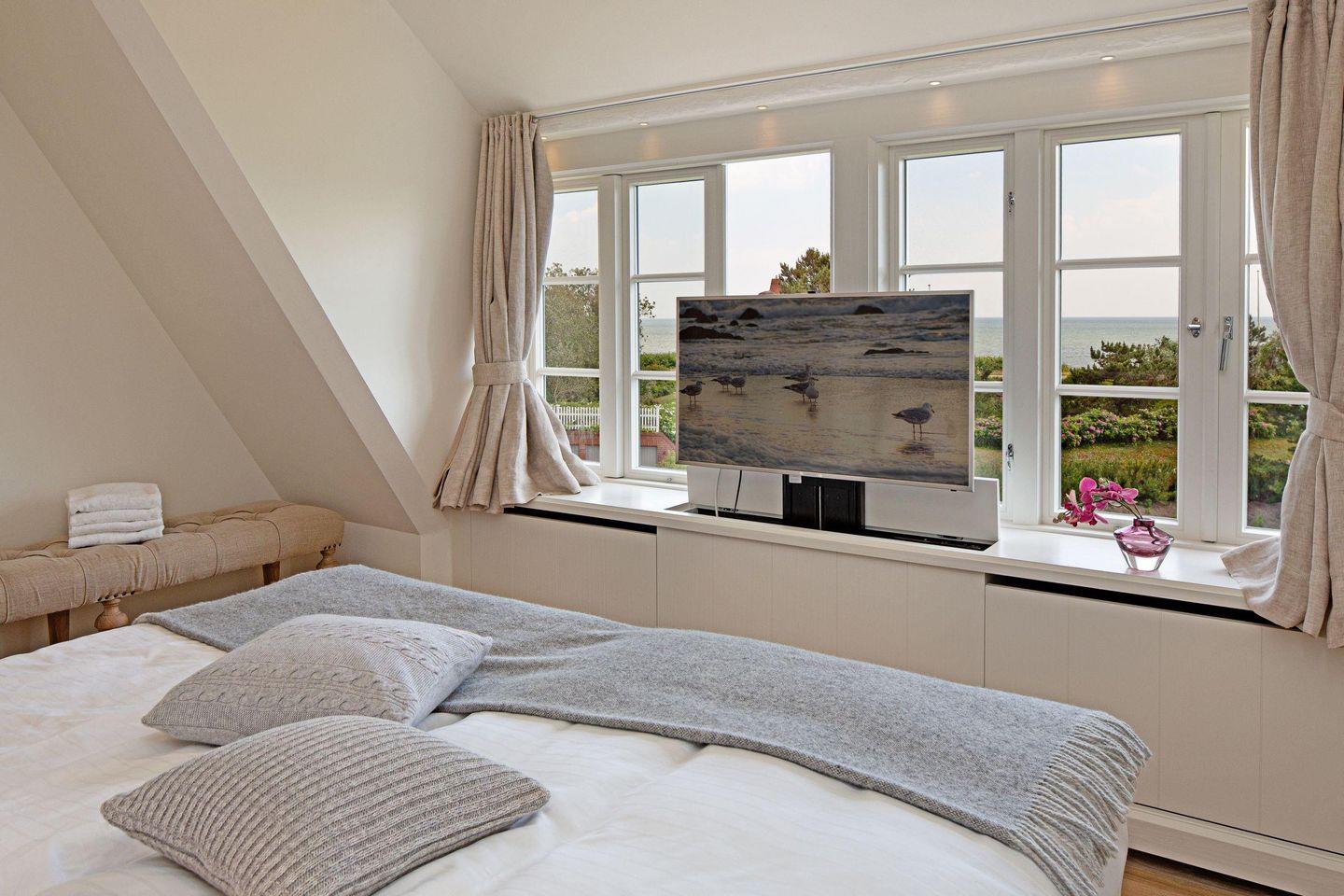 Das EG, im Beachflair gestaltet, bietet mit Gaskamin, offener Landhausküche und dem gemütlichen Fernseh- und Lesezimmer ausreichend Möglichkeiten zur individuellen Nutzung. In der ersten Etage befinden sich drei vollklimatisierte Schlafzimmer mit Doppelbetten und zwei Badezimmer. Ein zusätzliches Bad steht Ihnen im EG zur Verfügung. Vom Essbereich aus gelangen Sie auf die große Sonnenterrasse mit Meerblick. Der Garten geht nahtlos in den Heide-Naturpark über. Großzügig und kuschelig zugleich – ein Objekt, einfach unverwechselbar! Der Oststrand ist 100 m entfernt. Einzelgarage mit Ladestation für Elektrofahrzeuge (Wallbox) sowie Waschmaschine und Trockner sind vorhanden.
