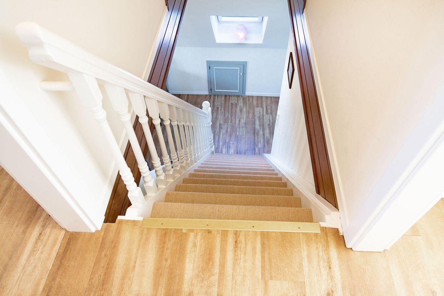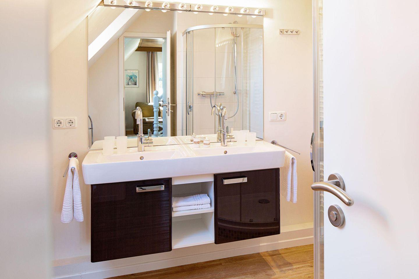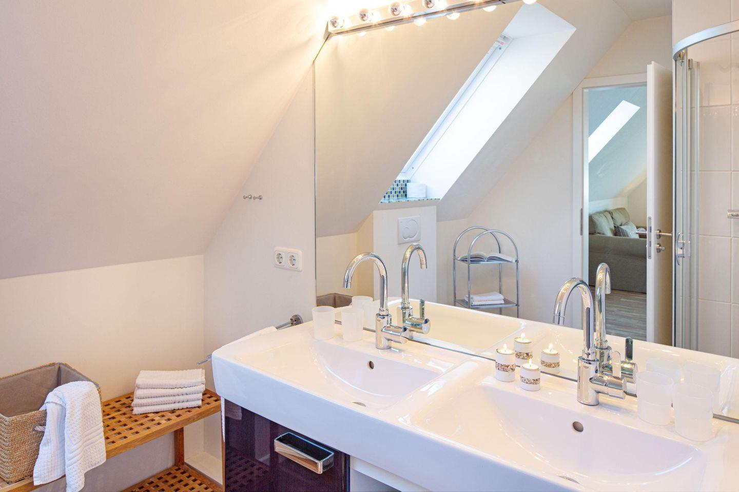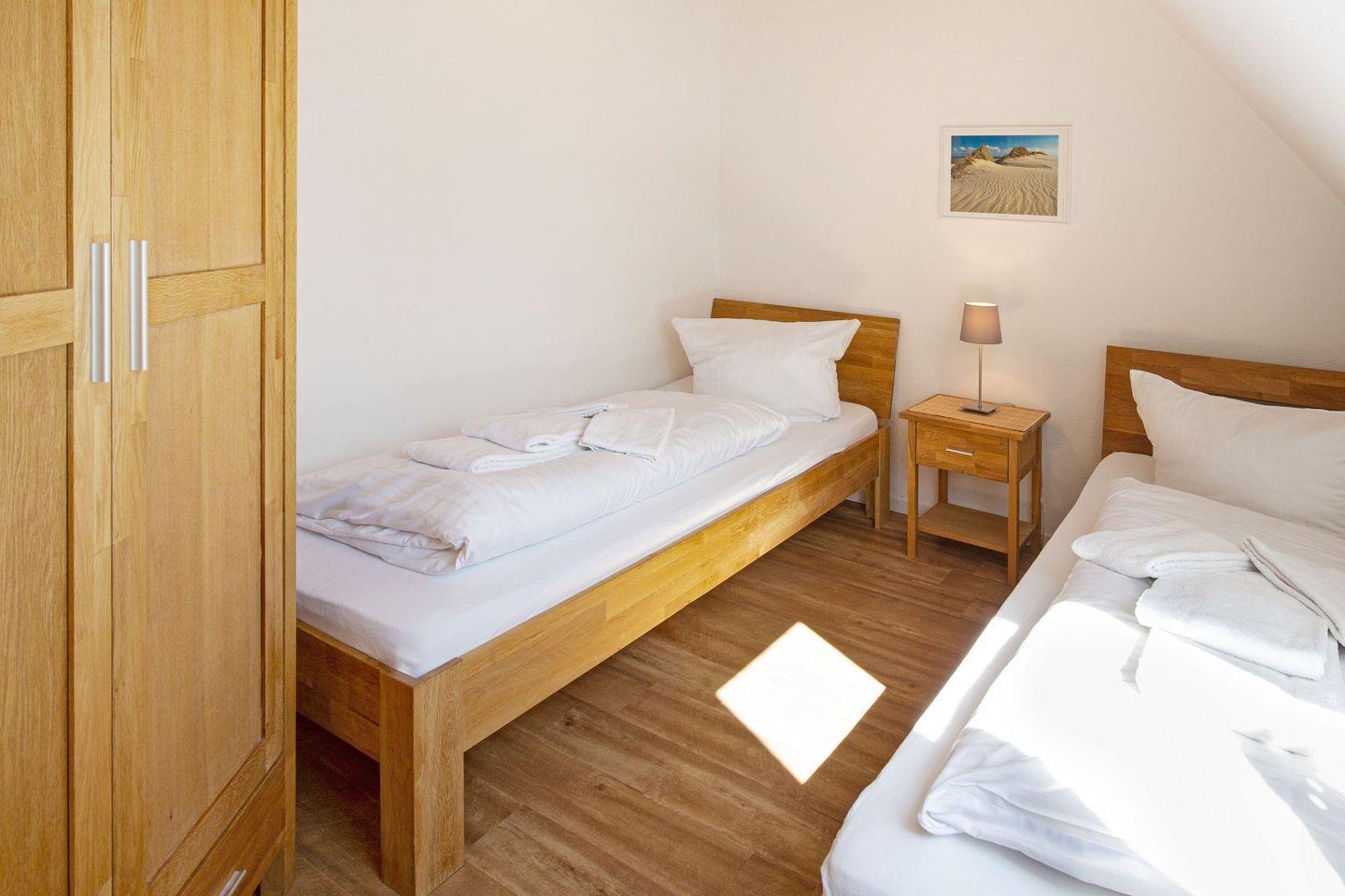 Im 1. Obergeschoss befindet sich die Küche, ein Schlafzimmer mit zwei Einzelbetten, das Ess- und Wohnzimmer, die separate Gästetoilette sowie das Badezimmer mit großer Dusche.