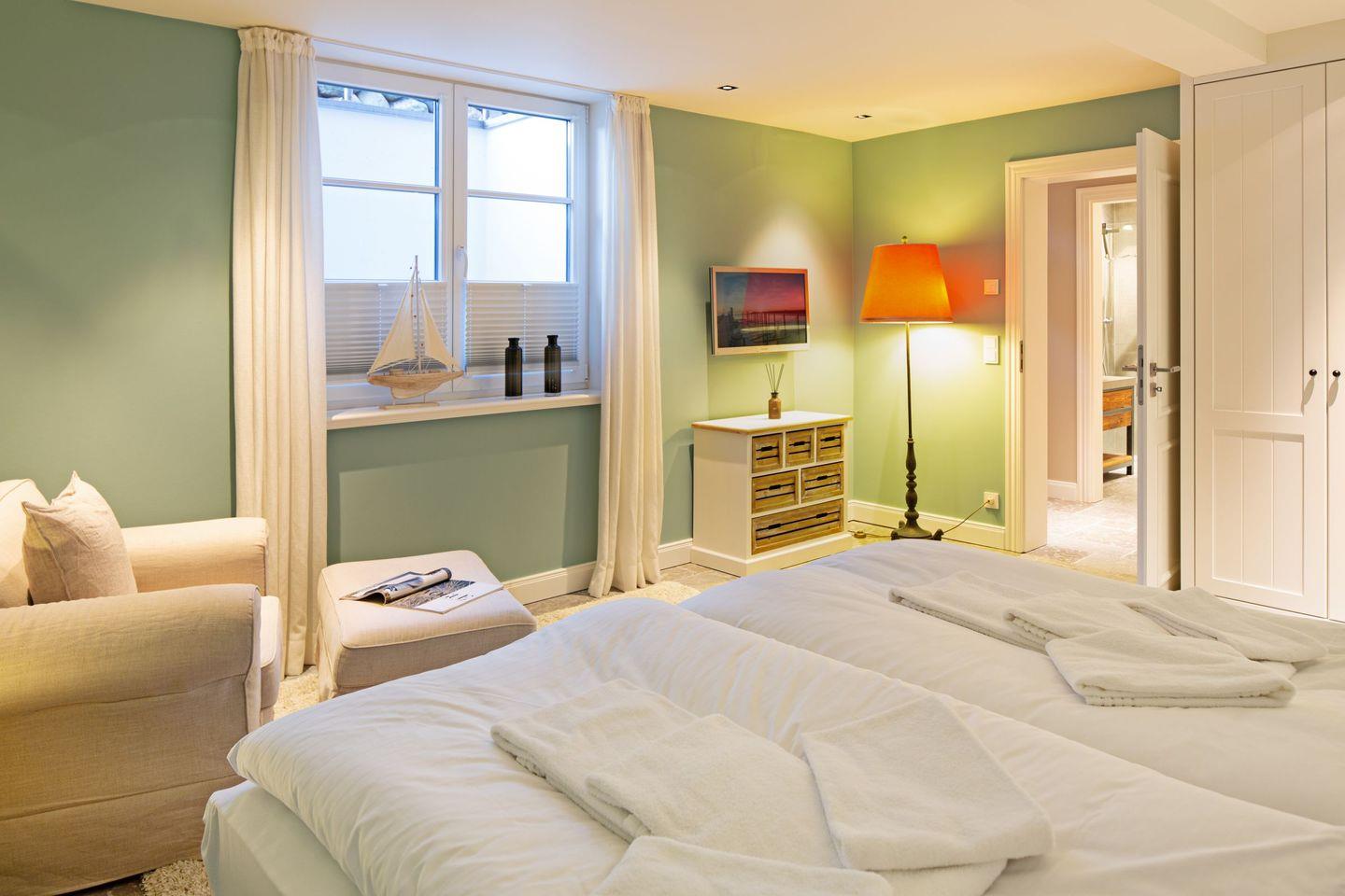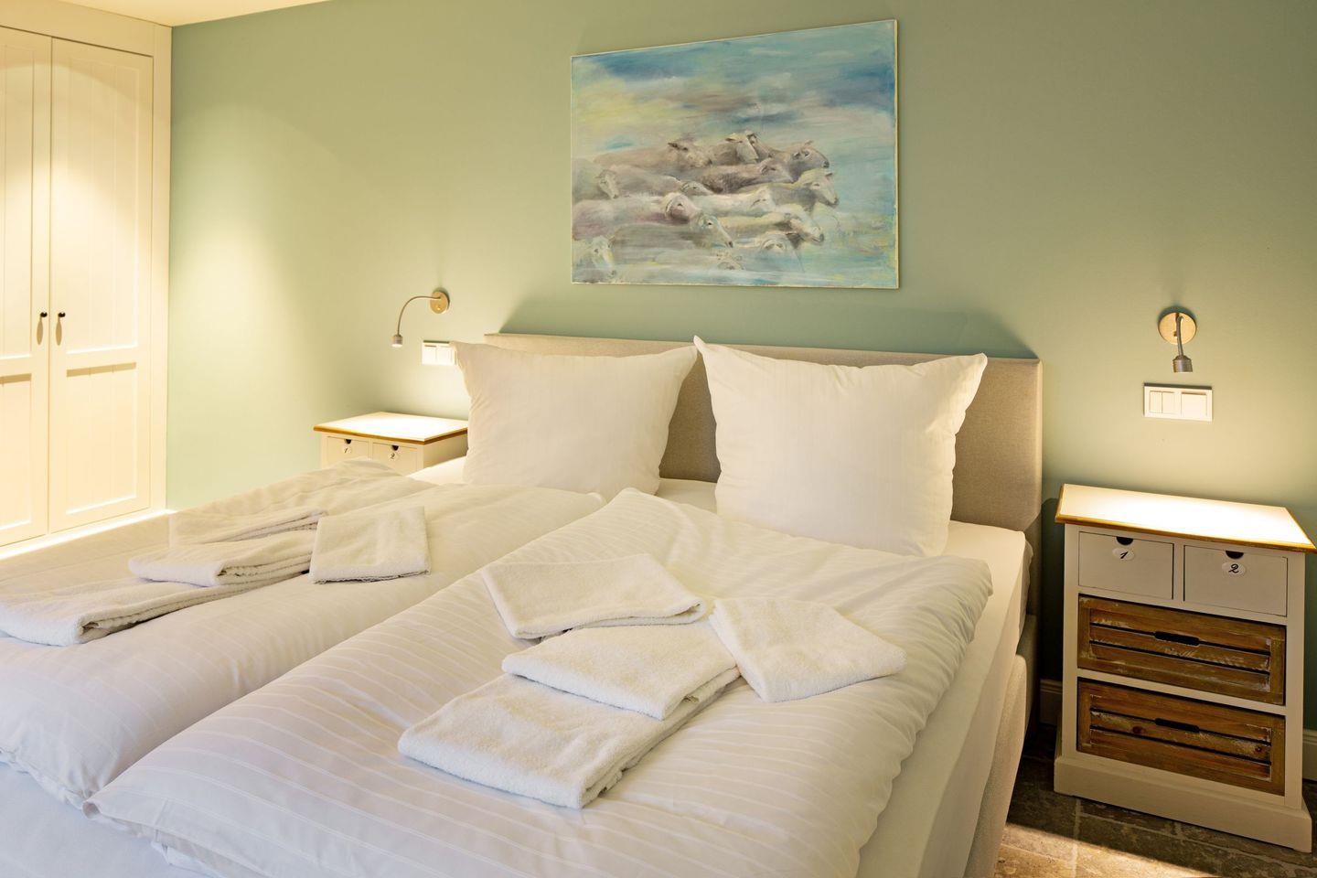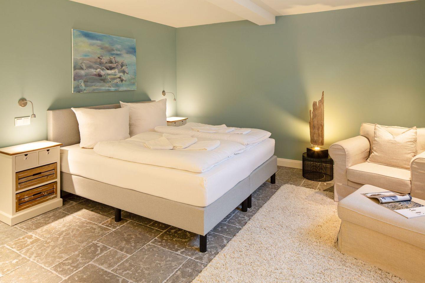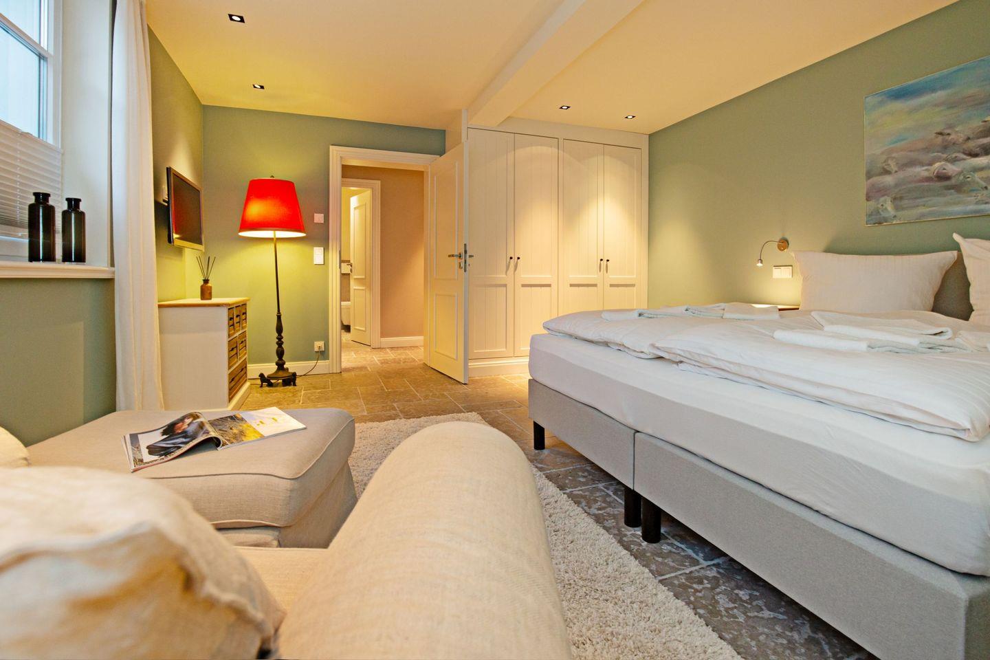 Das dritte Schlafzimmer mit Boxspringbett (Doppelbett) und einem Badezimmer befindet sich im Souterrain.