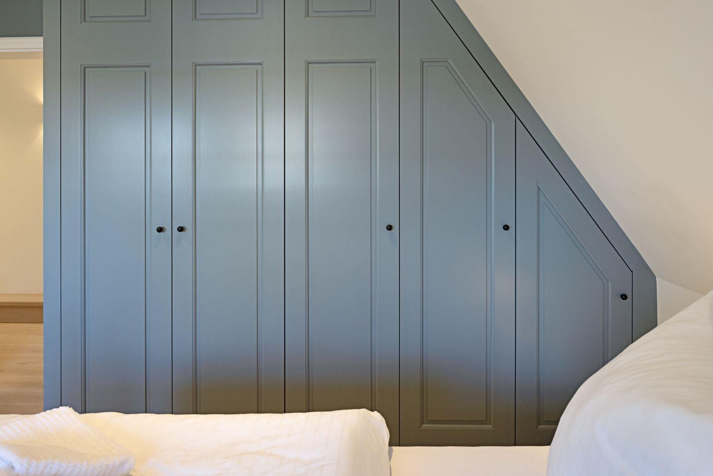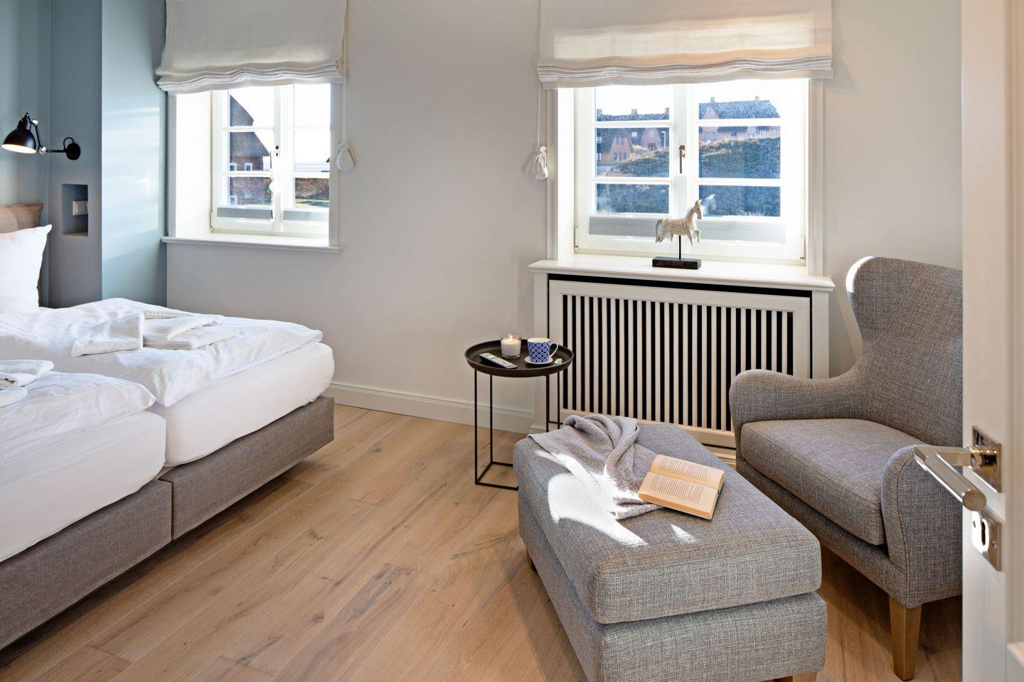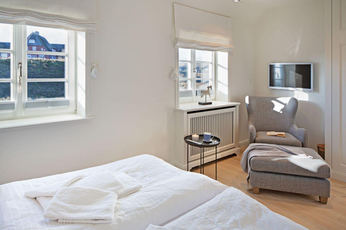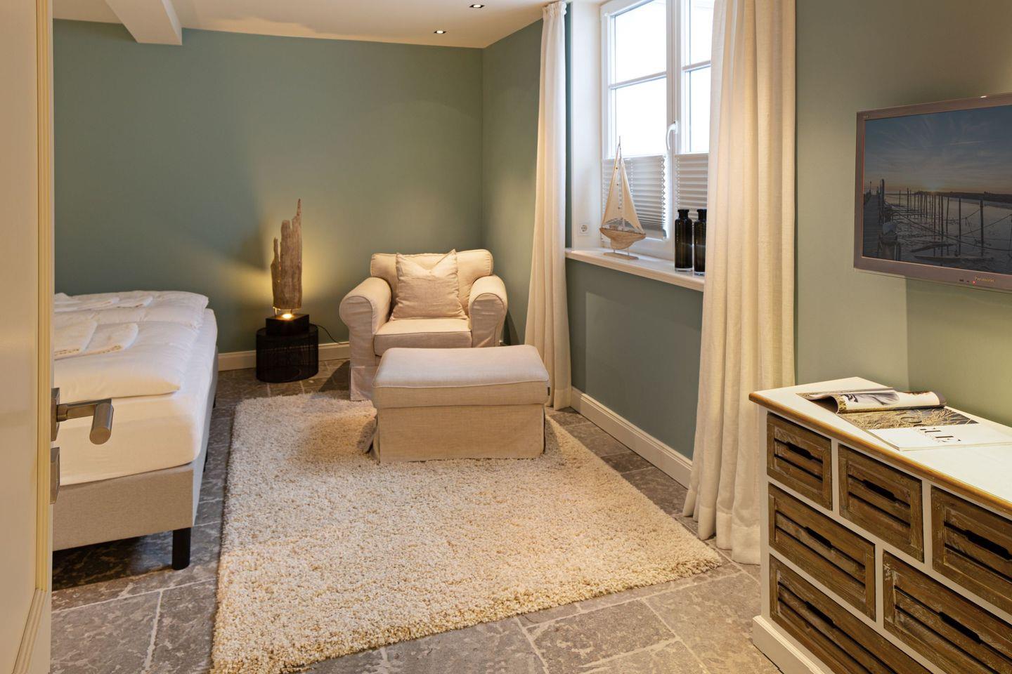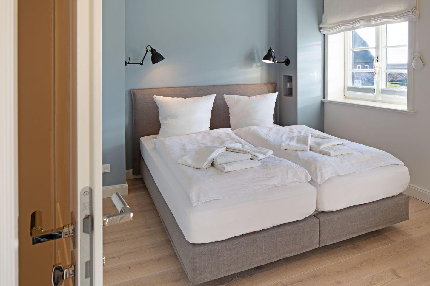 Das dritte Schlafzimmer mit Boxspringbett (Doppelbett) und einem Badezimmer befindet sich im Souterrain.
