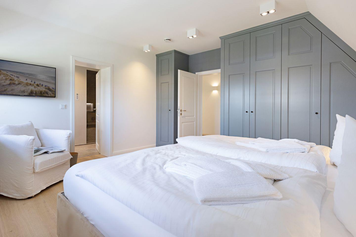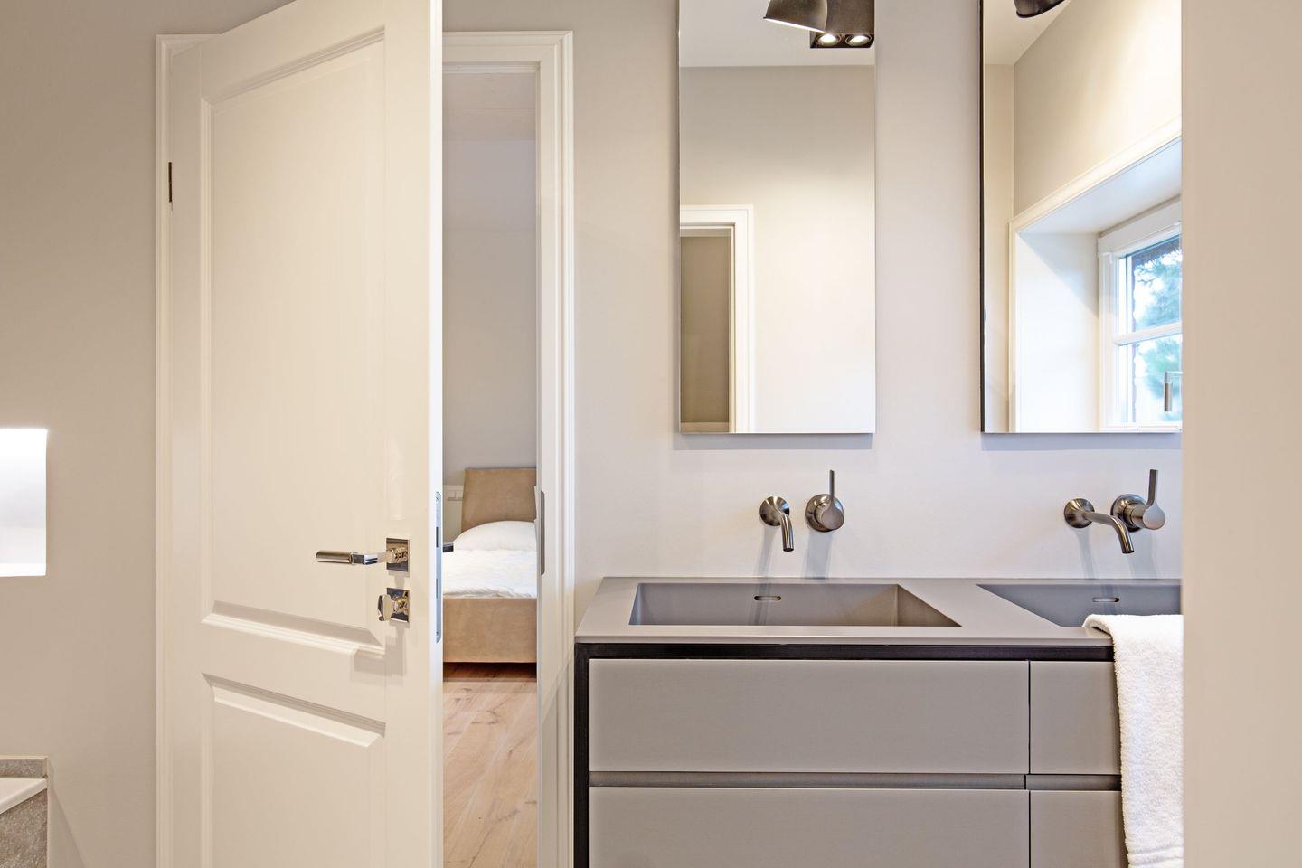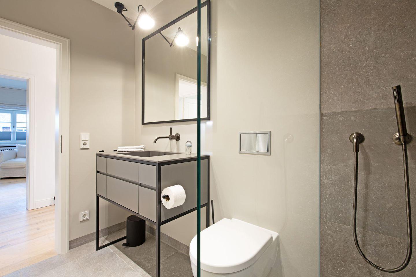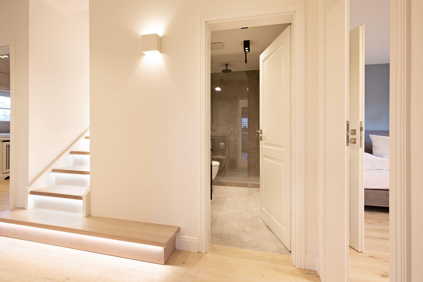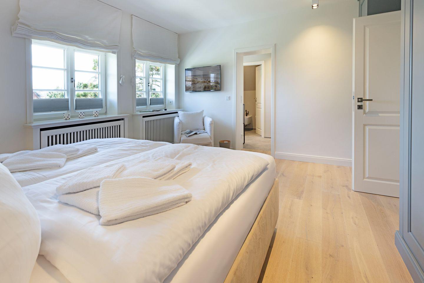 Ein Gäste-WC ist ebenfalls im Erdgeschoss zu finden. Zwei Schlafzimmer mit Boxspringbetten (Doppelbetten) und zwei Bad en Suite finden Sie im 1. OG.