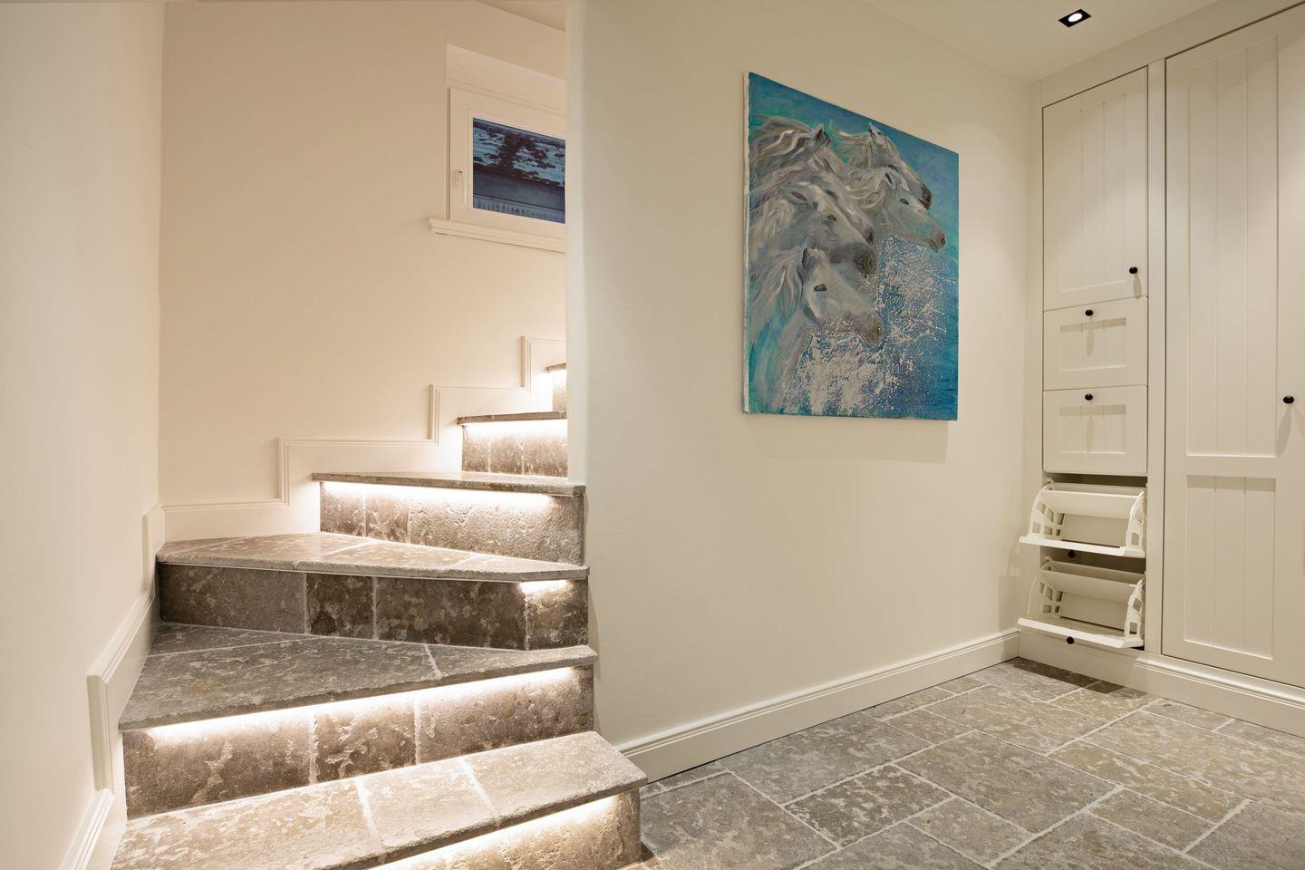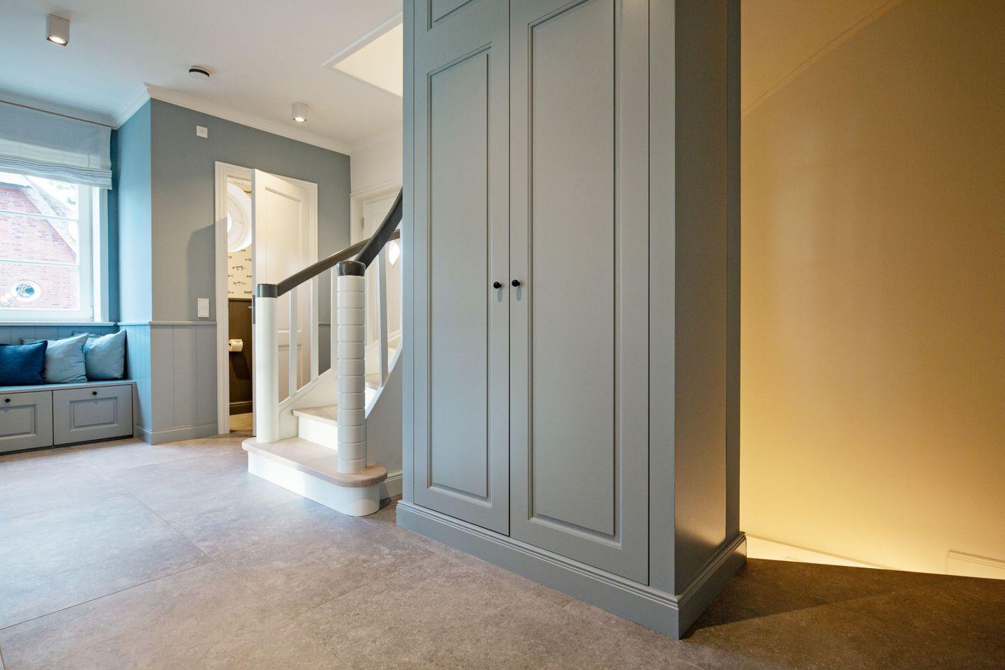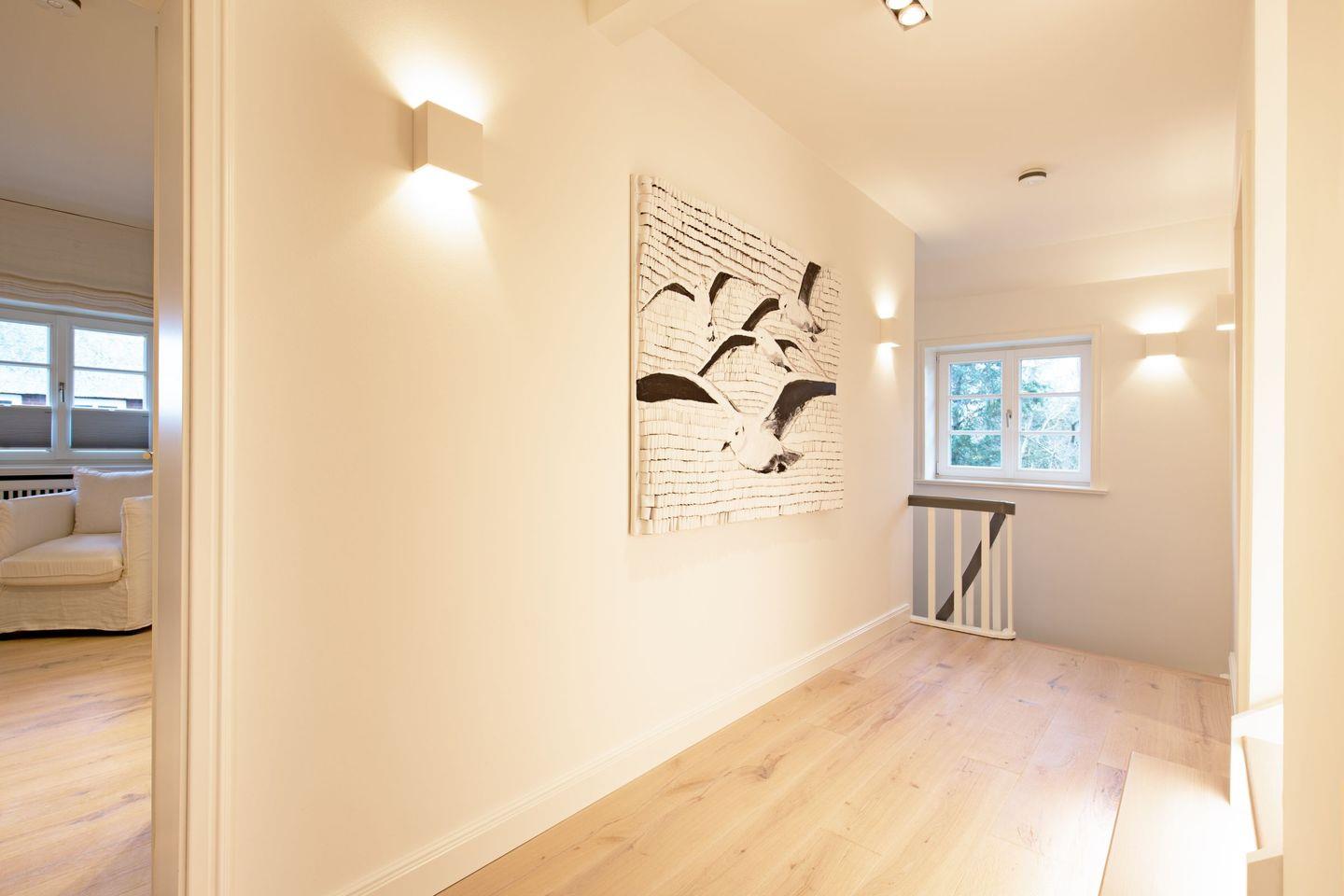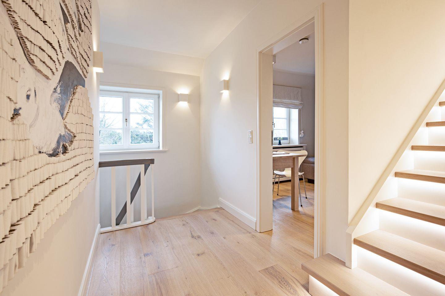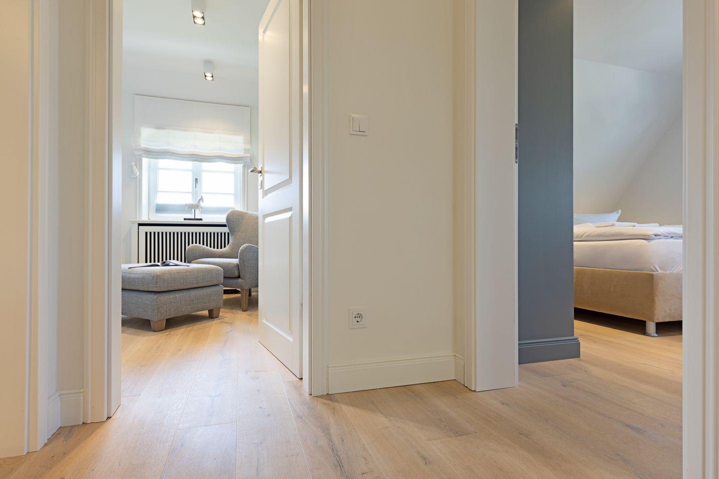 Ein Gäste-WC ist ebenfalls im Erdgeschoss zu finden. Zwei Schlafzimmer mit Boxspringbetten (Doppelbetten) und zwei Bad en Suite finden Sie im 1. OG.