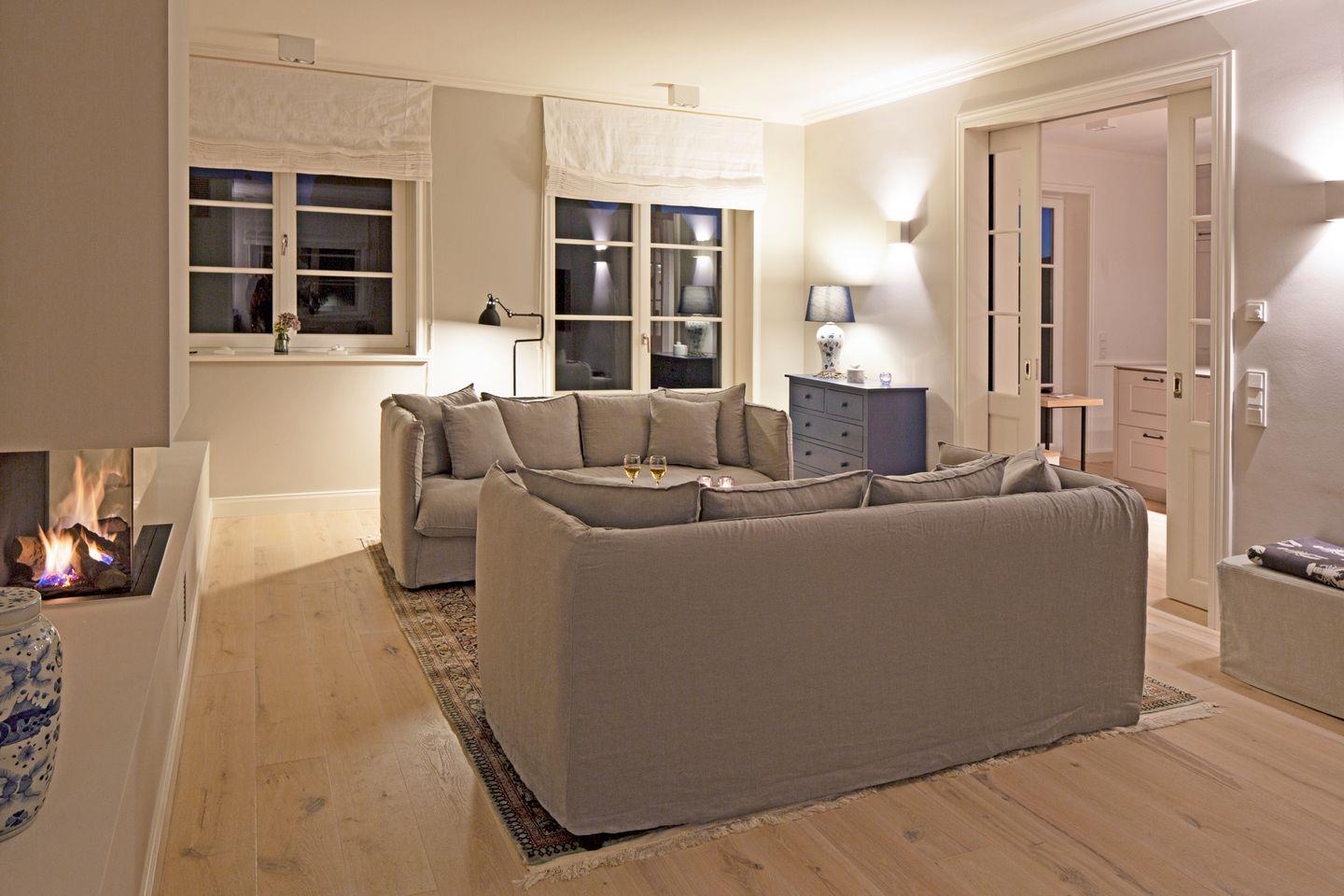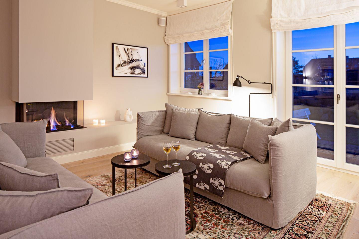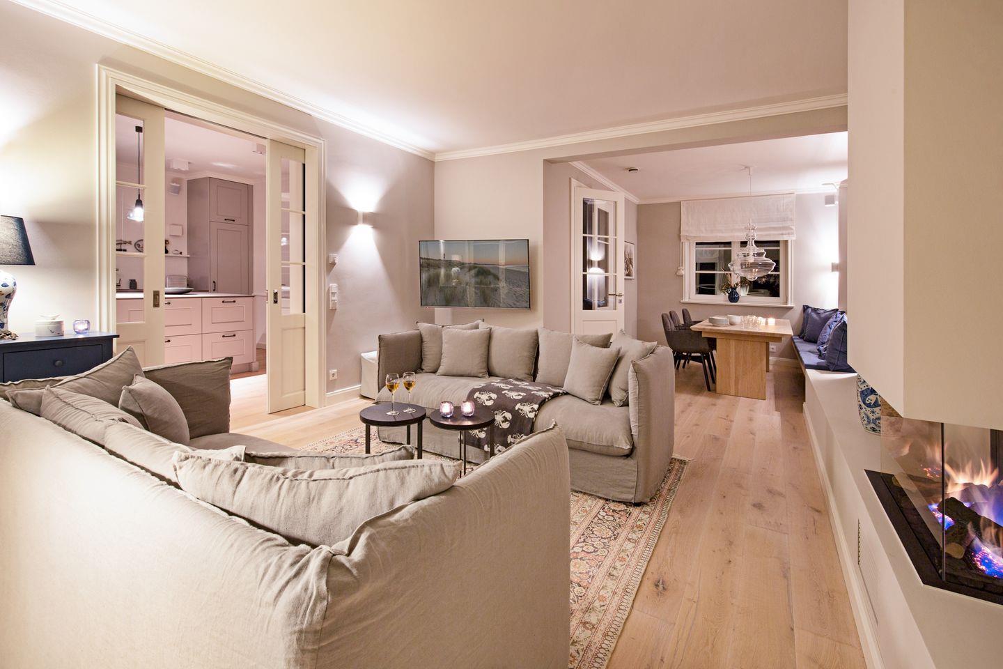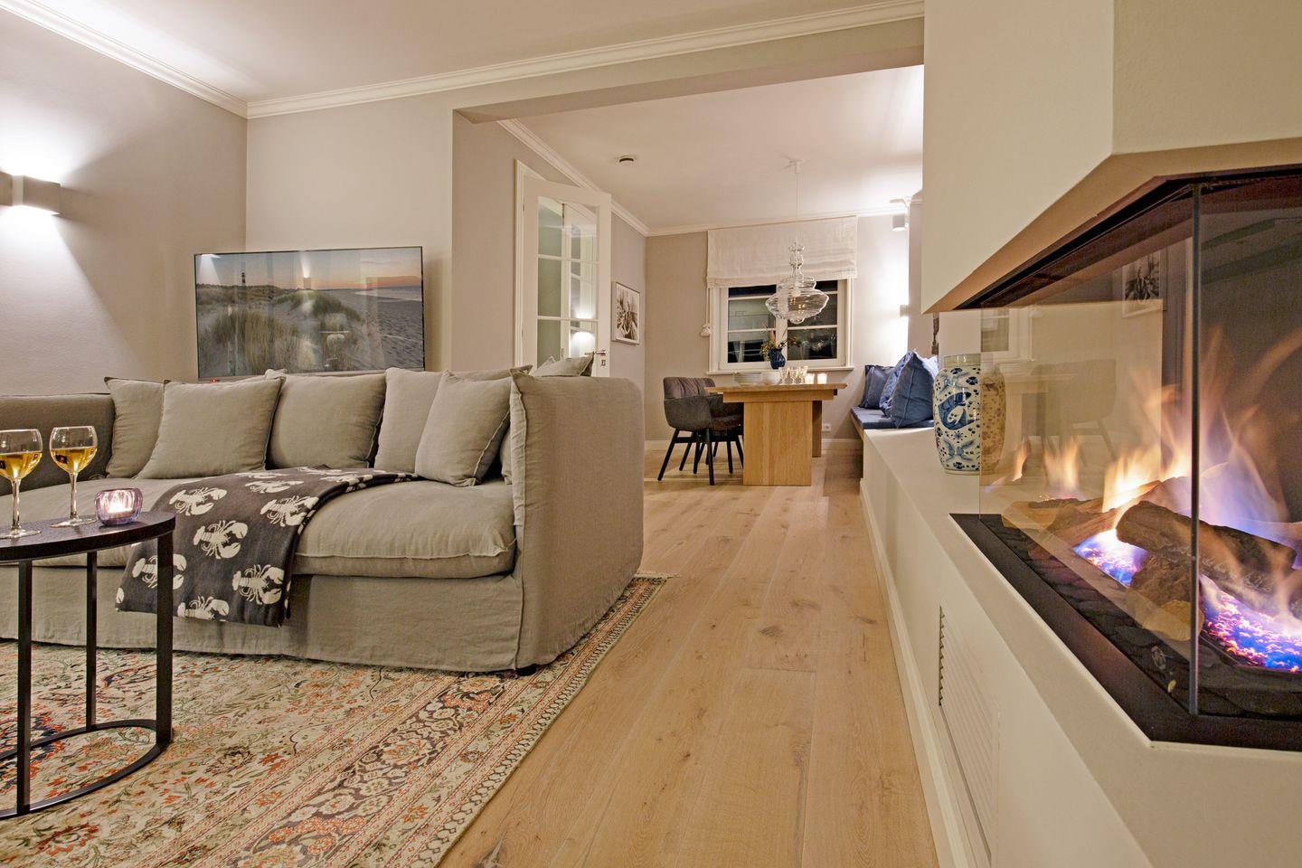 Luxuriöses familienfreundliches Doppelhaus für bis zu sechs Personen mit Dampfbad, Kamin, Garten und Terrasse in Strandnähe.
