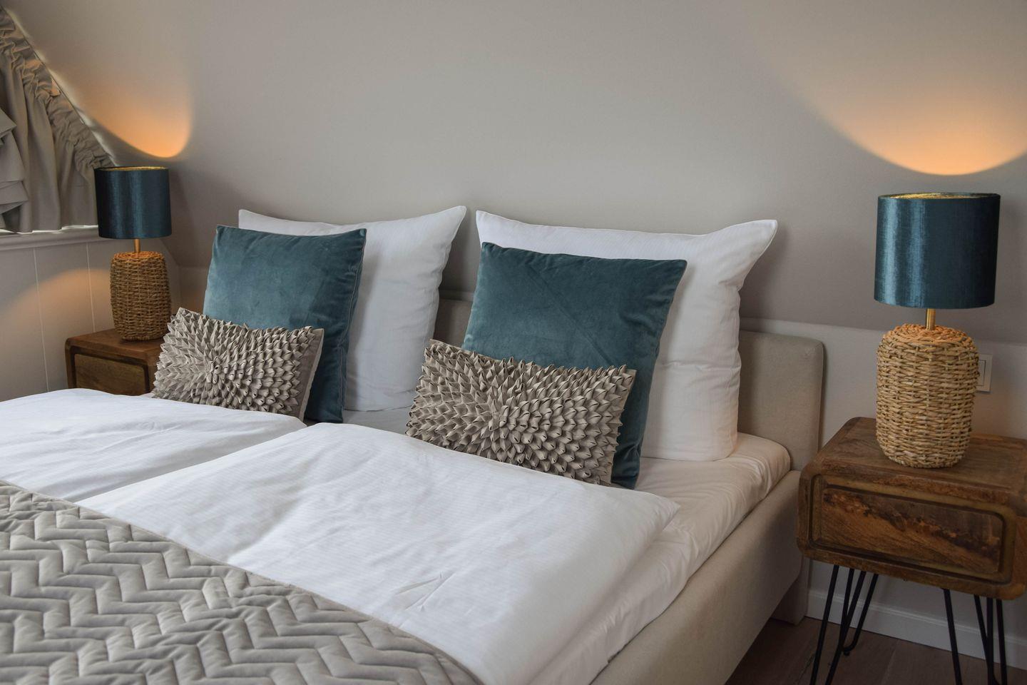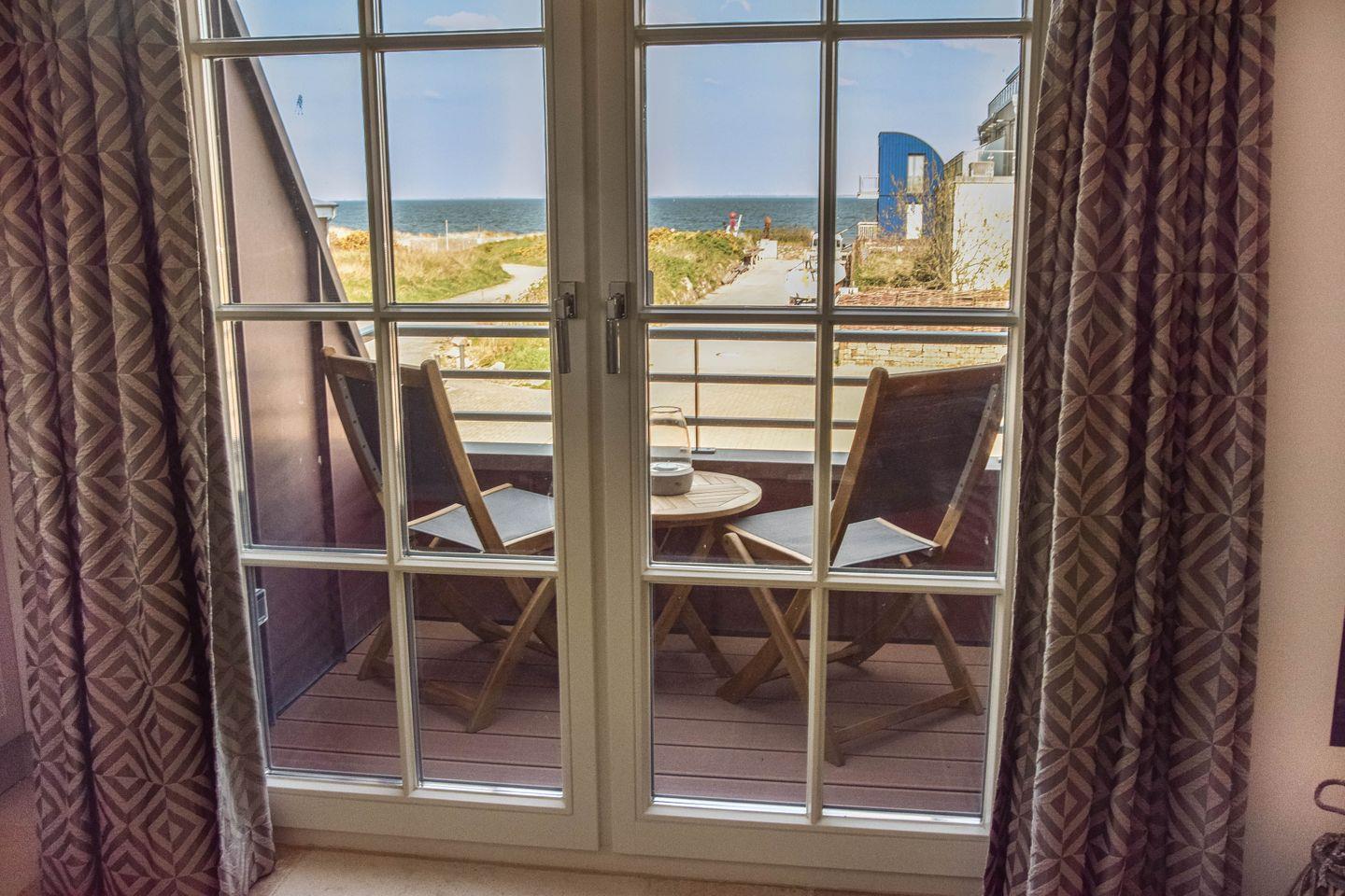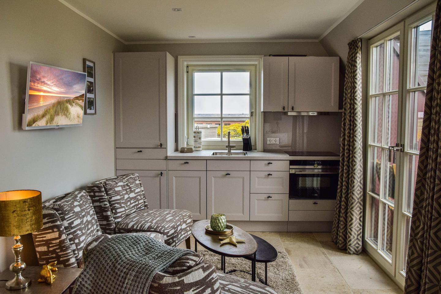 Diese exklusive Maisonette-Ferienwohnung für vier Personen ist nur einen Steinwurf vom Strand des Lister Beckens entfernt: Mit zwei Schlafzimmern und zwei Bädern bietet sie den idealen Rahmen für Ihren rundum relaxten Familienurlaub. Natürlich gibt es schnelles WLAN und TV in jedem Raum, aber – wetten? – die meiste Zeit werden Sie fasziniert nach draußen blicken. Das große Panoramafenster im Kapitänsgiebel legt Ihnen die See vor List zu Füßen. Selbst ins himmlisch bequeme Bett begleiten Sie das Meer und die Gezeiten; von einem der Schlafzimmer können Sie sogar aufs Ellenbogenbecken schauen. Und natürlich genießen Sie auch auf Ihrer privaten Sonnenloggia zum Soundtrack von Möwen und Wellenrauschen diese hinreißende Aussicht.